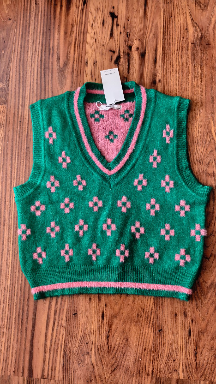 Bez poškodení a fľakov, zeleno ružová farba, nestihli sme ponosiť, šírka 46cm, dĺžka 48cm.
