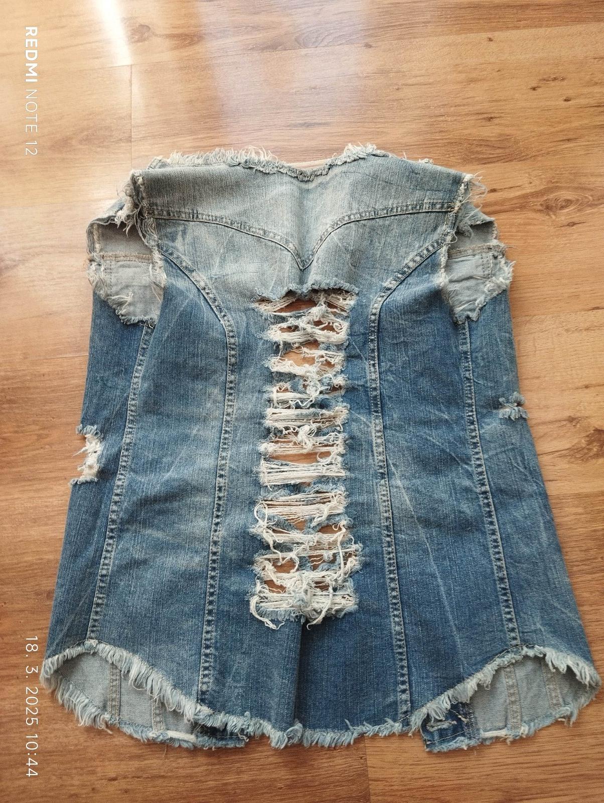 Krásna riflova vesta s aplikáciou v zadu super stav povod cena veľmi vysoká dlzka 60cm šírka prsia 48cm