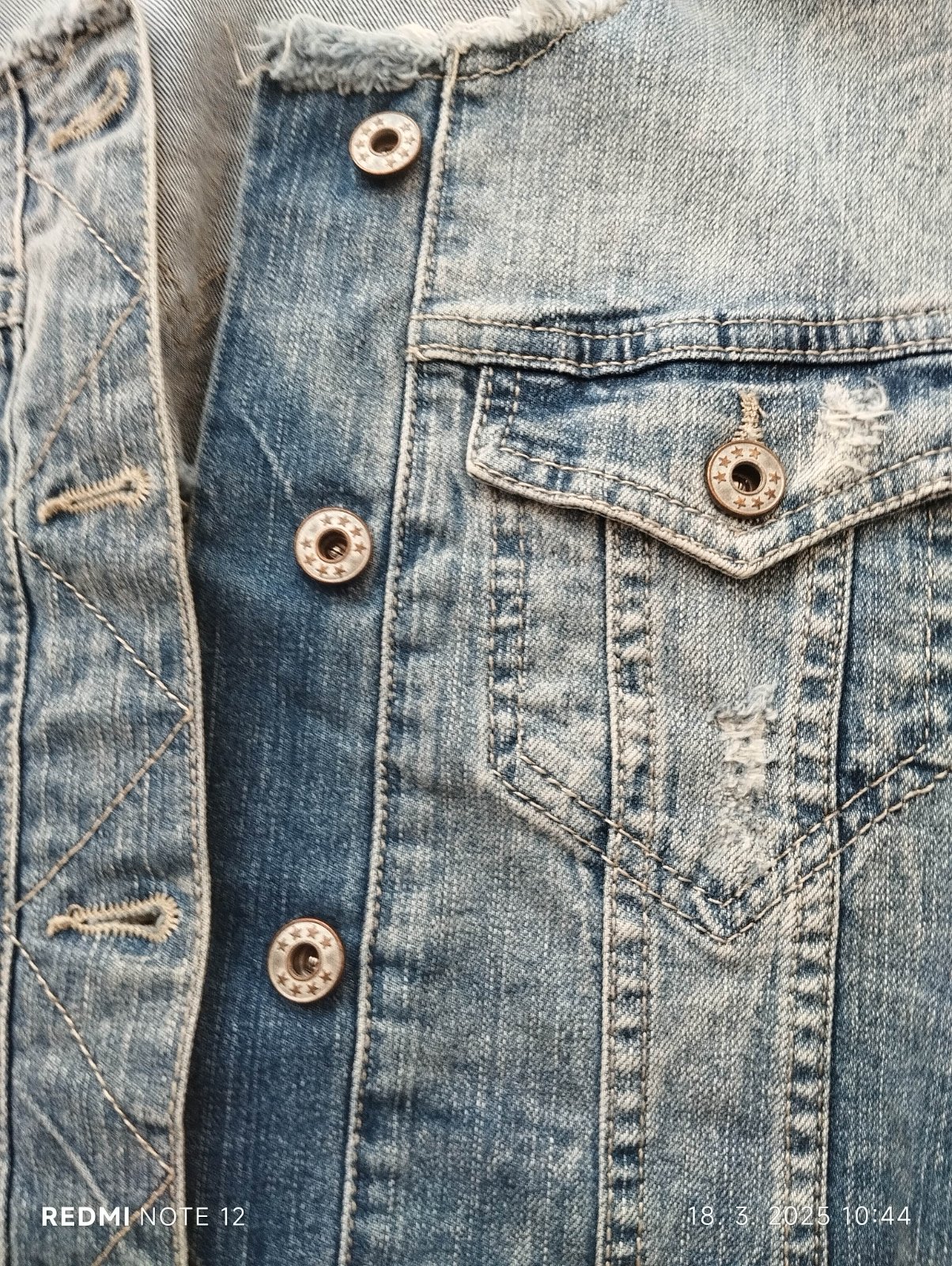 Predám peknú riflovú vestičku, asi raz oblečenú, bez poškodenia, veľkosť M, cena 3 eurá plus poštovné.