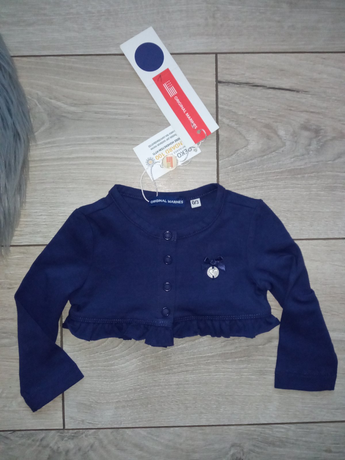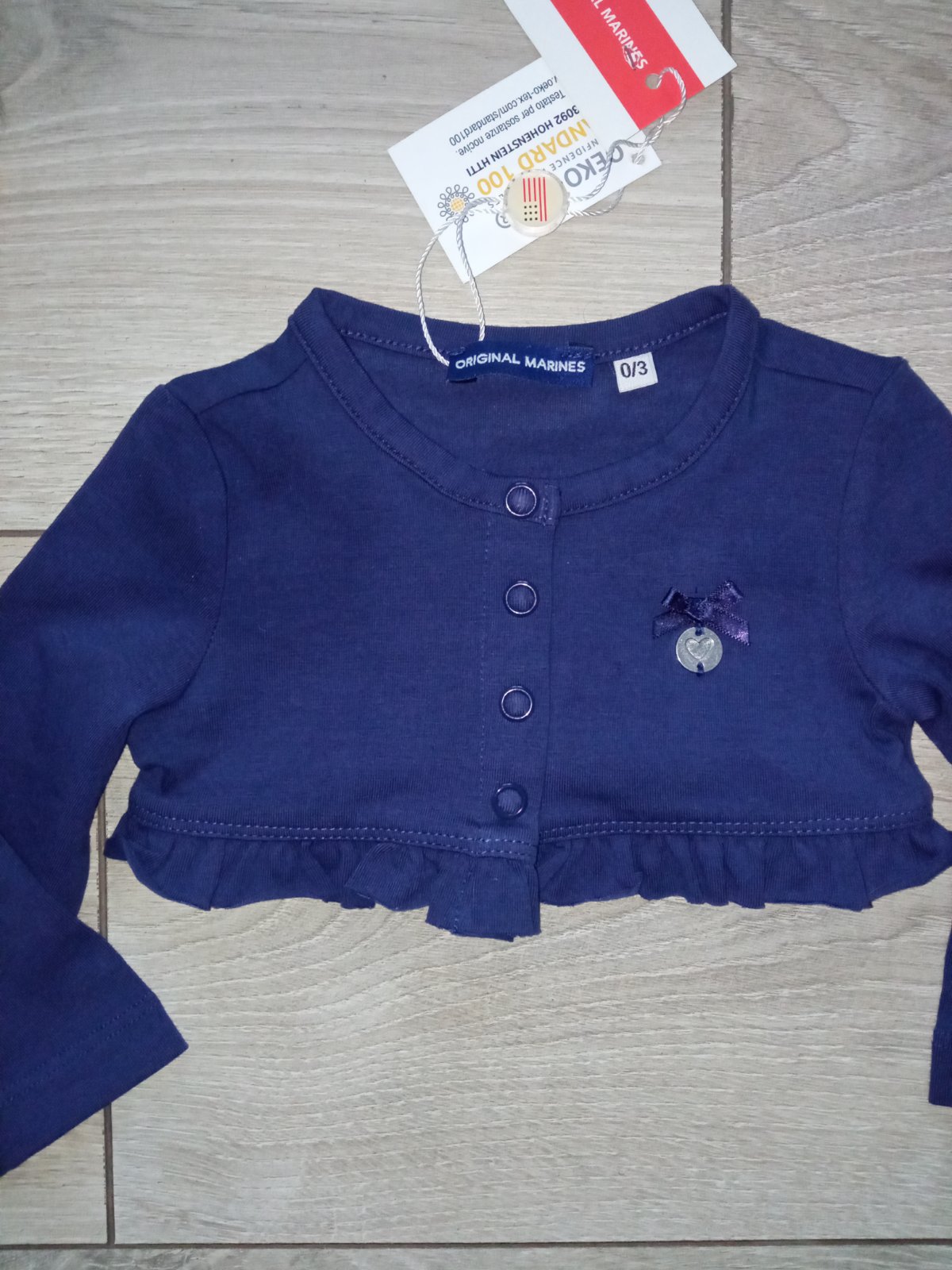 Dievčenské bolerko dlhý rukáv s volánom, značky Original Marines, predné zapínanie na cvoky, jednofarebné, okrúhly výstrih, farba tmavomodrá.