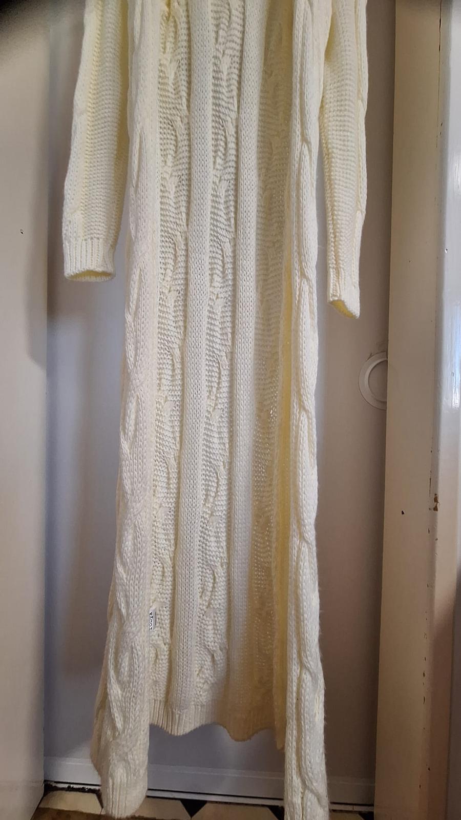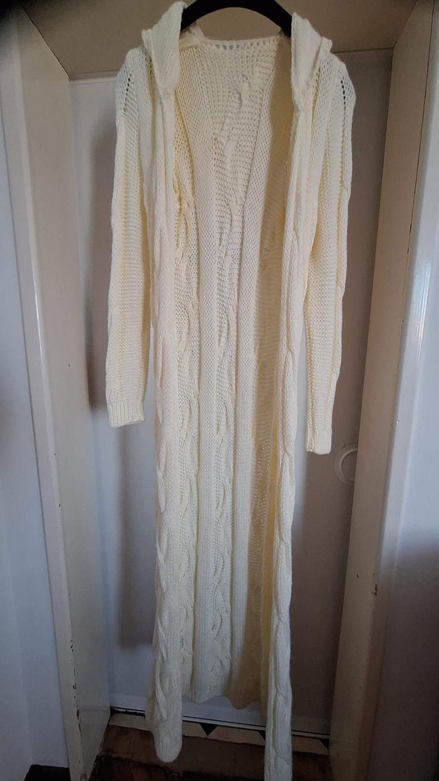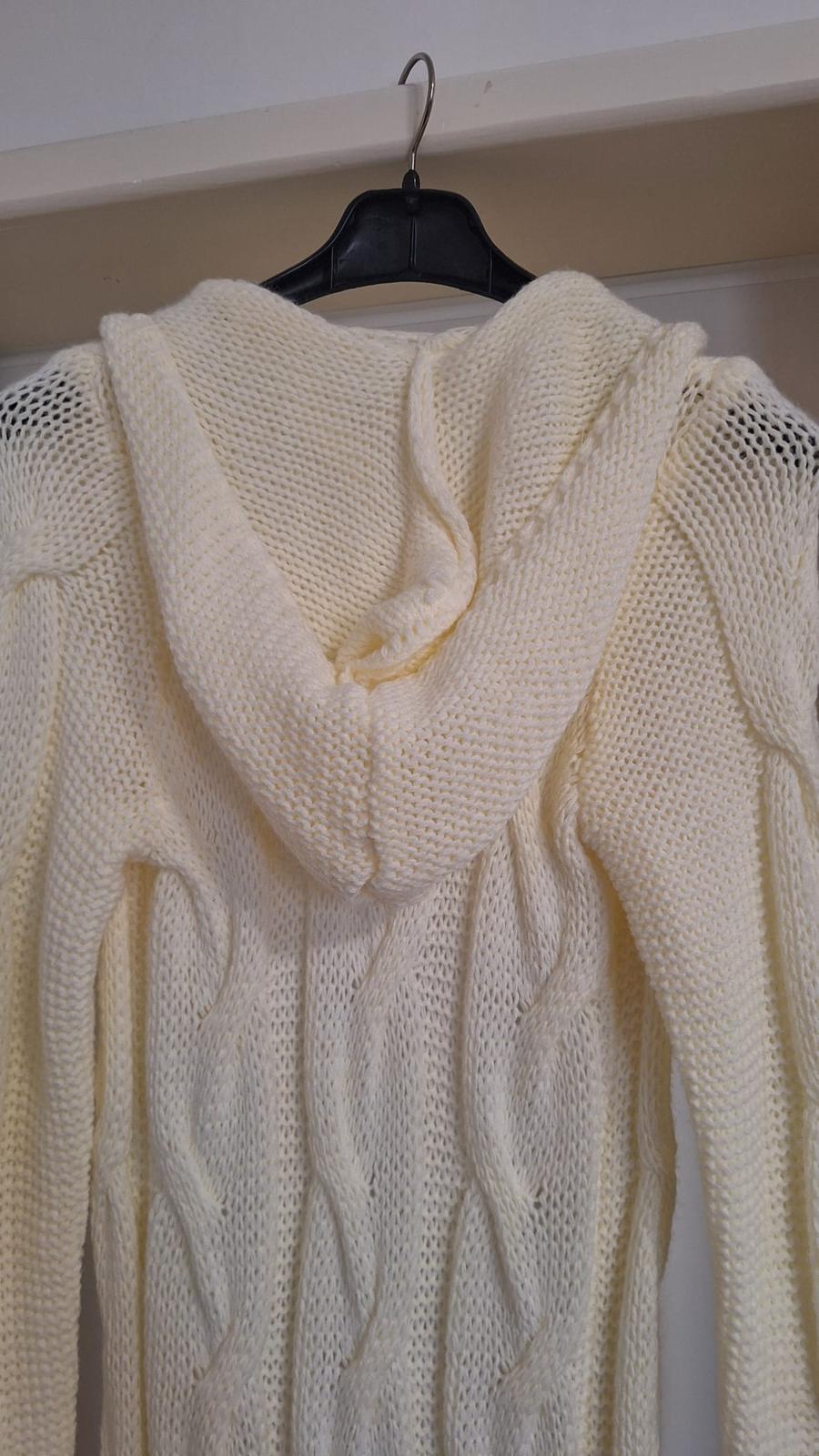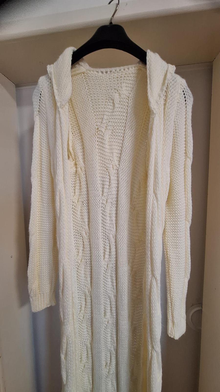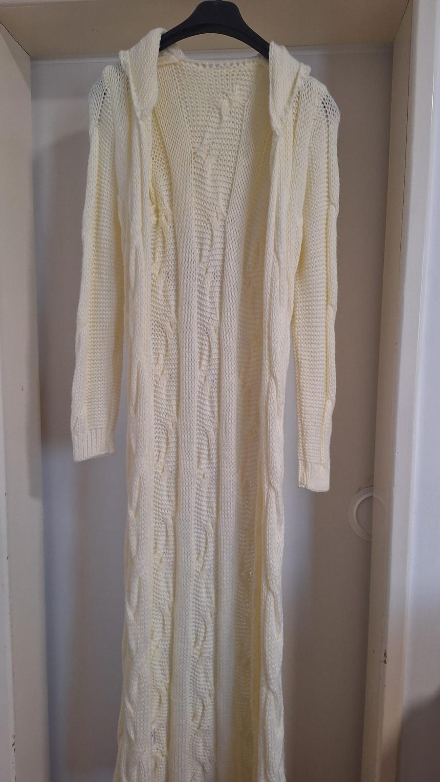 Dlhý sveter-kardigan, s kapucou, bez zapínania, celková dĺžka 155 cm, bez poškodenia, top stav