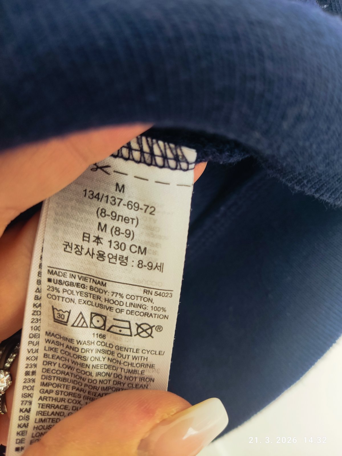 Veľmi pekná mikina, veľmi dobrý stav, až na jednu dierku na rukáve, šikovná maminka si to pekne opraví.