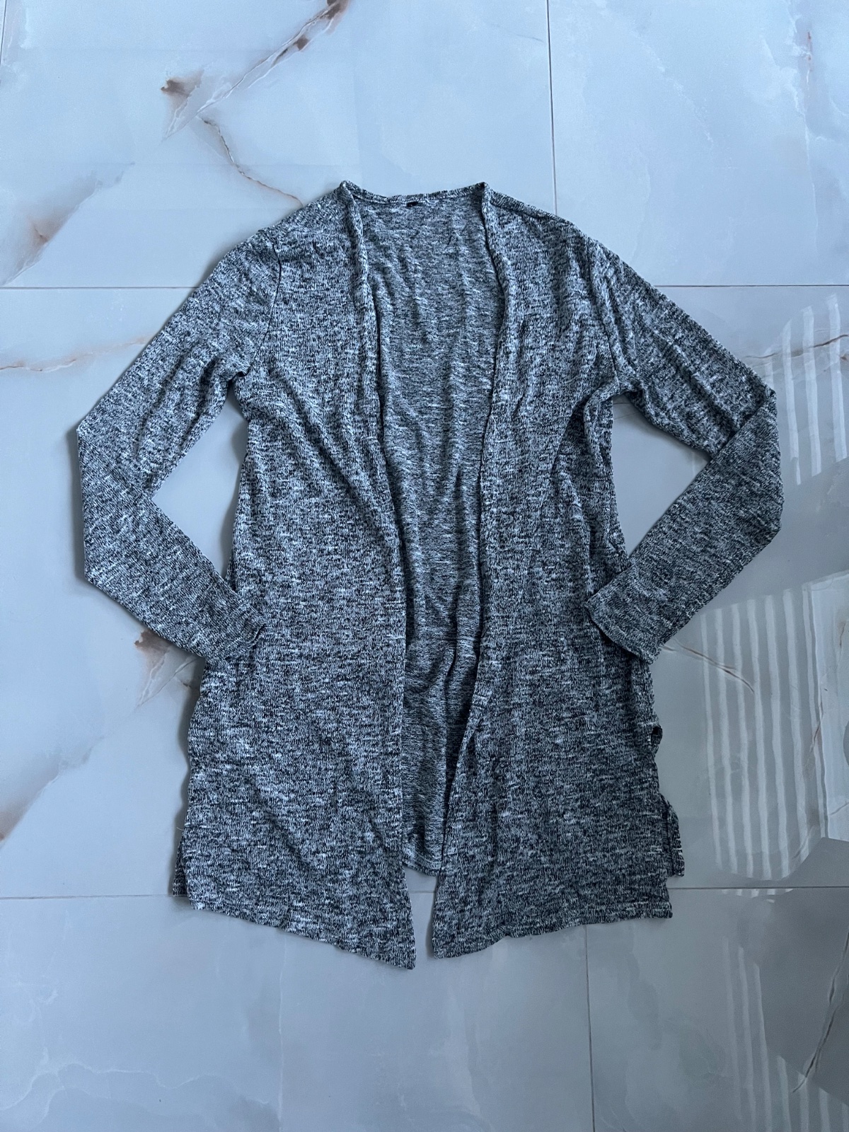 Predam sivy tenky kardigan, dlhy s rozparkami na bokoch.
