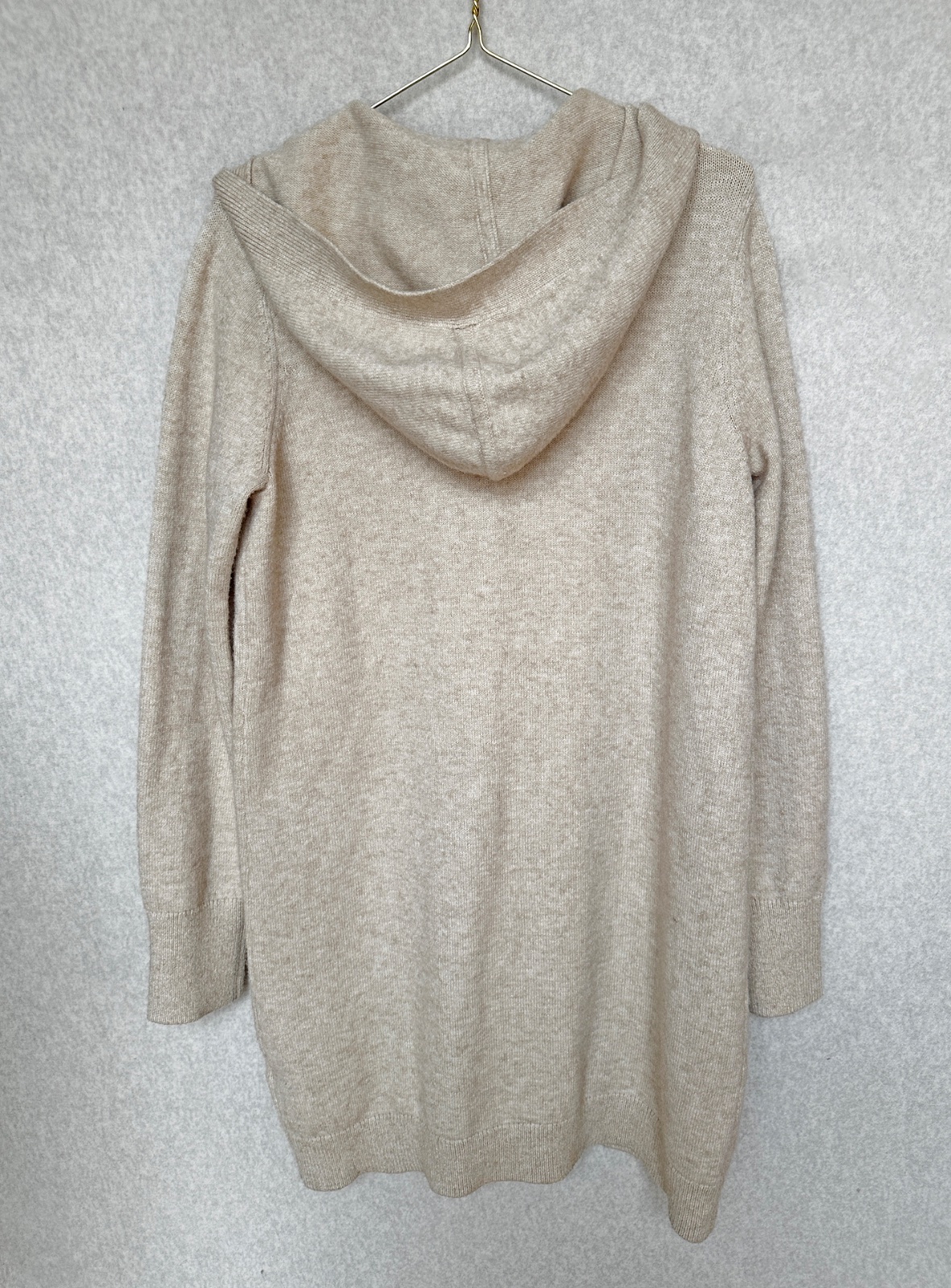 Dlhý kardigán s vreckami a kapucňou so zapínaním na gombíky. Príjemný, hebký materiál. Vo veľmi peknom stave, bez poškodení. Uvedená veľkosť XS, sedí XS - S. Pranie v pračke 30°C.