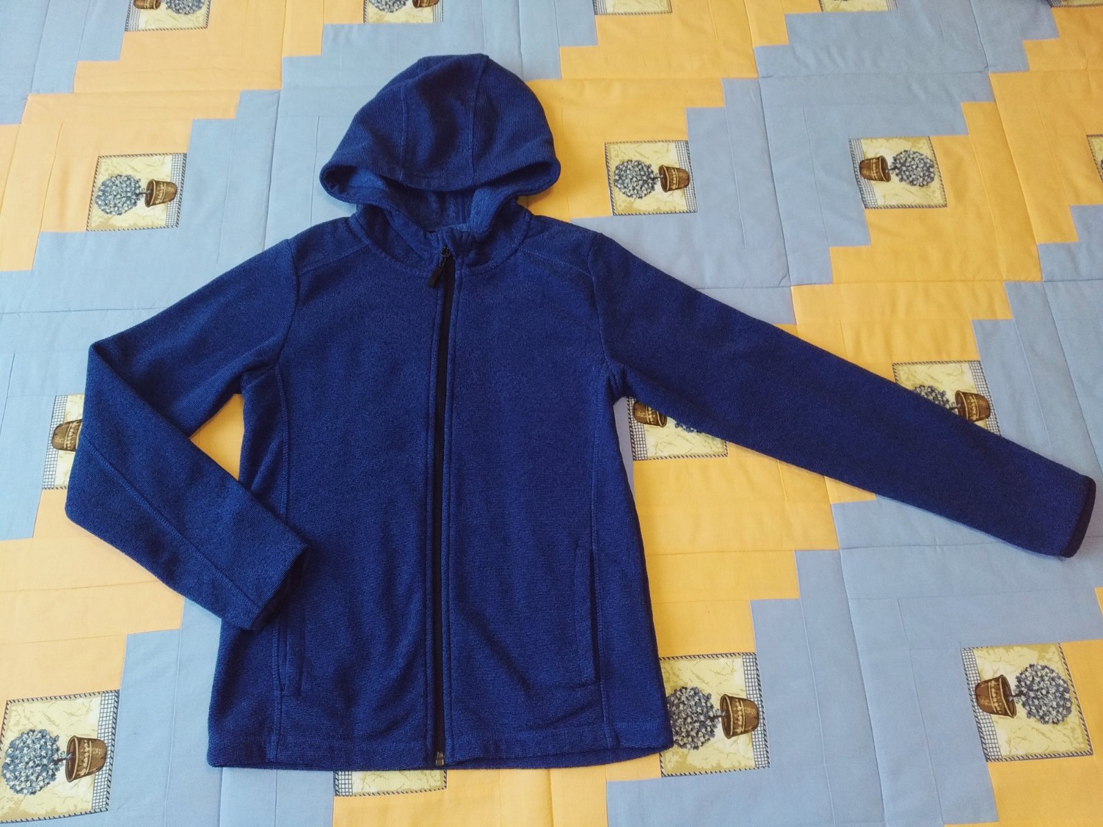 Nosená, tenšia flísová mikina, nosenie vidno na okrajoch rukávov a pri zipse pod krkoch, to zelené obšitie, zips funguje, vrecká nemá, na prednom dieli asi 1 MM dierka, bez fľakov, dĺžka 56 CM, ší...