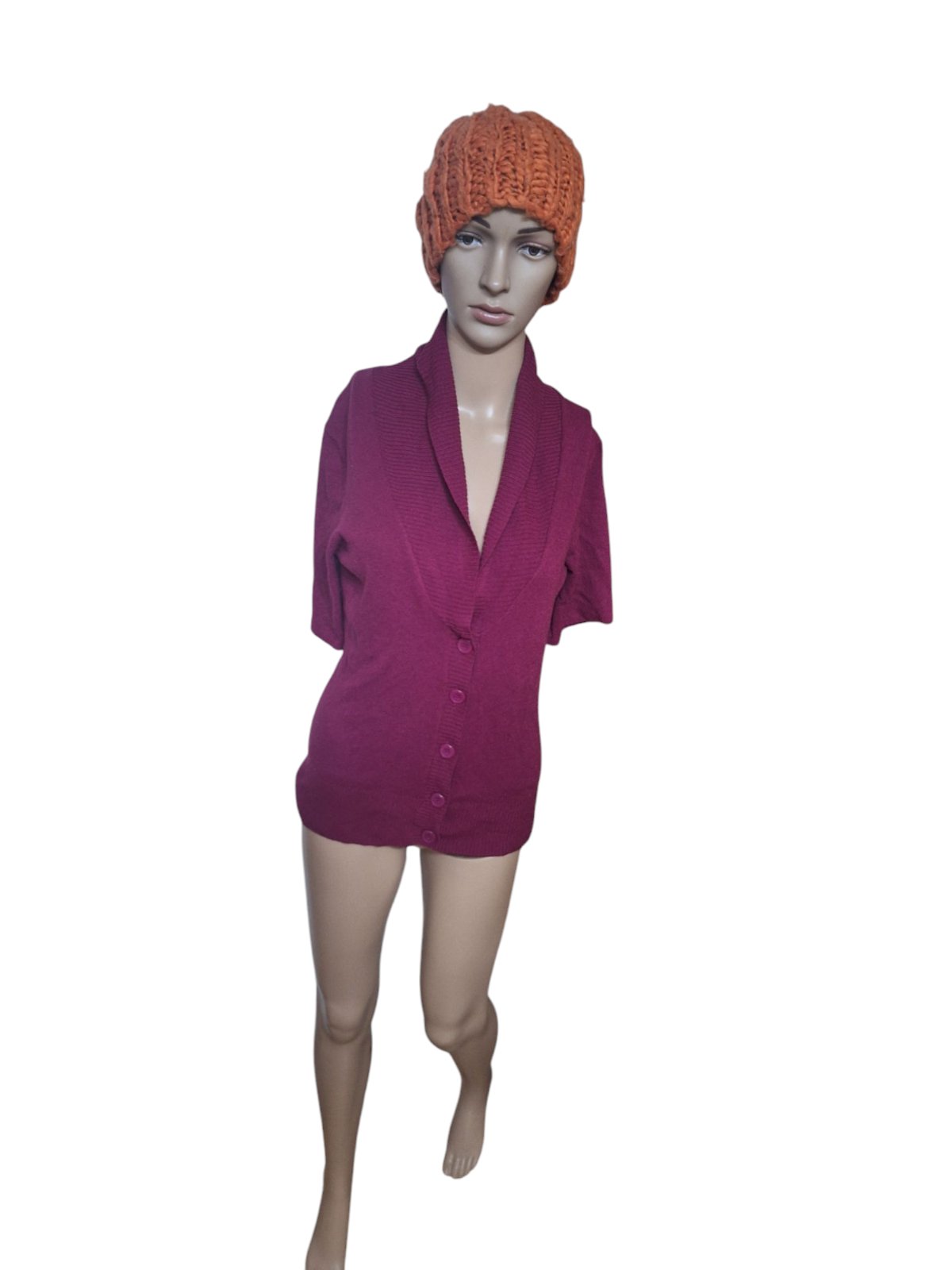 Dámsky cyklamenový značkový svetrík na zapínanie. Rukávy sú 3/4. Dĺžka je 60cm,obvod hrudníka je 78cm a obvod pása je 76cm. kód 1386