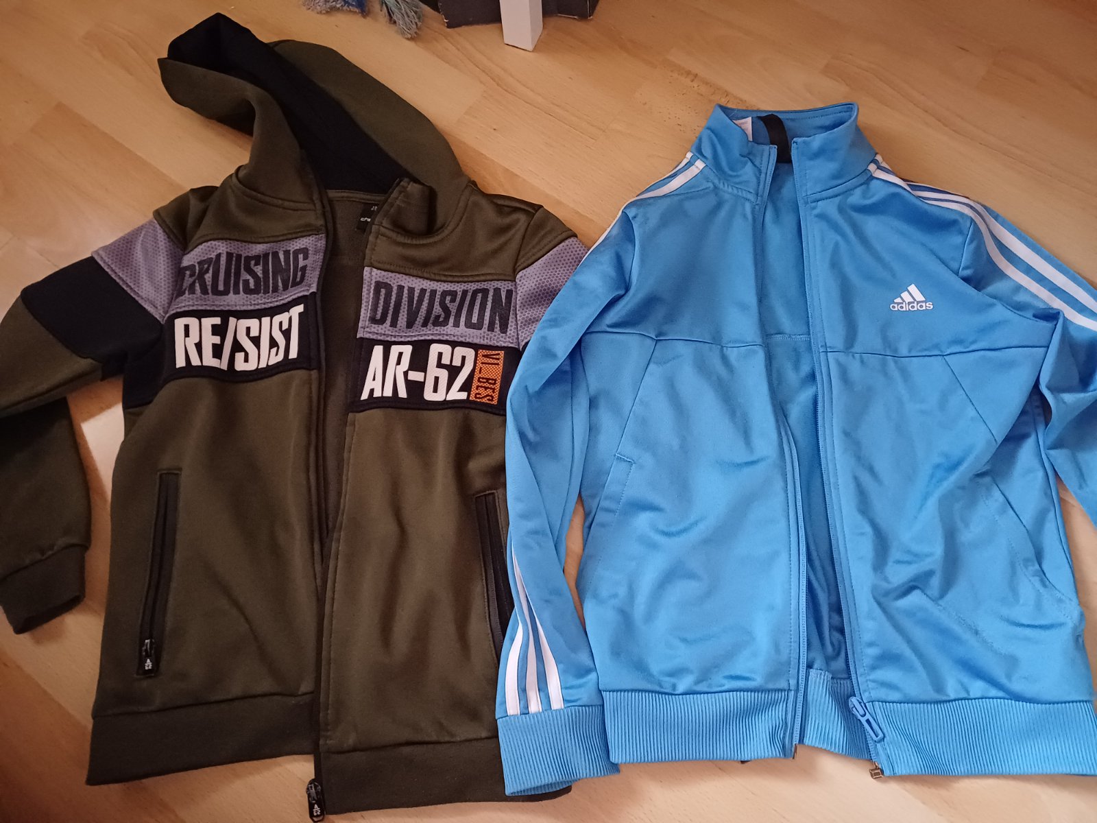 Obidve mikimy su z hladkeho športoveho materialu, Chapter Young 134/140 flak na rukave od farby, Adidas 9-10rokov =140, par malinkych slabuckych flakov