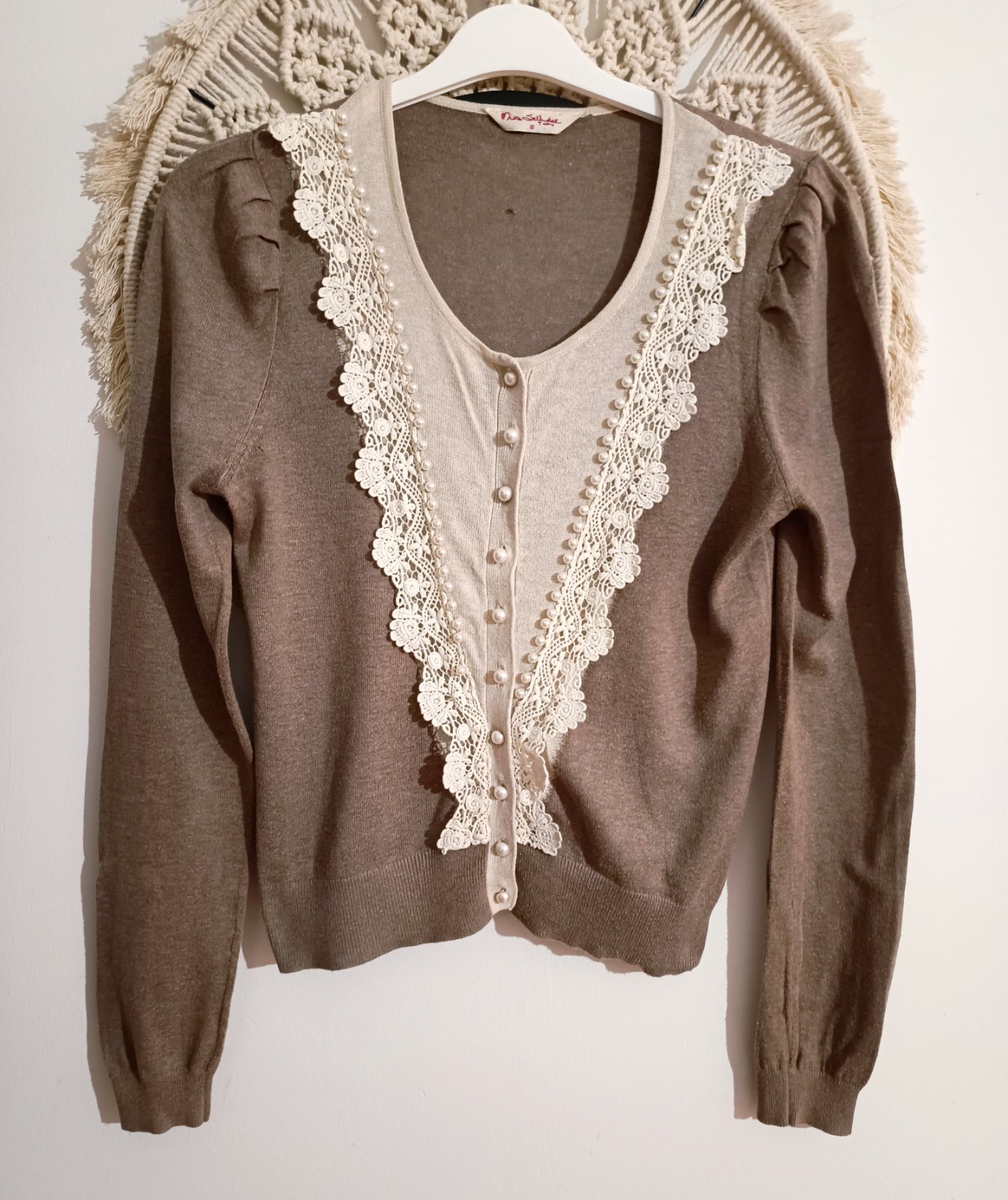 Predám hnedastý úpletový svetrík, prešívaný zlatou niťou, v. S/M. Zaujímavý priehľadný detail na ramenách. Cena: 2,30€ + poštovné. Na dobierku nezasielam!