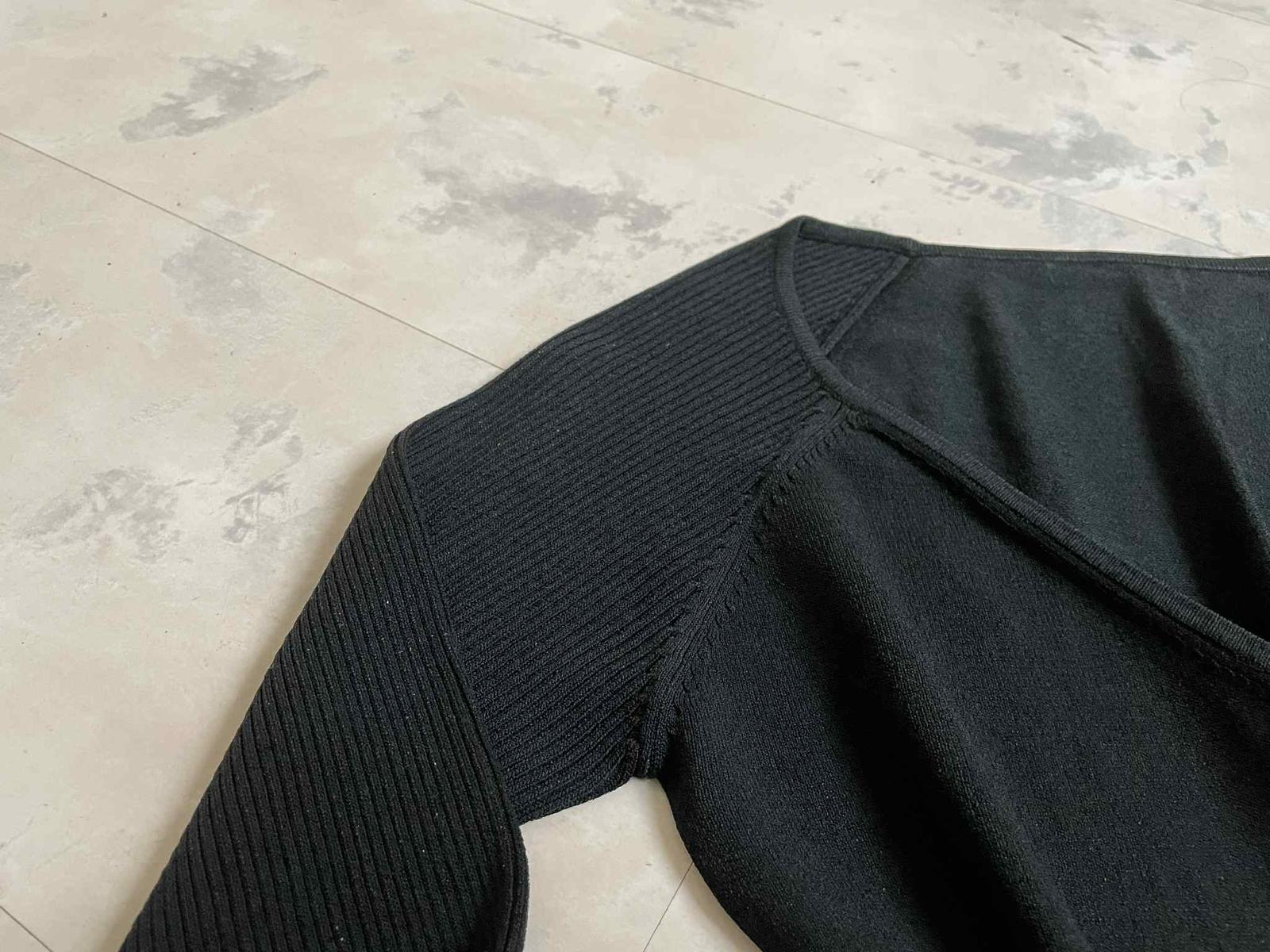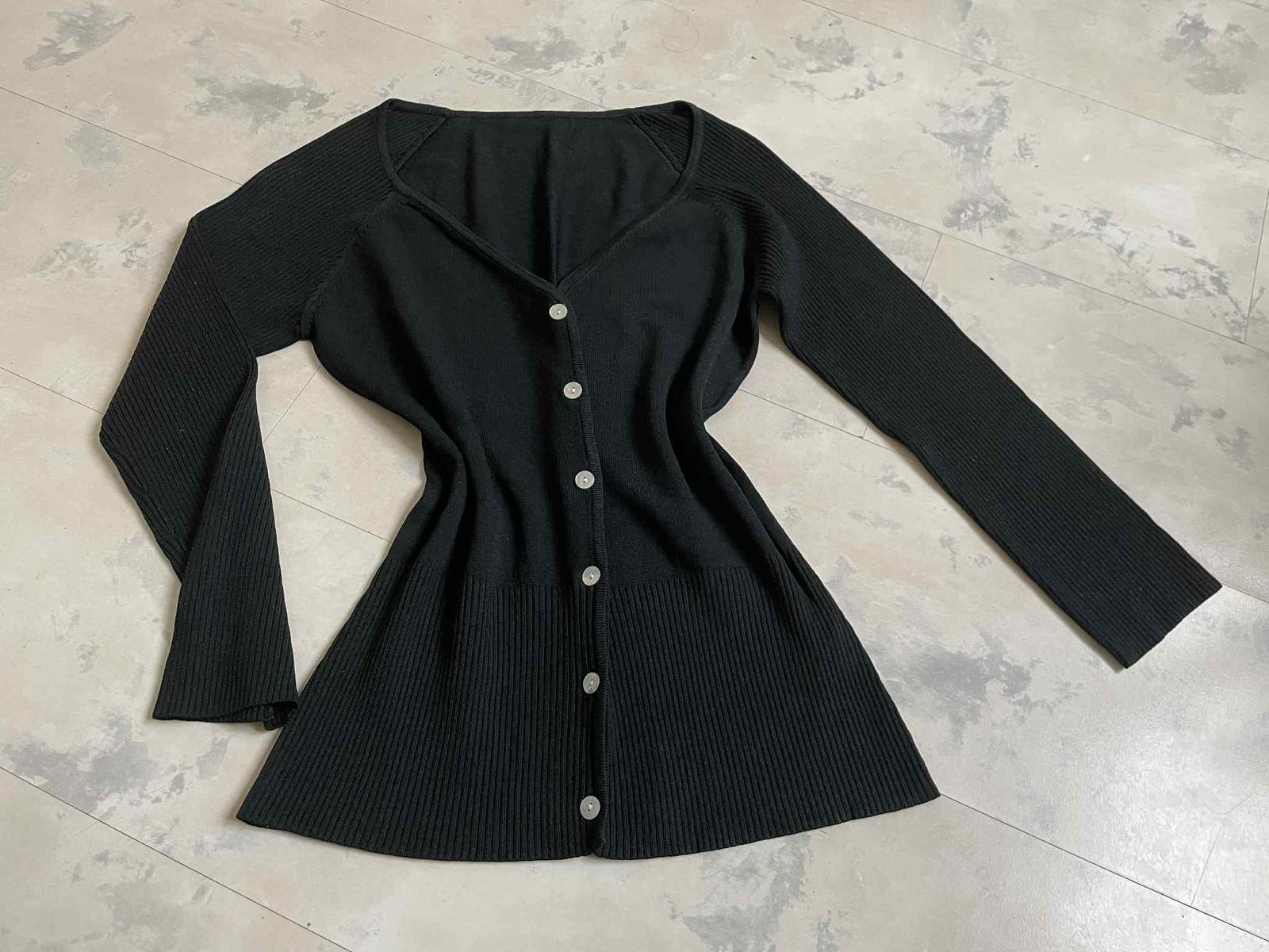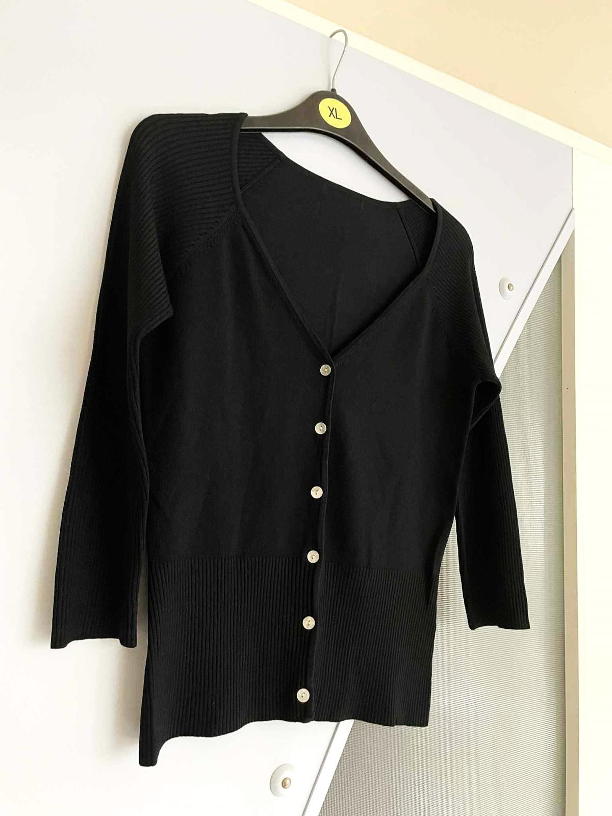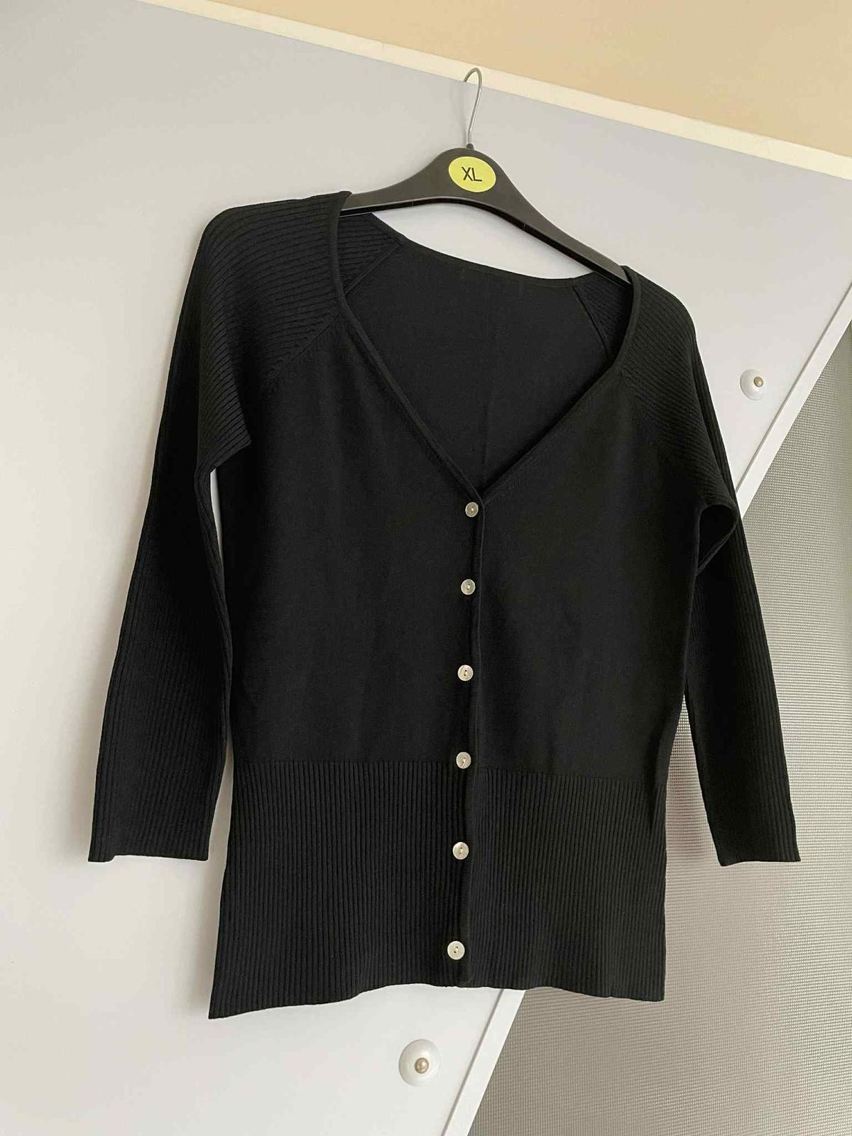 sýtočierny krátky svetrík na zapínaie - perleťové gombíky,krásne riešený,vysoké rumby,3/4 rukáv,top stav,raz opraný,materiál = 54 rayon,46 % nylon,poddajný,šírka meraná pod pazuchou = 41 x 2 cm,dlžka celkom = 55 cm, dlžka meraná na boku od pazuchy smerom dole = 38 cm,vn. dlžka rukáva = 33,5 cm, vonk. dlžka rukáva ( raglánový rukáv ) meraná od výstrihu = 50 cm,