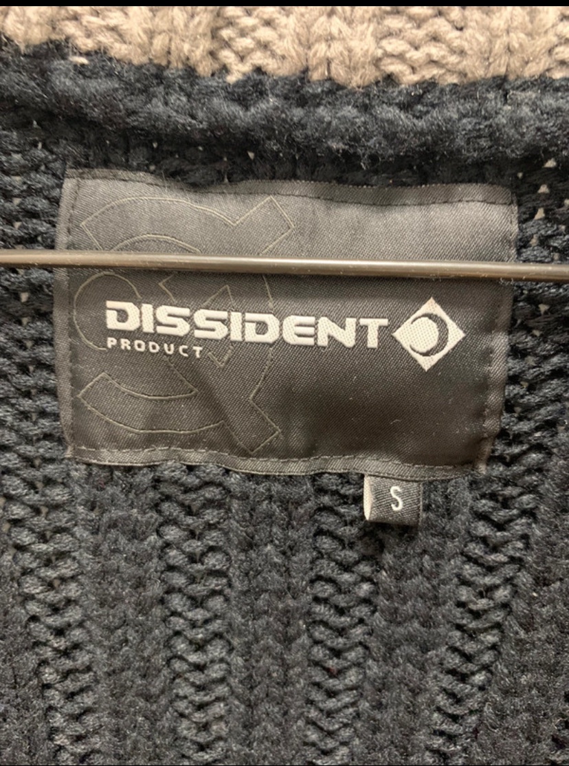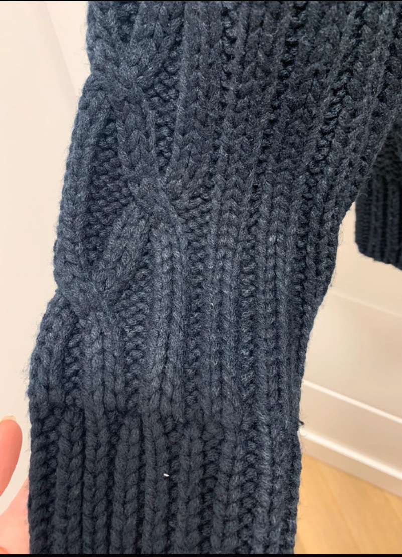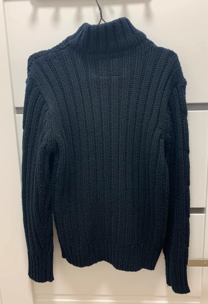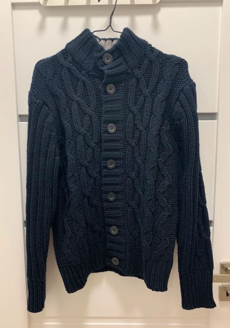 Hrubý tmavomodrý sveter na gombíky s pleteným vzorom a stojačikom značky Dissident.