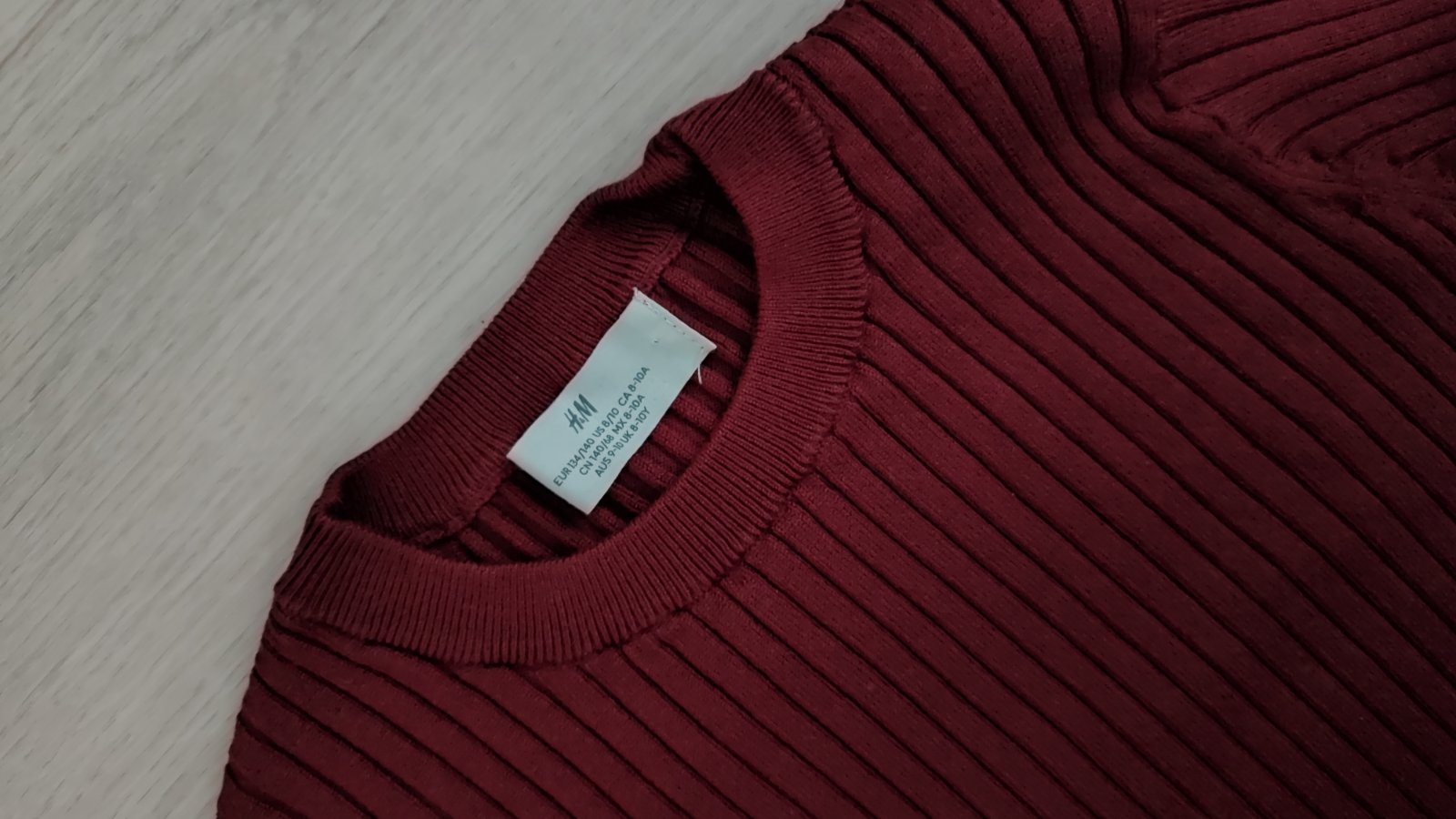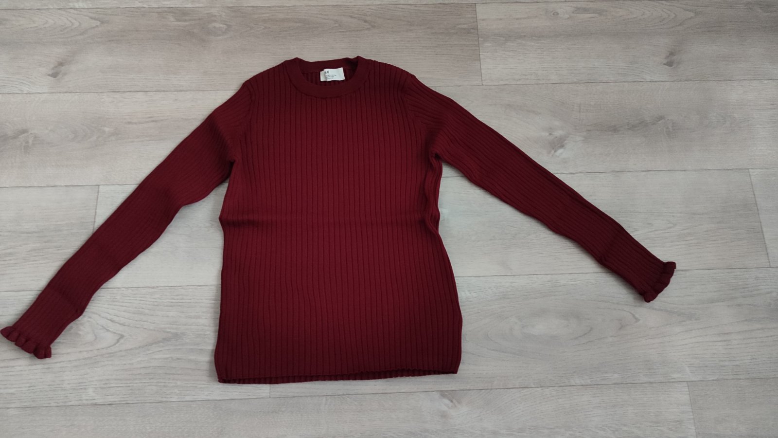 Bez poškodení a fľakov, pár krát oblečené, tmavé bordo, tenký pulovrik, volanik vpredu, veľkosť 134/140, šírka v podpazuší 39cm, rukáv od krku 51cm, dĺžka vpredu 46, zadná trošku dlhšia.