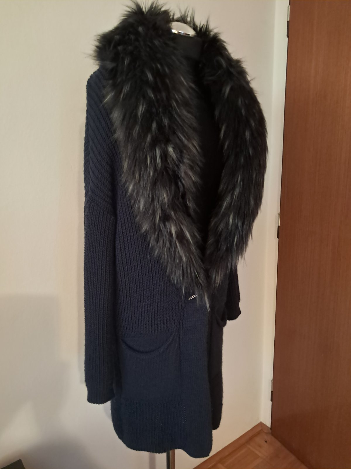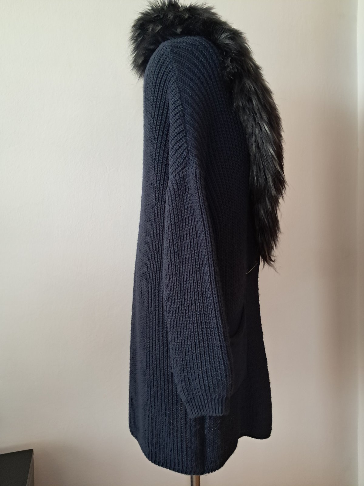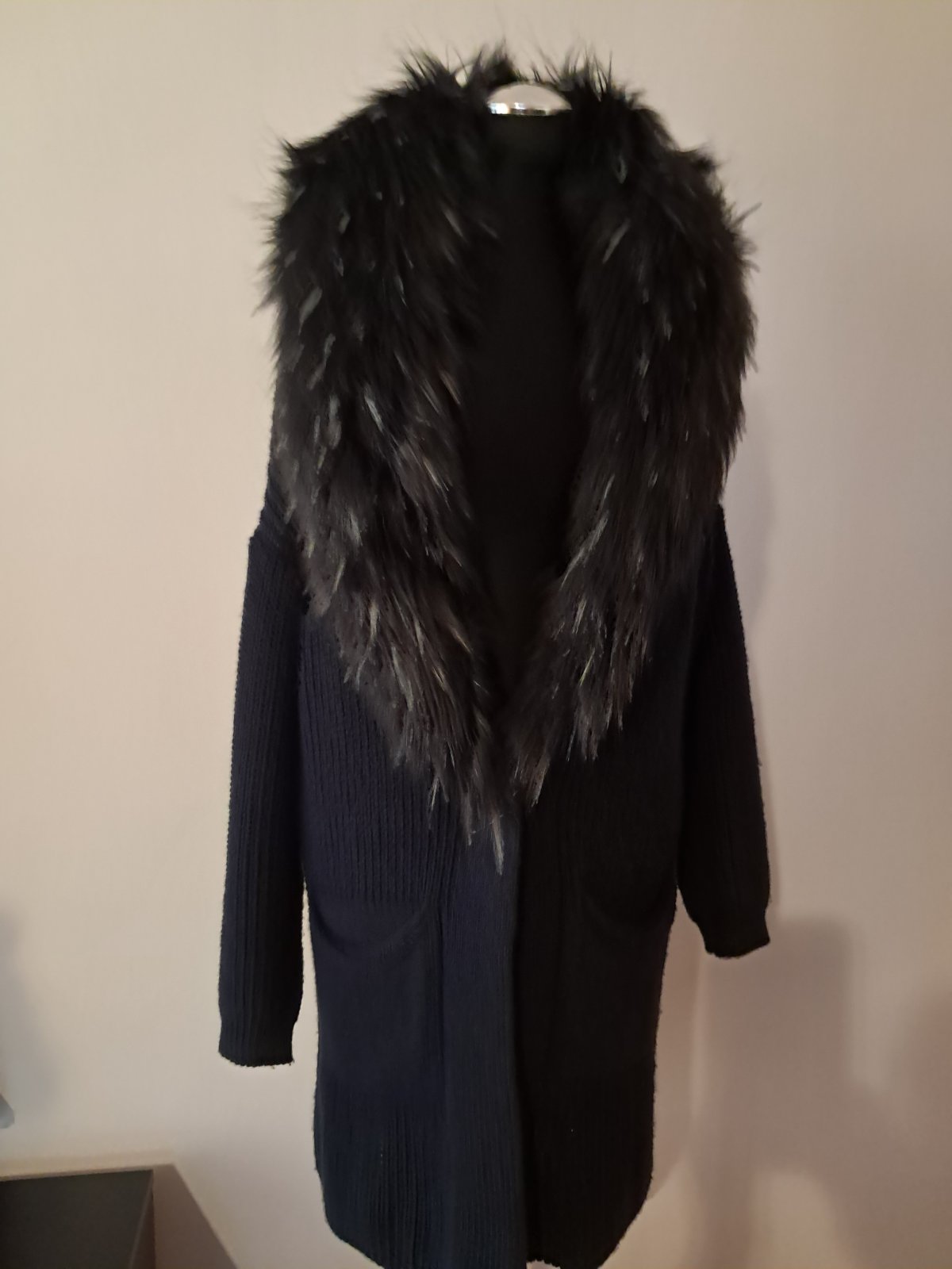 Sveter s veľkým kožušinovým golierom čiernej farby so svetlo sivým striekaním, materiál 100 % akryl, "MADE IN ITALY" veľkosť sedí od čísla 40 aj na 44. Oblečený pár krát.