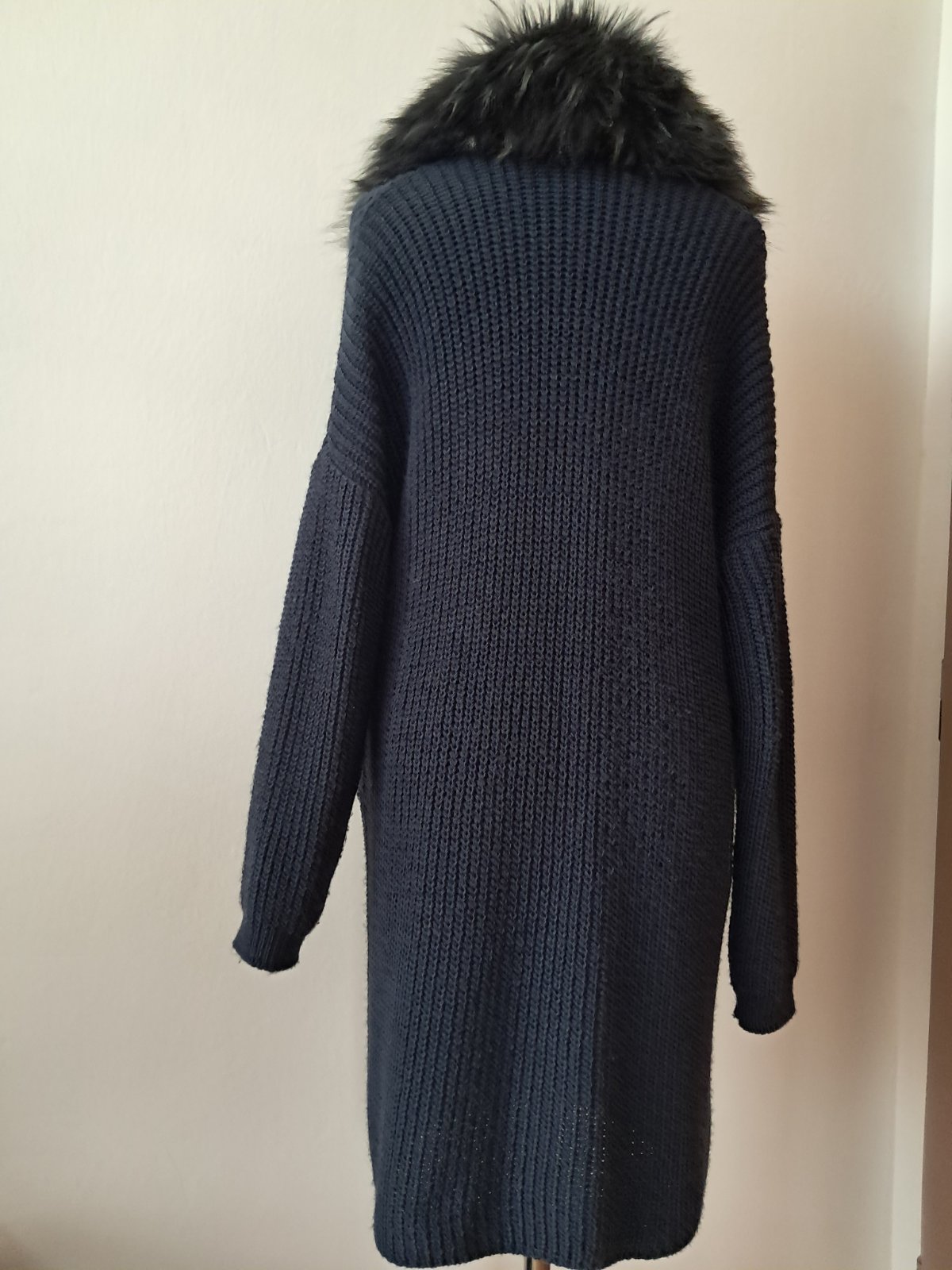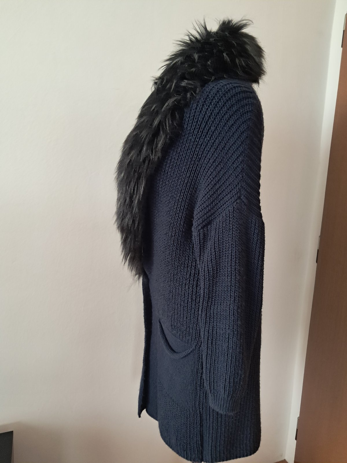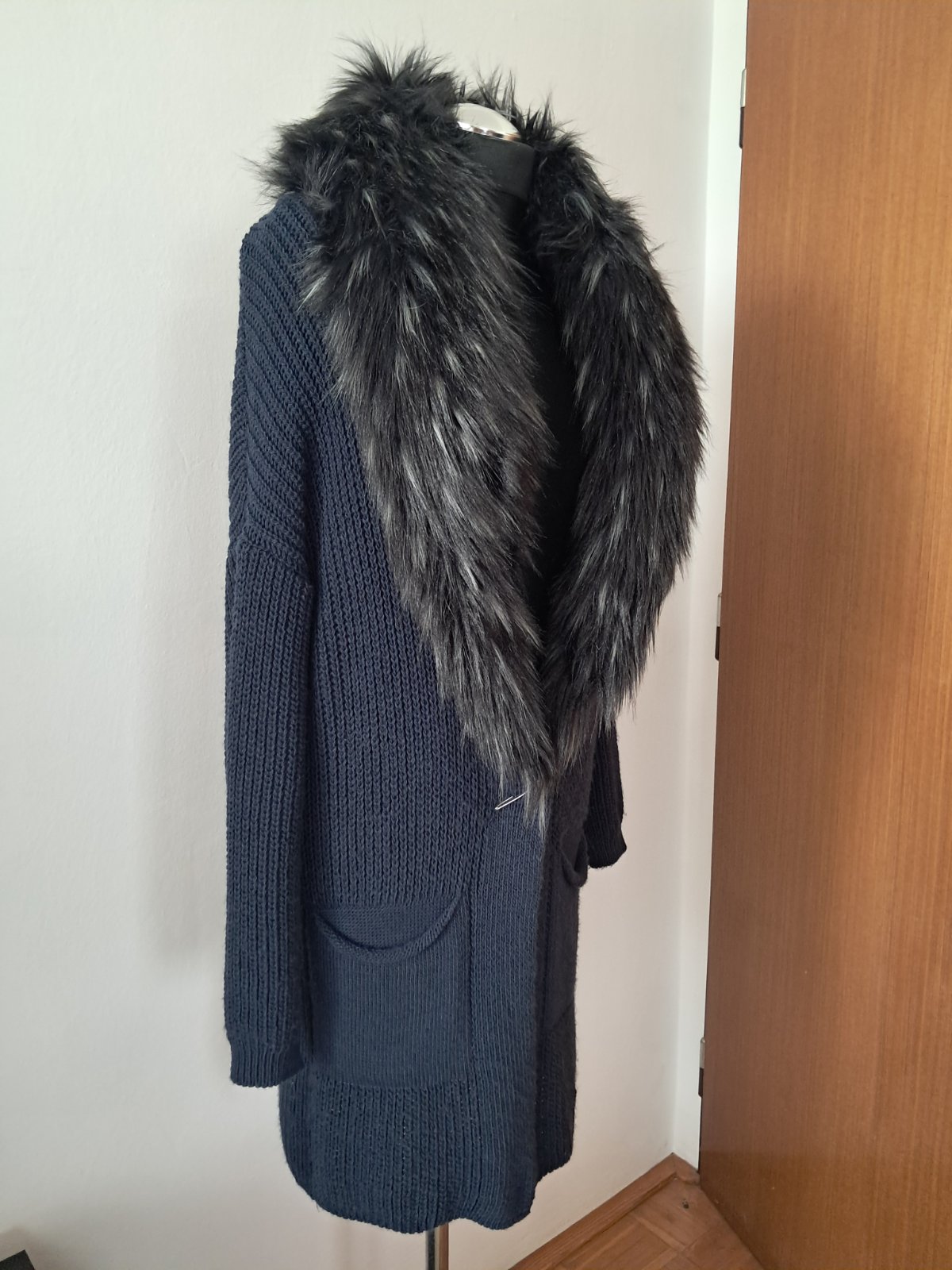 Sveter s veľkým kožušinovým golierom čiernej farby so svetlo sivým striekaním, materiál 100 % akryl, "MADE IN ITALY" veľkosť sedí od čísla 40 aj na 44. Oblečený pár krát.