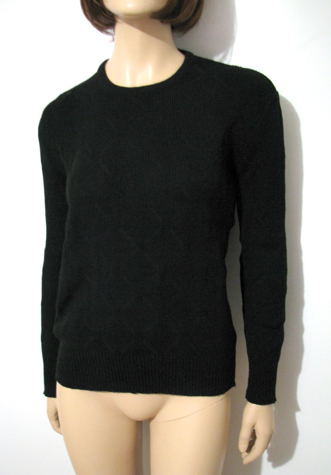 Čierny tenký pleteninový pulóver s plastickým vzorom na prednom dieli. Výborne zachovalý, bez poškodení. Je veľmi elastický a prispôsobivý. Veľkosť univerzálna od S, M až po L, XL. V prípade záujmu premeriam.