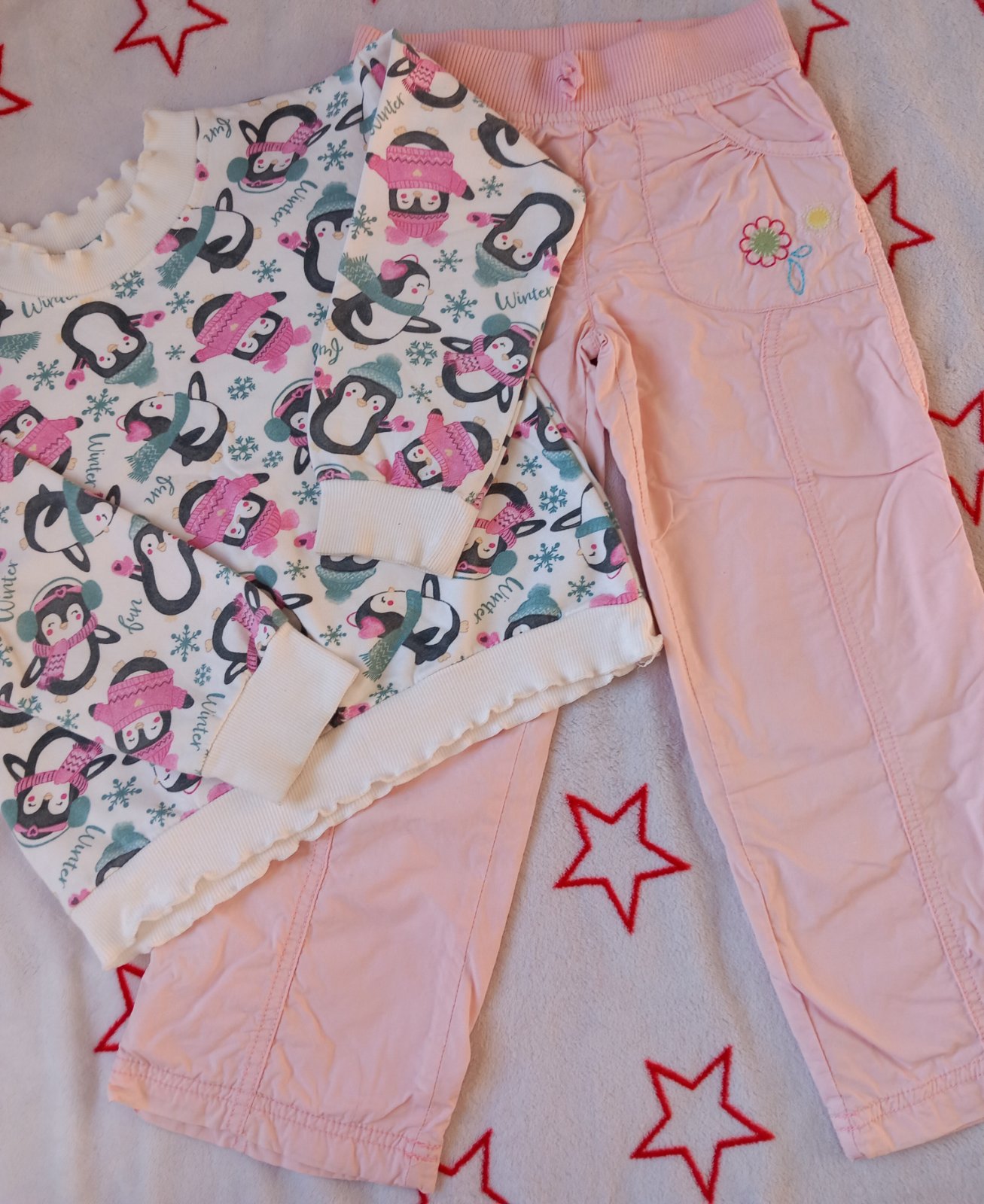 Teplejšia mikina a podšité nohavice, oboje vhodné na jeseň a bez poškodenia. Značky si nepamätám.