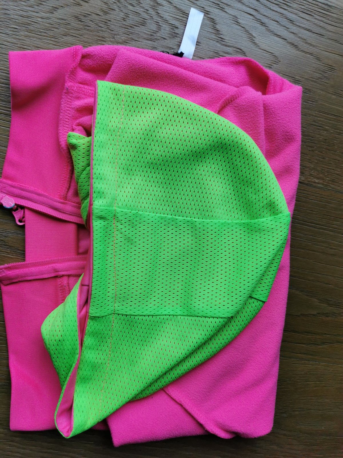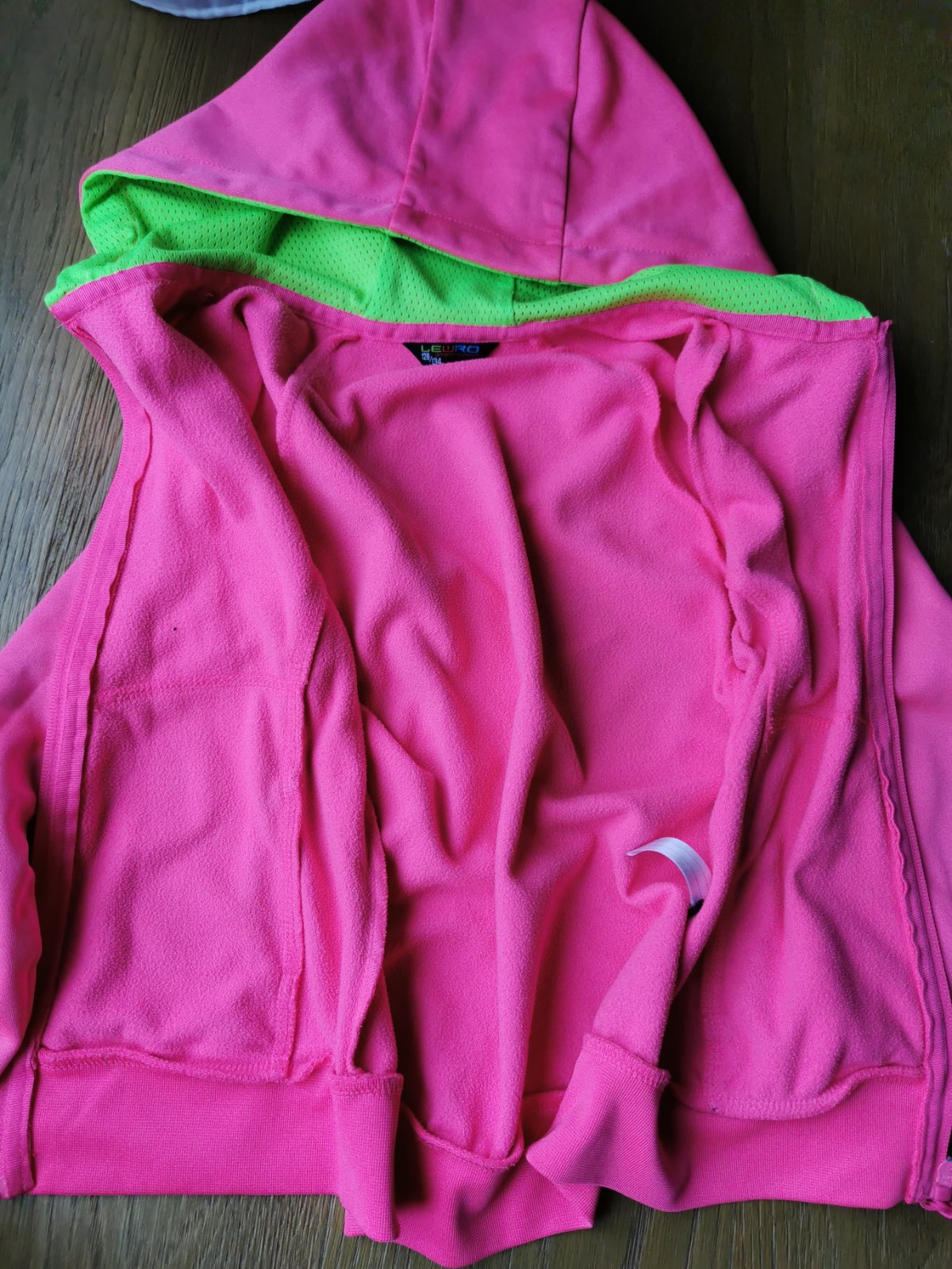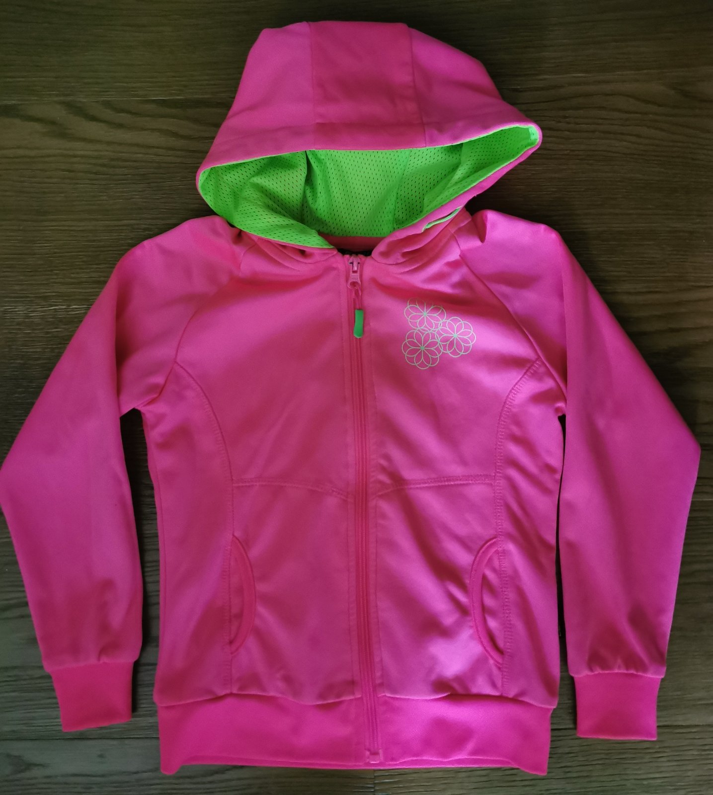 Veľmi pekná, tenká mikina vhodná na športovanie a telesnú výchovu. Farba je krásna krikľavo-ružová doplnená zelenou. Dĺžka 49cm, šírka 2x39 a dĺžka rukáva od krku 55cm.