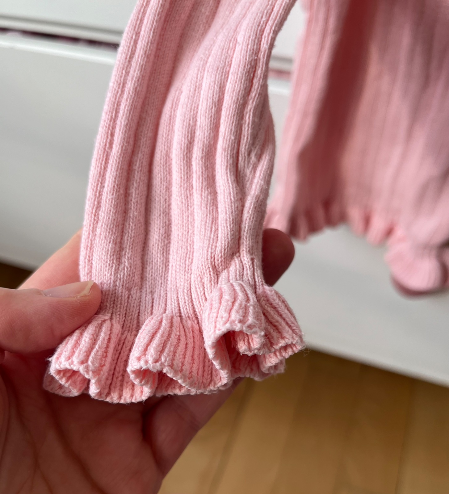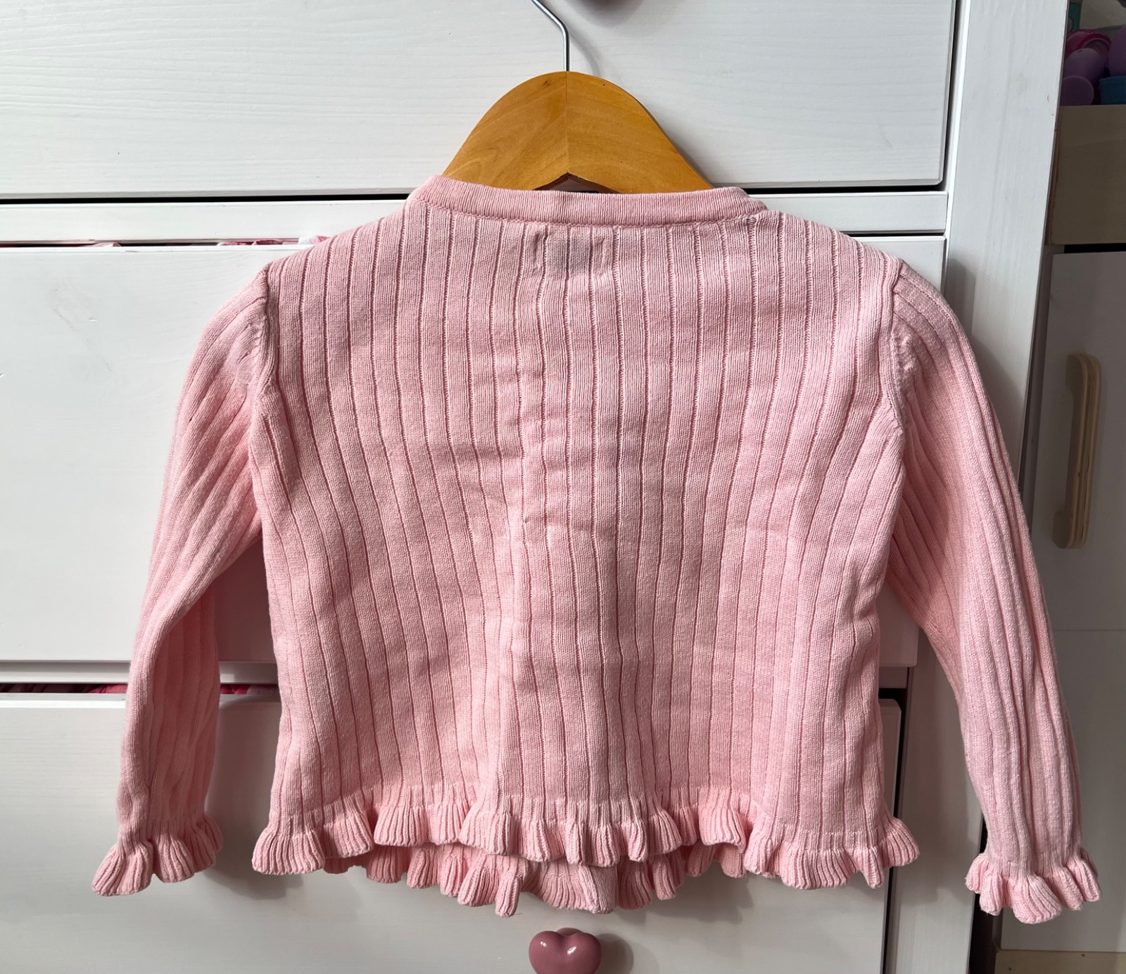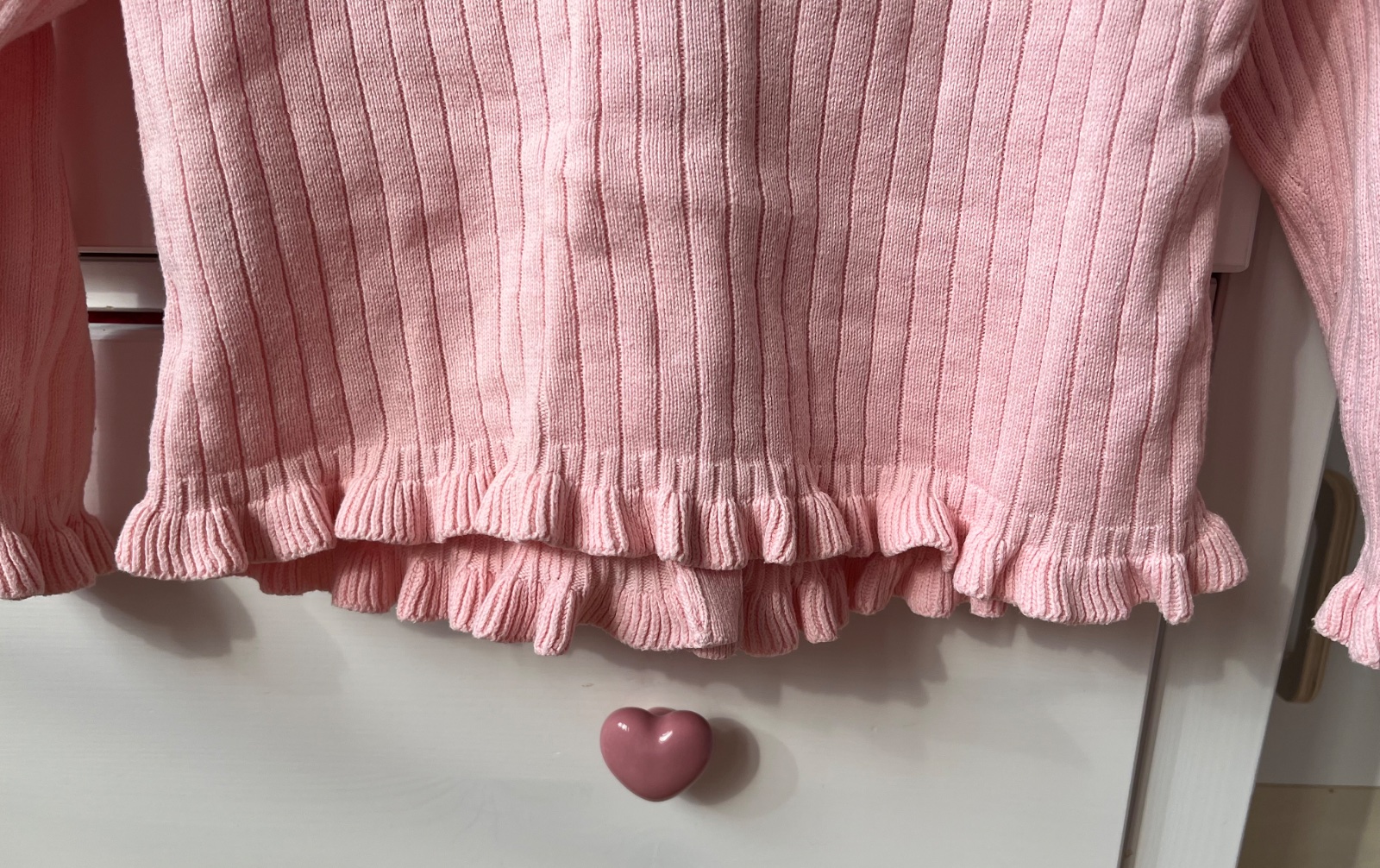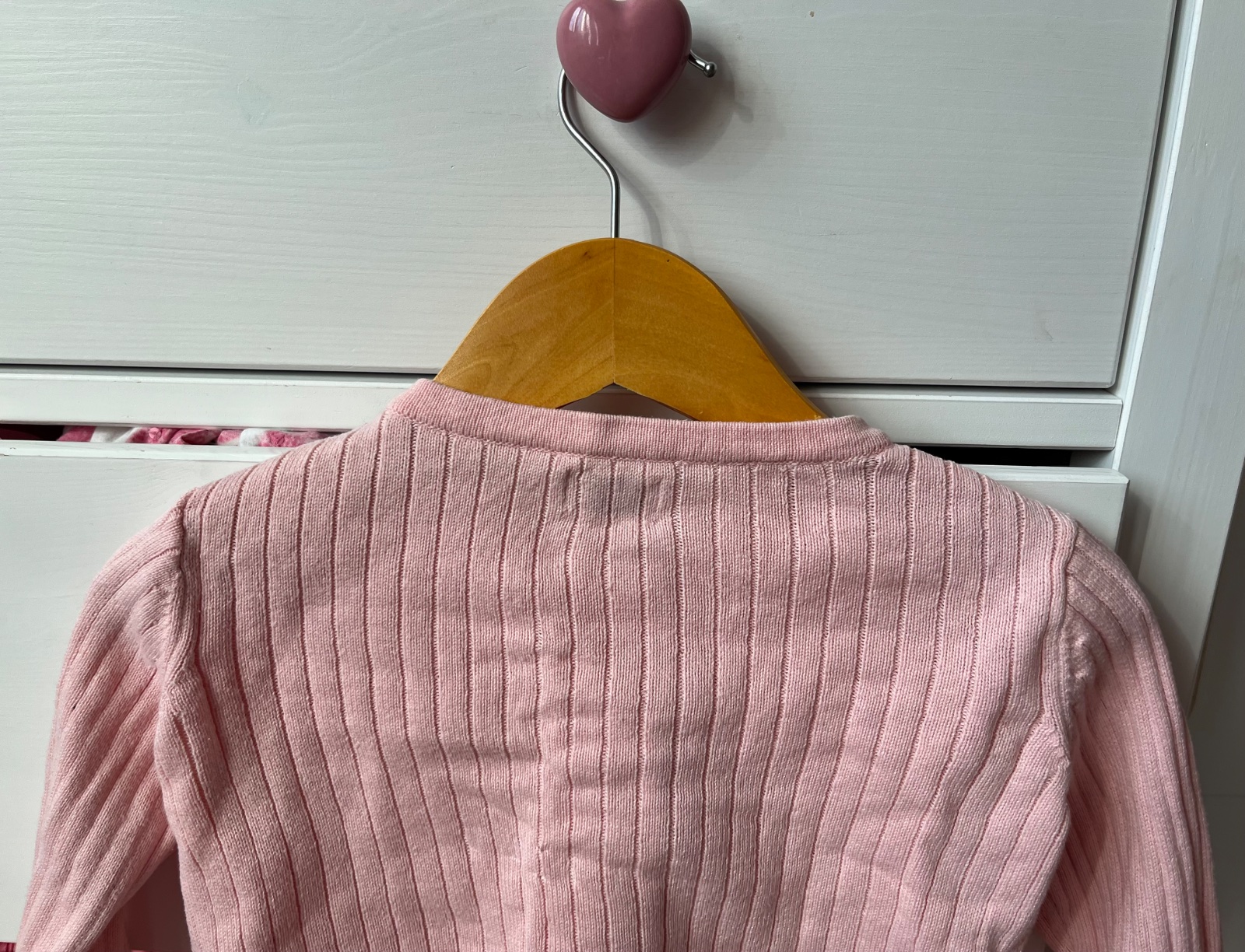 - párkrát nosený bledoružový sveter na srdiečkové gombíky