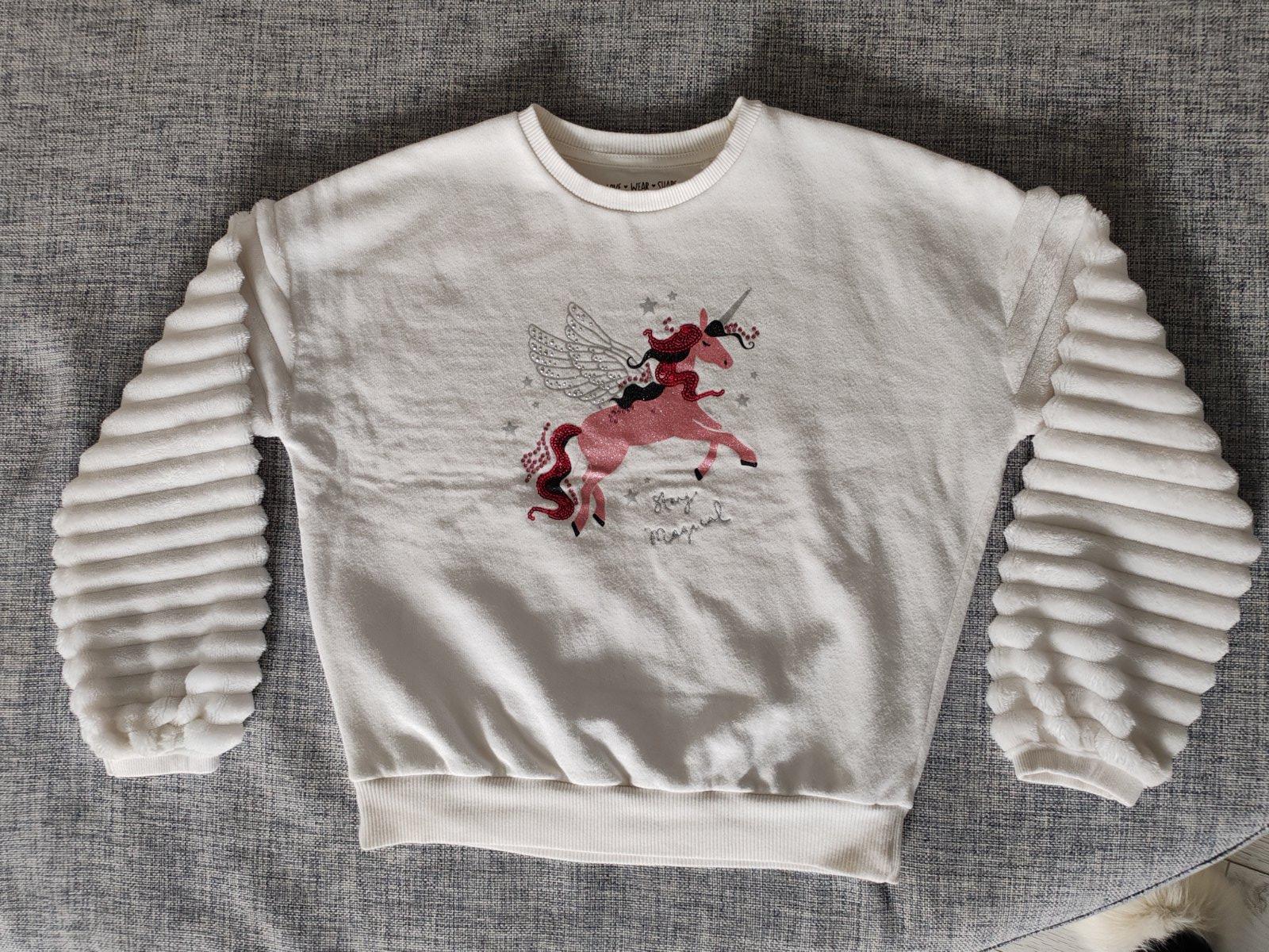 Príjemný, hebunký chlpatkový kardigan - svetrík bez zapínznia. Dcéra ho mala veľmi rada, prakticky nezničiteľný. Veľmi kvalitný materiál s trblietkami. V top stave.