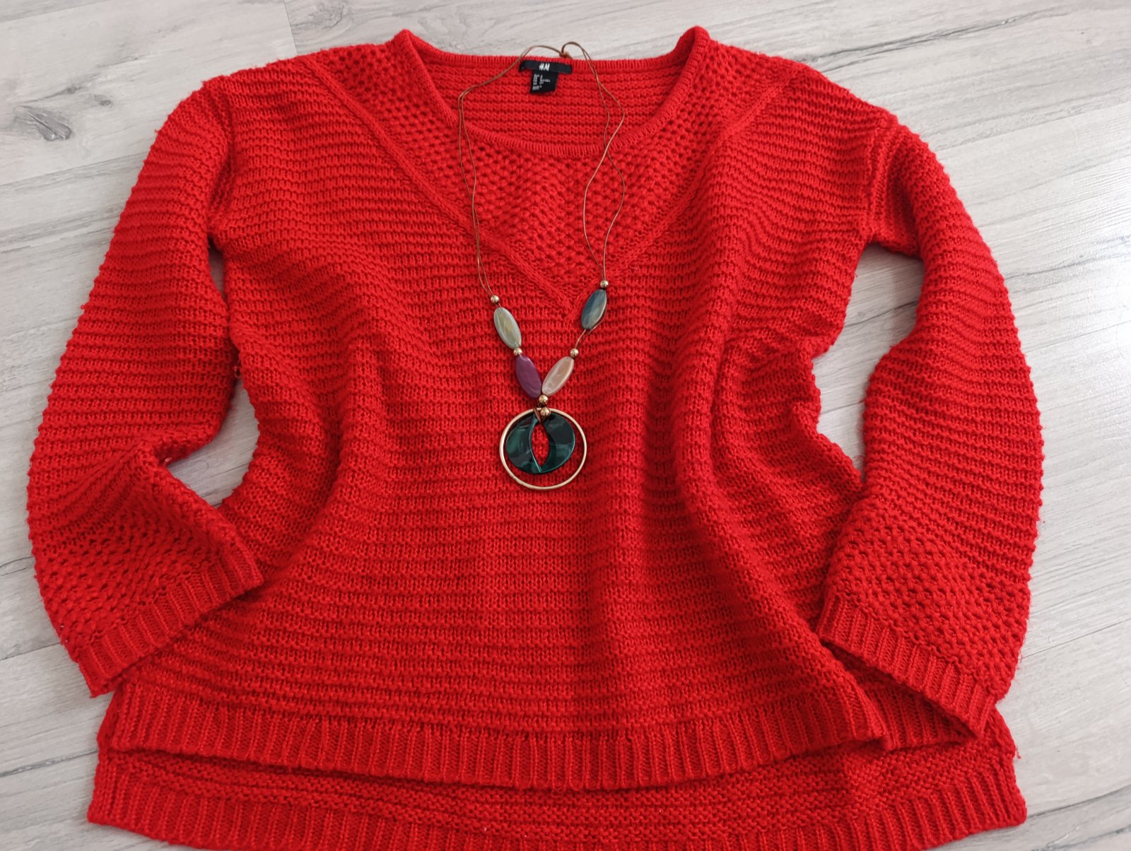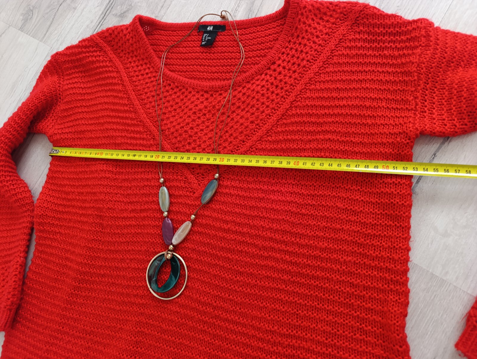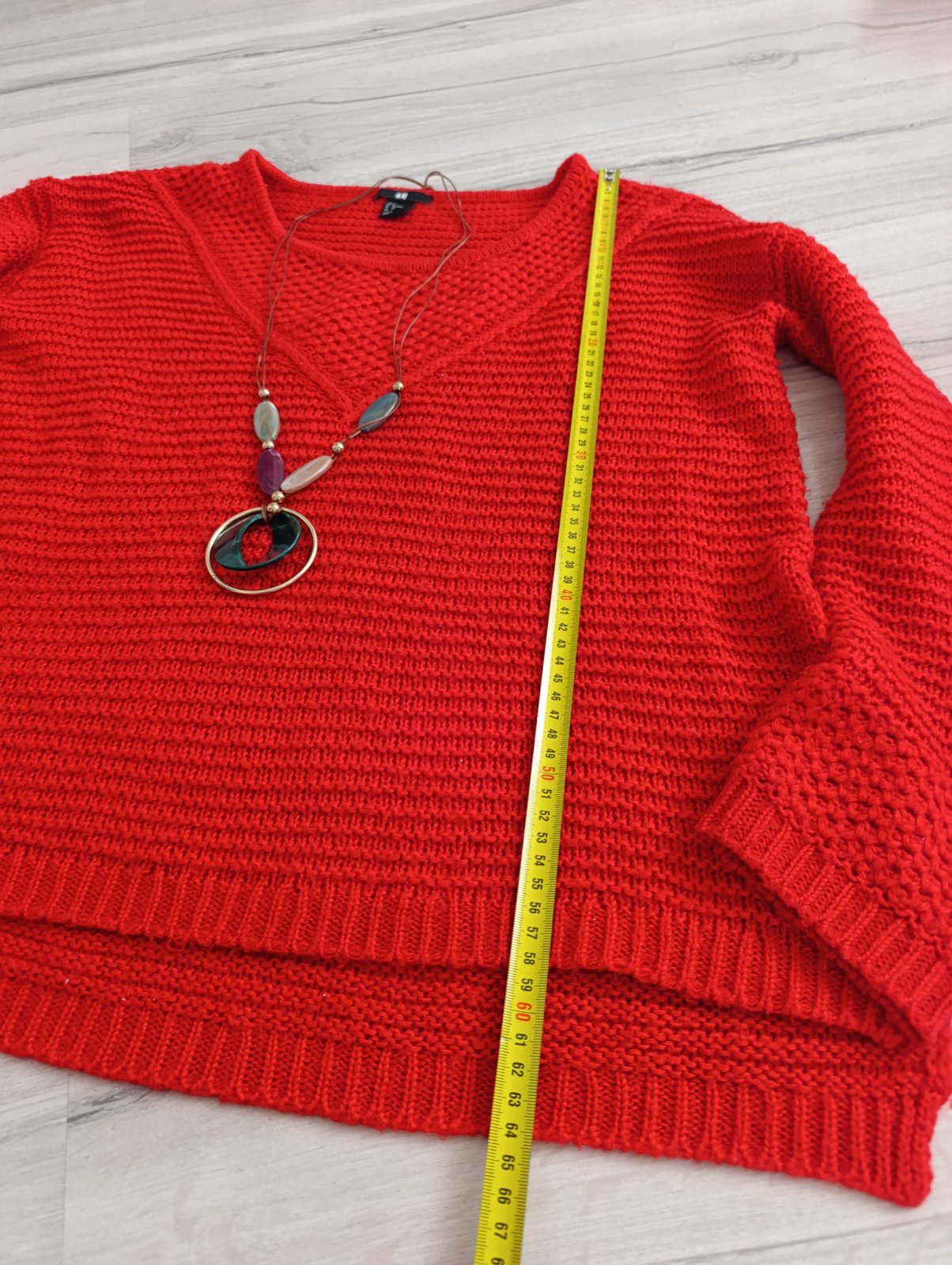 Krásny pletený sveter, vpredu kratší, mäkký materiál. Uvedená veľkosť S/36, ale je to voľný oversize strih tak sedí v pohode na M-L. Pri výmene 10€