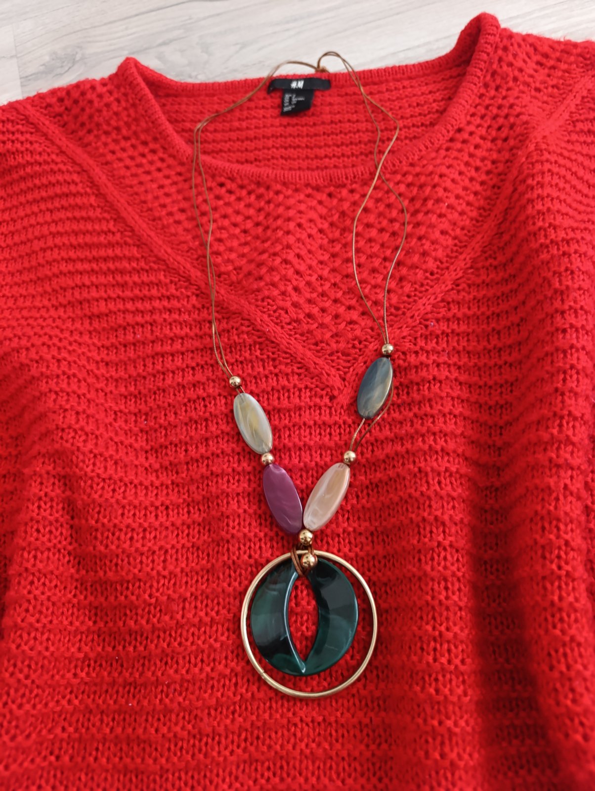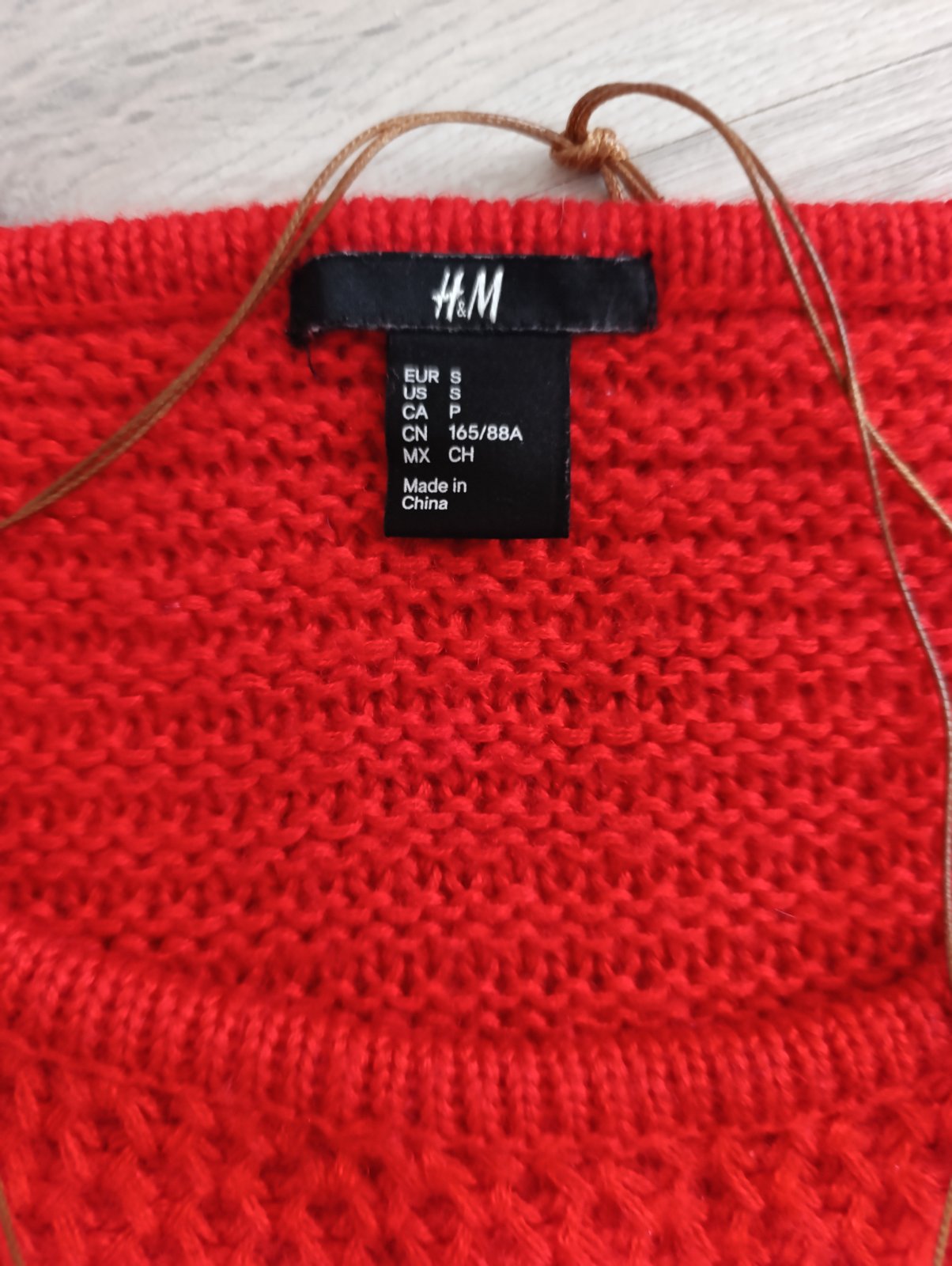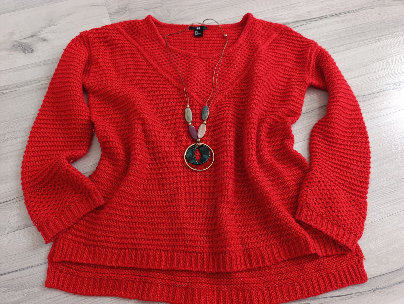 Krásny pletený sveter, vpredu kratší, mäkký materiál. Uvedená veľkosť S/36, ale je to voľný oversize strih tak sedí v pohode na M-L. Pri výmene 10€