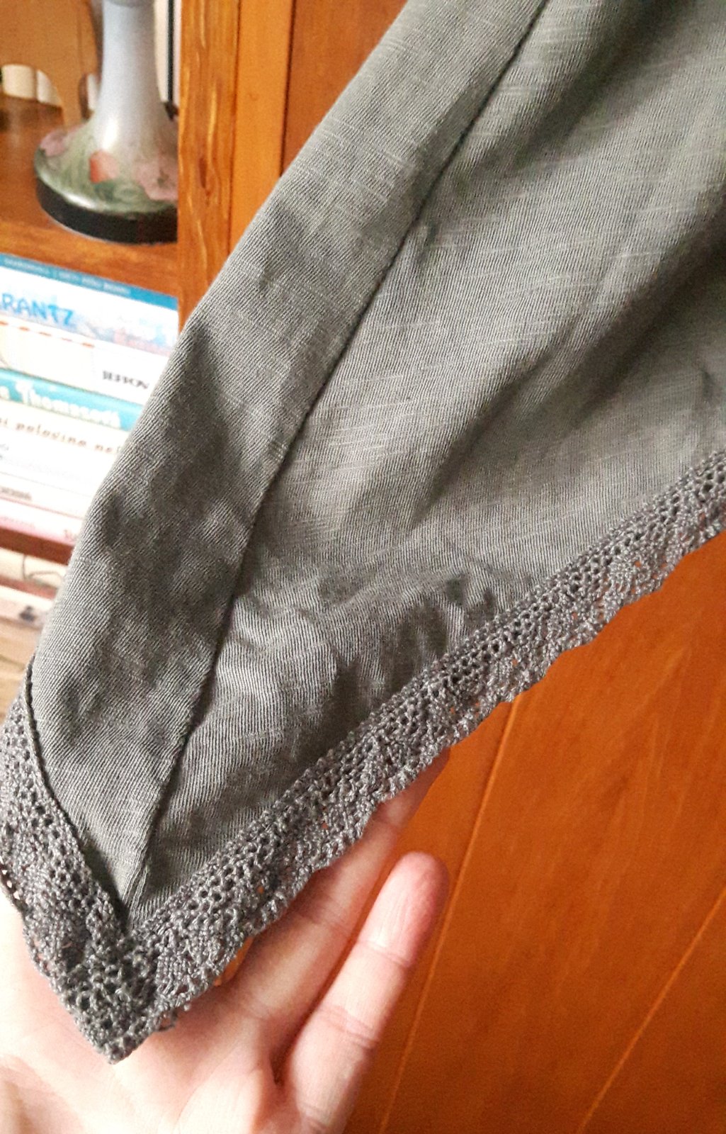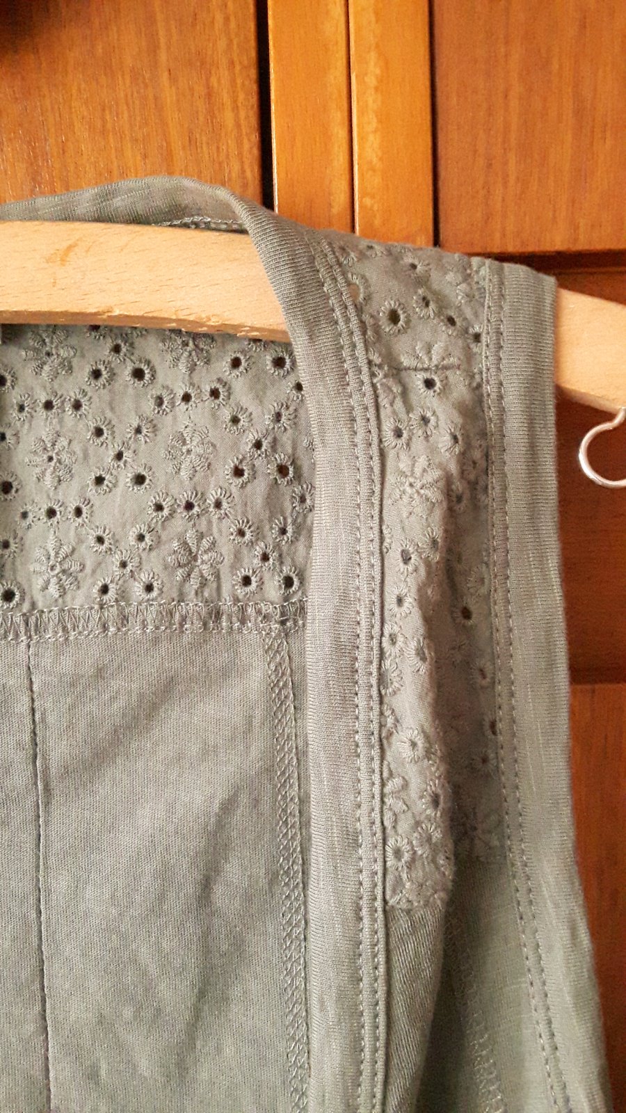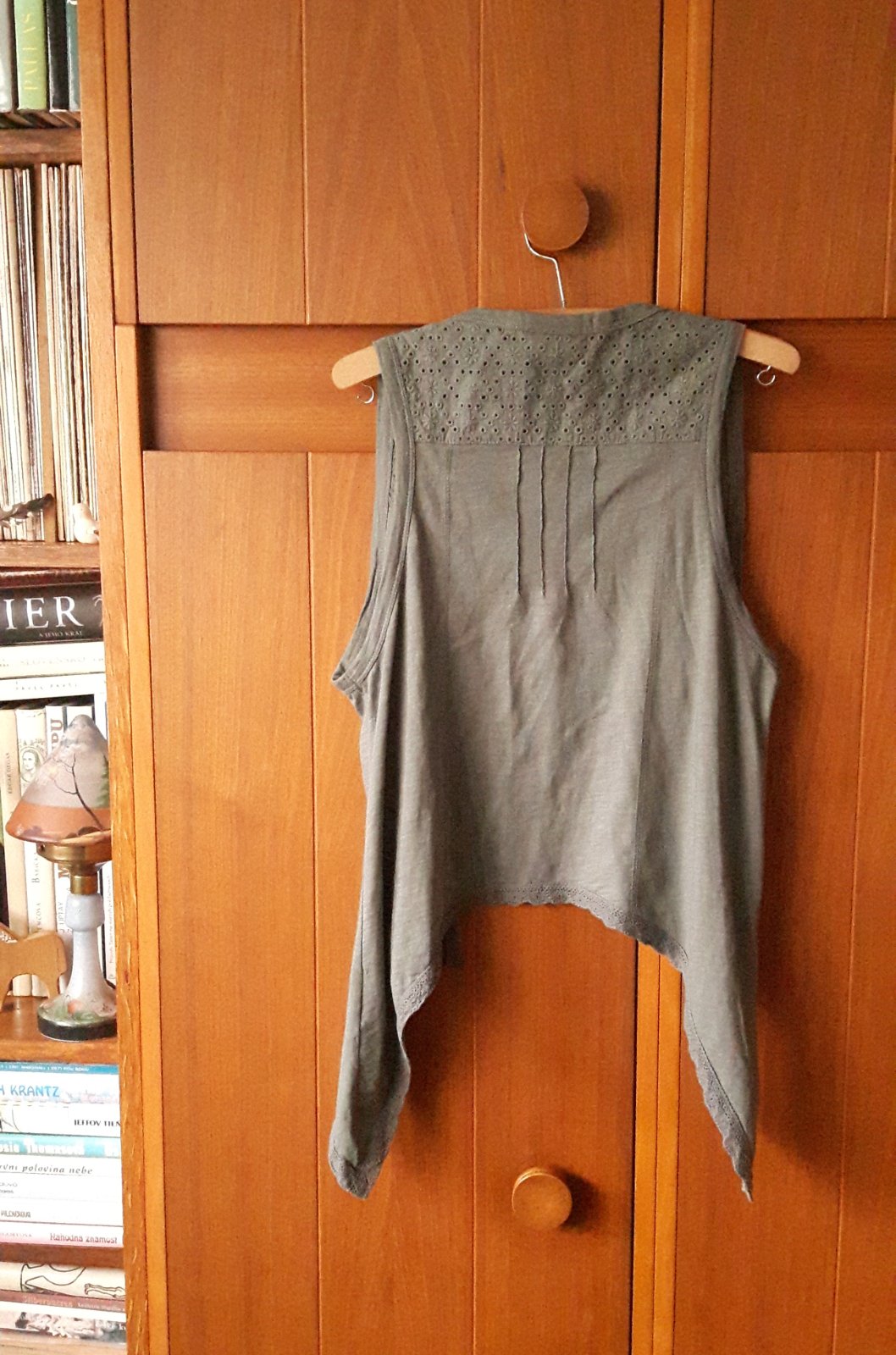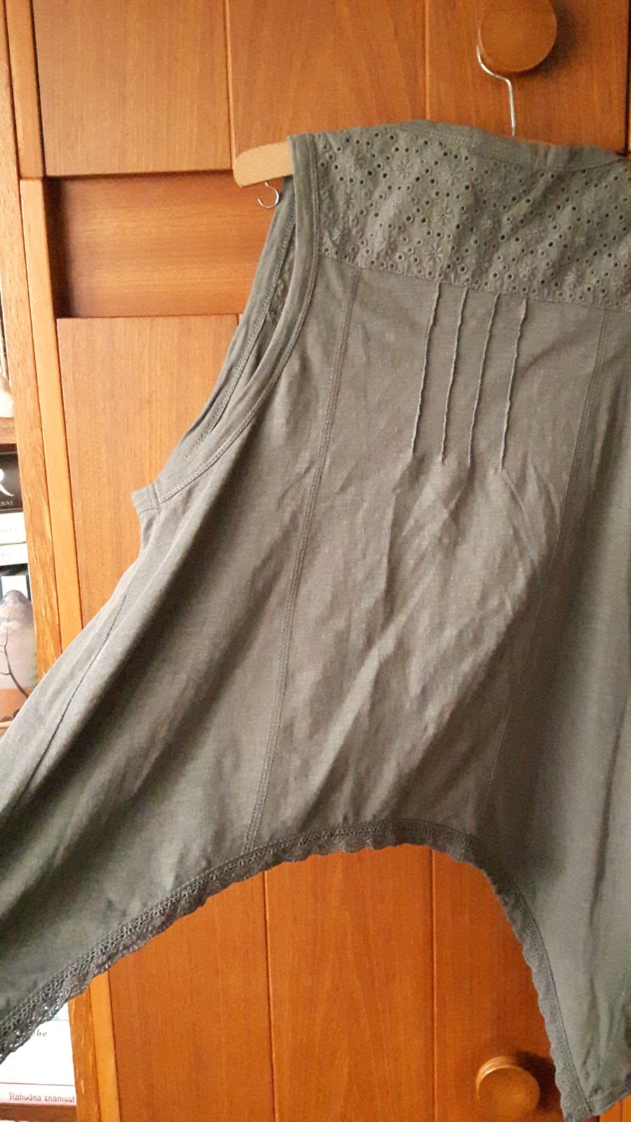 Pekná vestička farby khaki zo 100% bavlny kombinovaná s krásnou madeirou, spodný okraj vestičky lemovaný čipkou. Vestička sa nedá zapnúť, tvorí len akýsi doplnok oblečenia. Veľkosť je udaná 40, ale povedala by som, že je to skôr M, alebo S, značka Street One. Nemá žiadne poruchy. Dĺžka najkratšej chrbtovej strany je 46 cm, šírka meraná pod pazuchami: 43 cm.