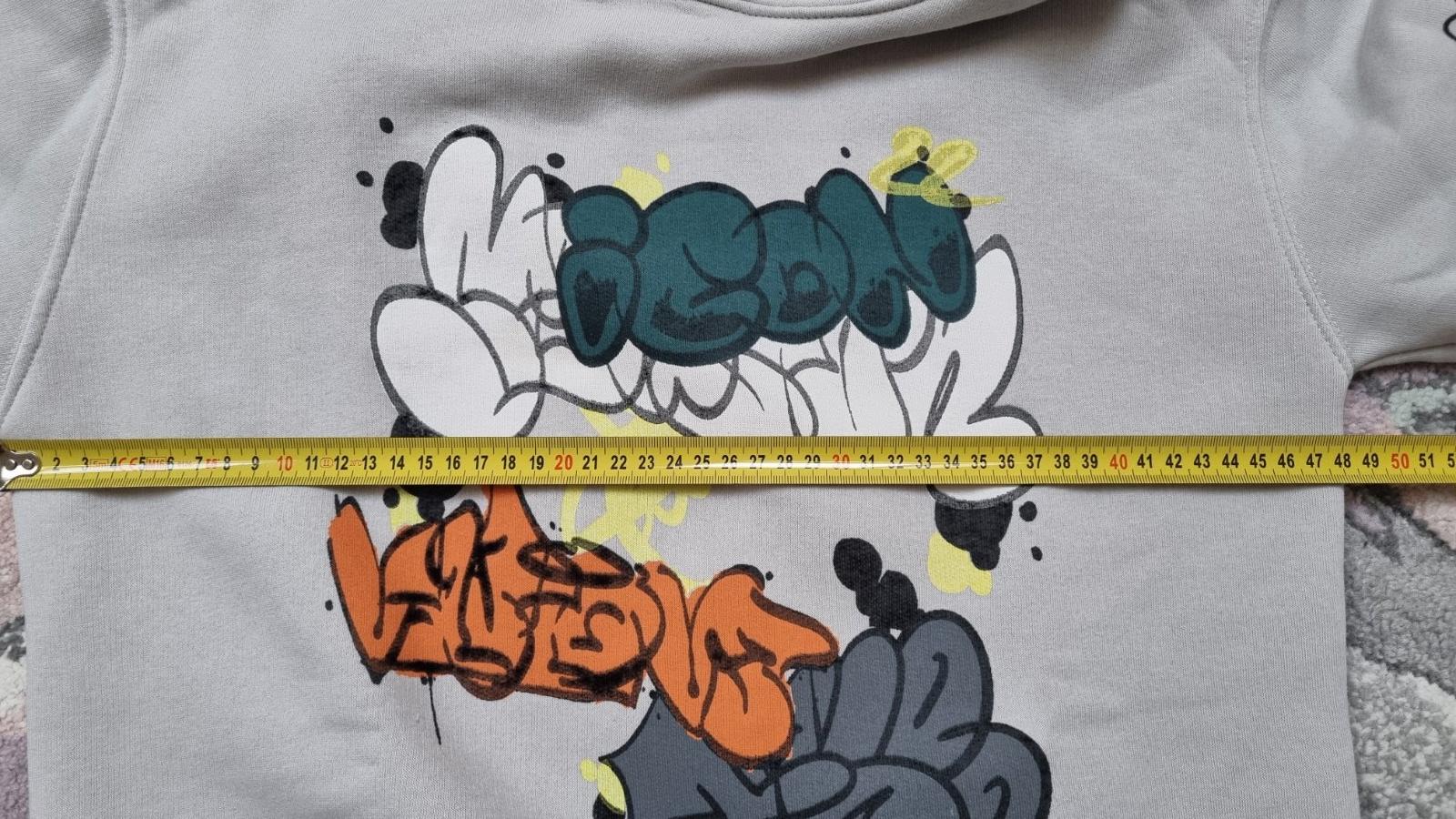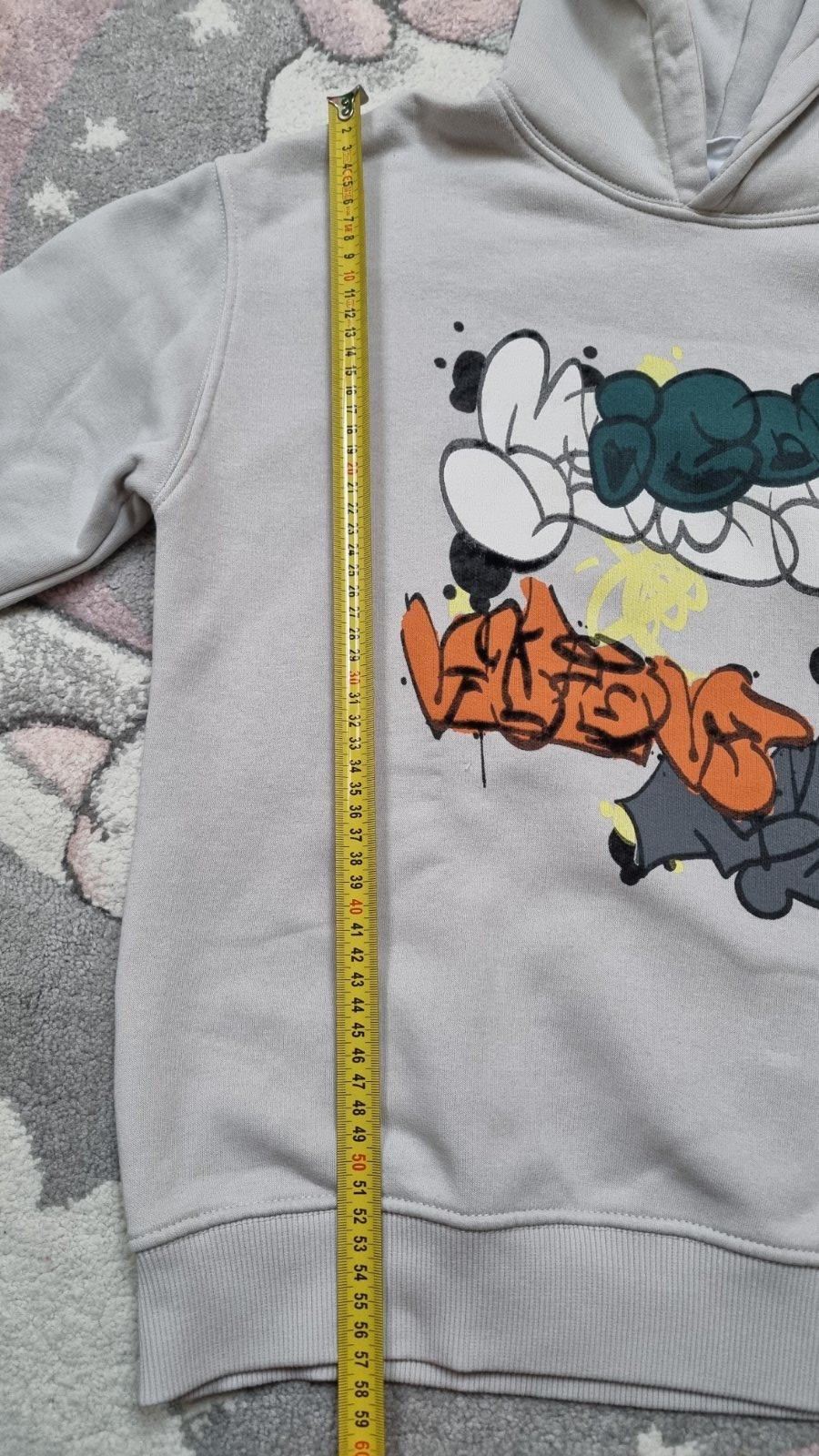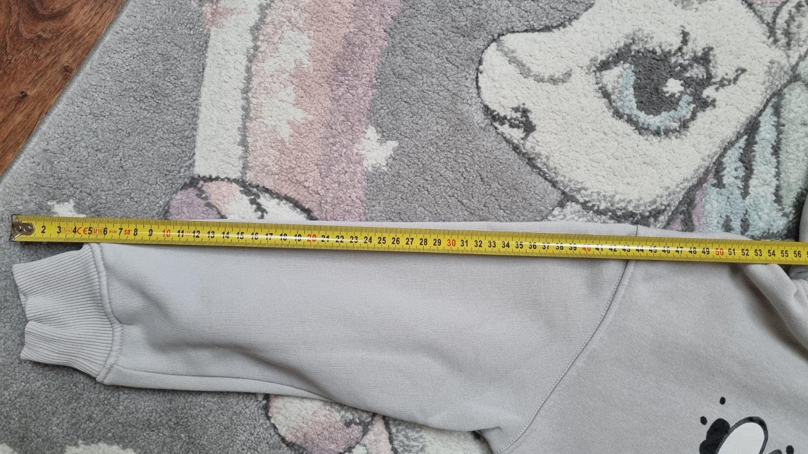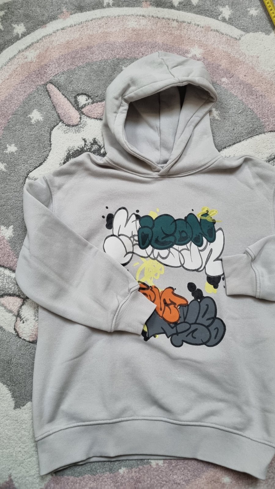Šedá mikina, veľkosť 140.Dĺžka rukávov je 60 cm. Sú na nej fliačky preto taká cena.
