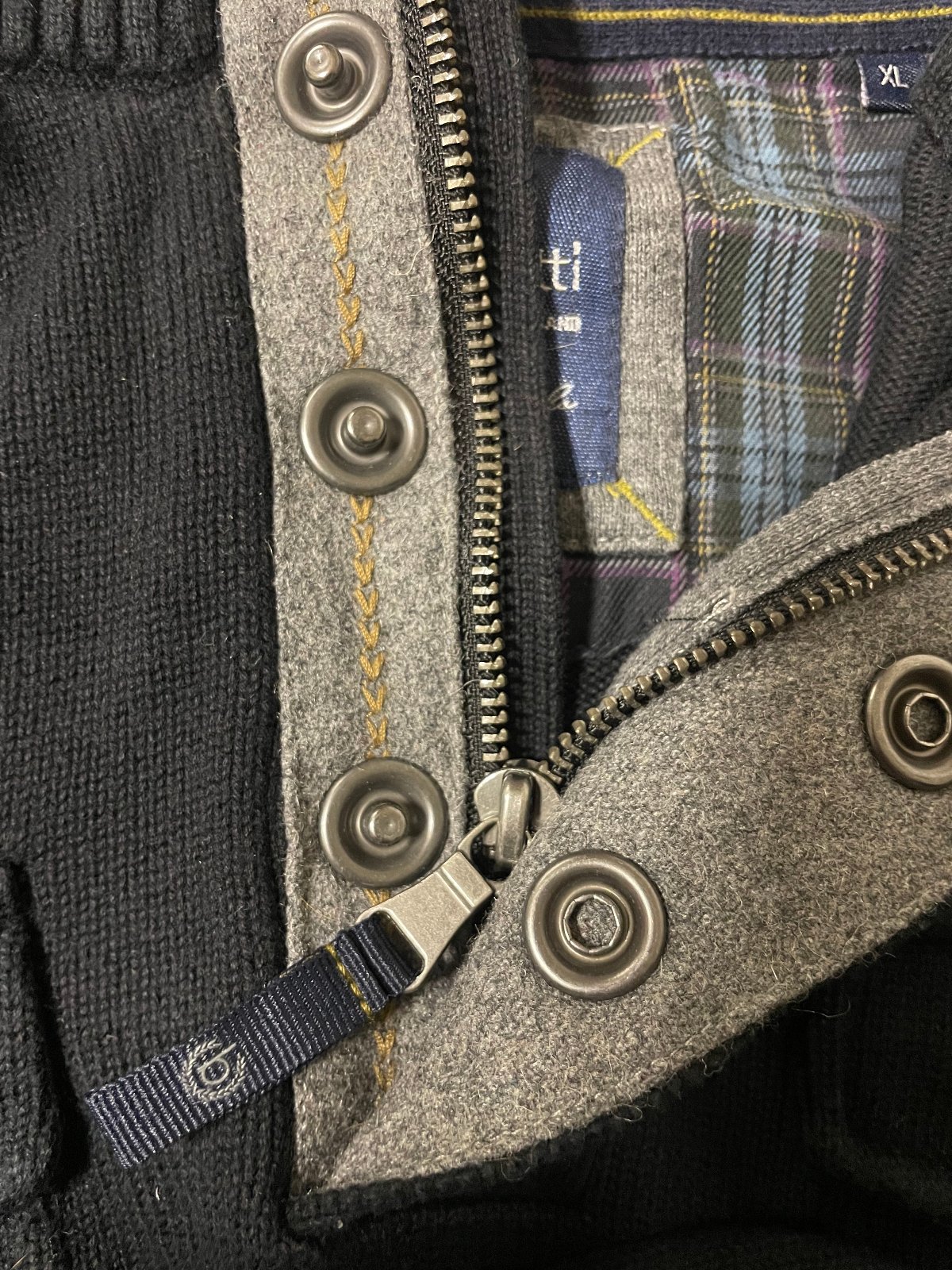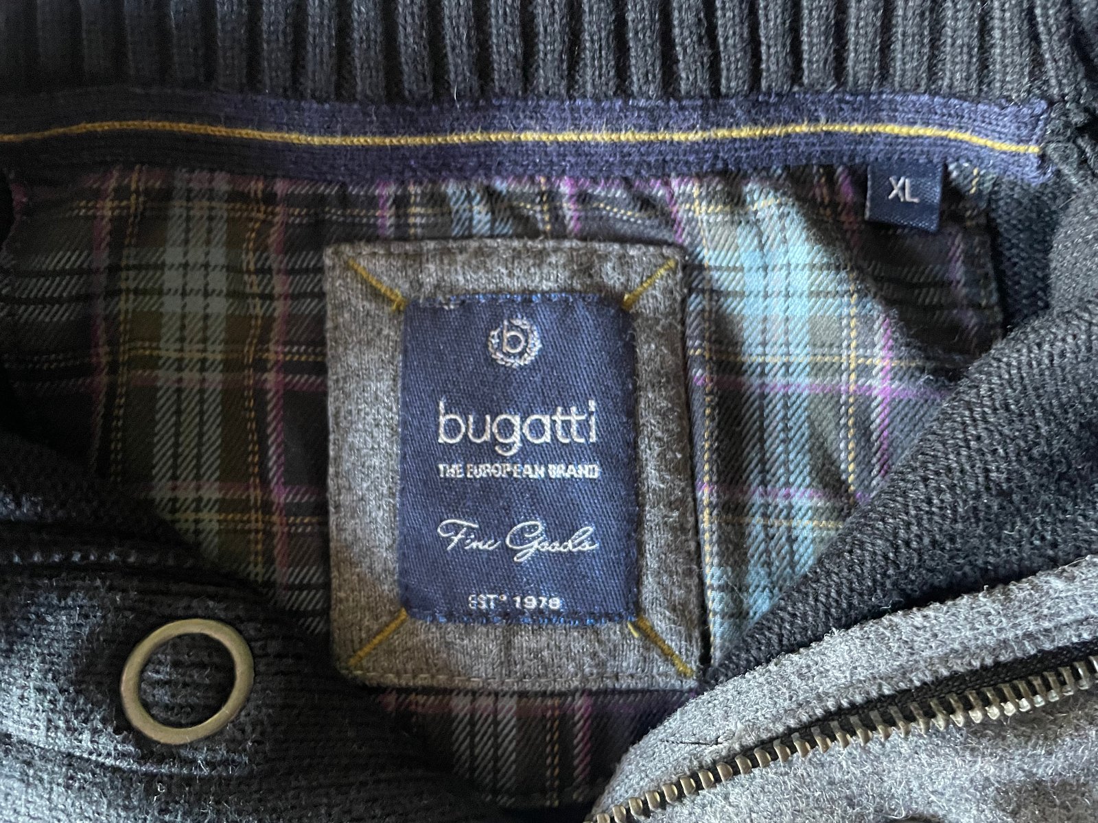 Pánsky tmavošedý sveter značky Bugatti. Veľkosť XL. Rozmery: dĺžka 71 cm, šírka v podpazuší 2x57 cm, dĺžka rukáva od podpazušia 50 cm a od ramena 64 cm.