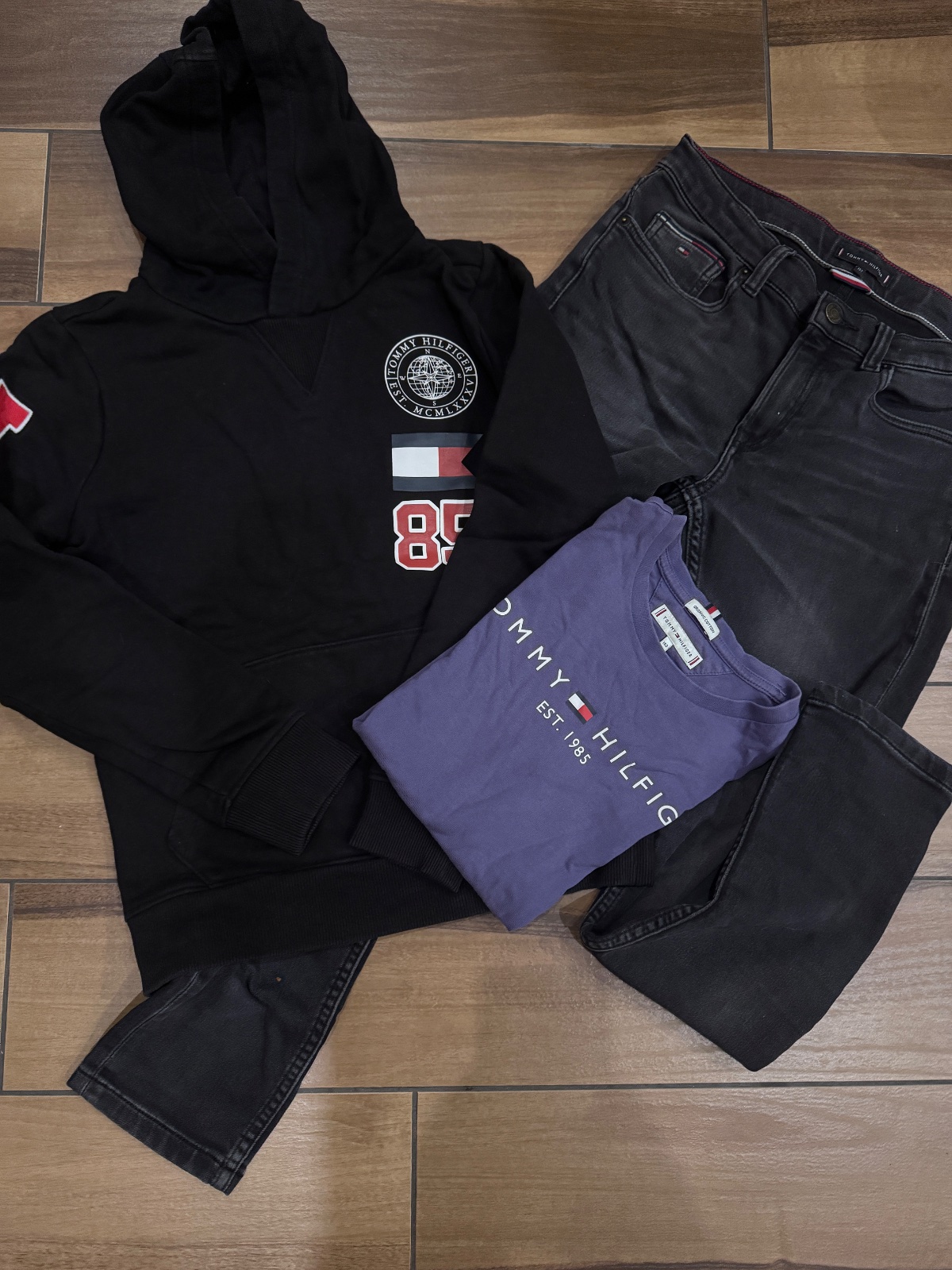 Čierna mikina, čierne rifle a fialove tricko Tommy Hilfiger originál, cena soolu