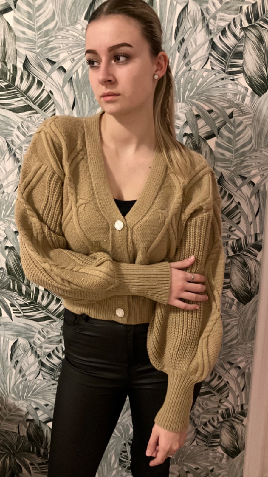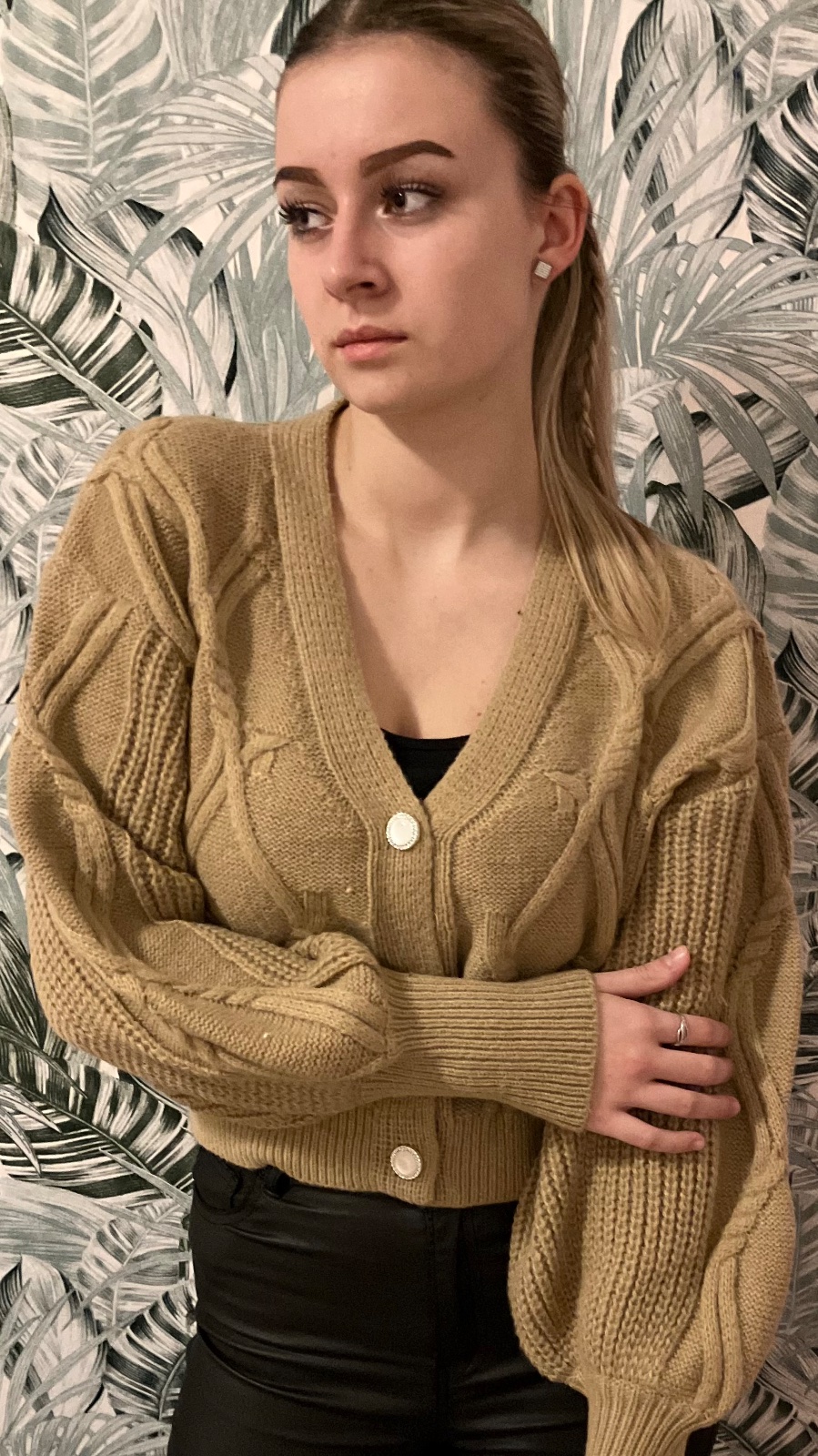 SkladomPohodlný dámsky voľný štýlový sveter s balónovými rukávmi a so zapínaním na gombíky. Ležerný strih, overesize, hrubší, vpredu vzorovaný vzadu hladký , véčkový výstrih. Materiál 68% viskóza, 32% polyester. Veľkost UNI (S,M,L,XL). Krajina pôvodu:ČĽR.