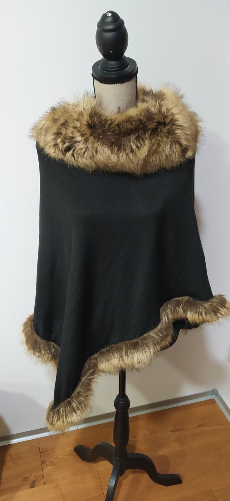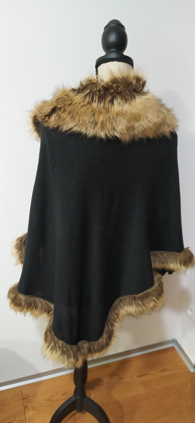 Čierne teplučké pončo F&F, nenosené, bez visačky. S kožušinkou. PC 22€ Oblecene to vyzera ako na modelke. Širka 110x2 cm, v tom su aj rukavy, dlzka prednej casti 57 cm, zadnej 73cm. Zapinanie na je...
