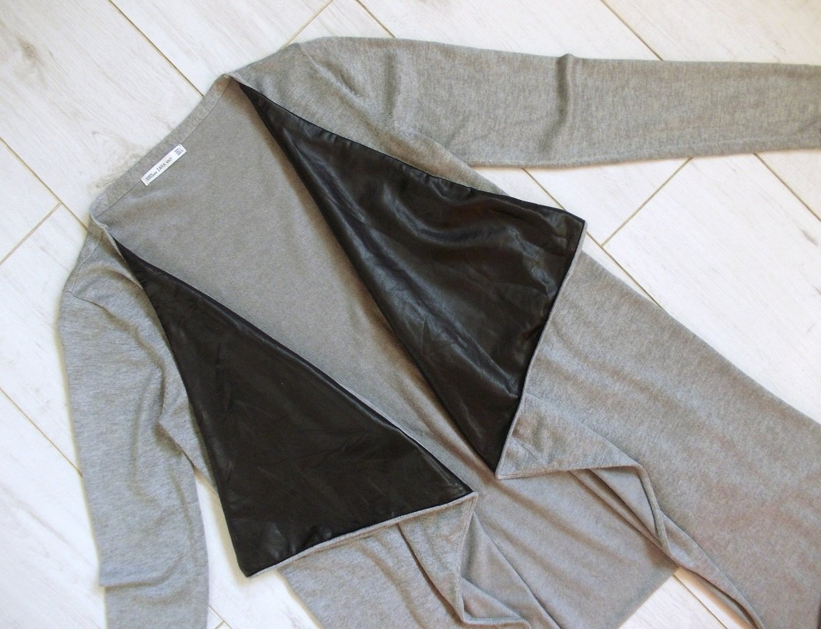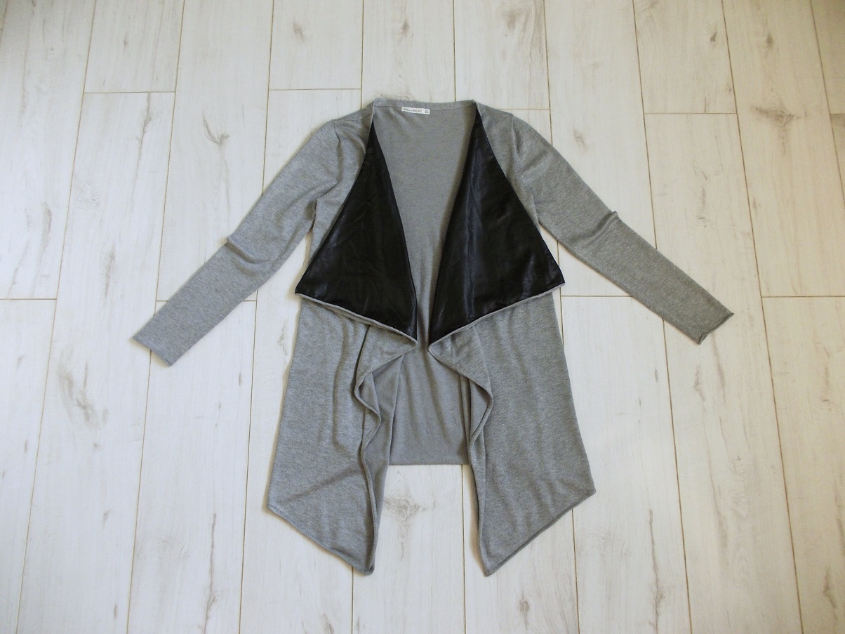 Ponúkam tento kardigan zn. Zara, svetlosivej farby, svetríkový materiál, výrazný koženkový golier, bez zapínania, v perfekntom stave bez žmolkov, veľkosť uvádzaná L ale skôr sedí na veľkosť S/M.