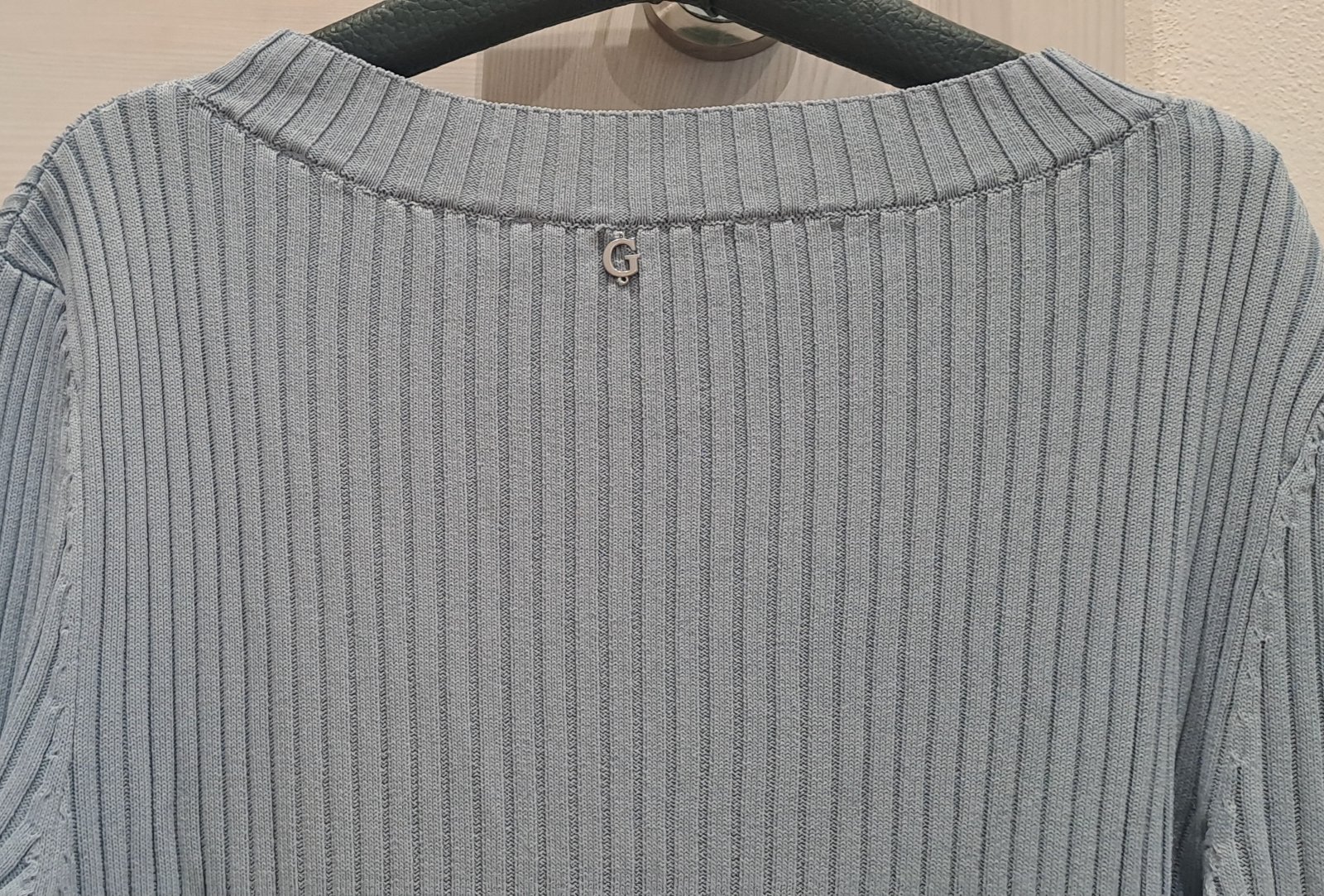 Pekný svetrík šedomodrej farby. Zaujímavé prepracovanie. Na chrbáte detail "G". Materiál elastický.