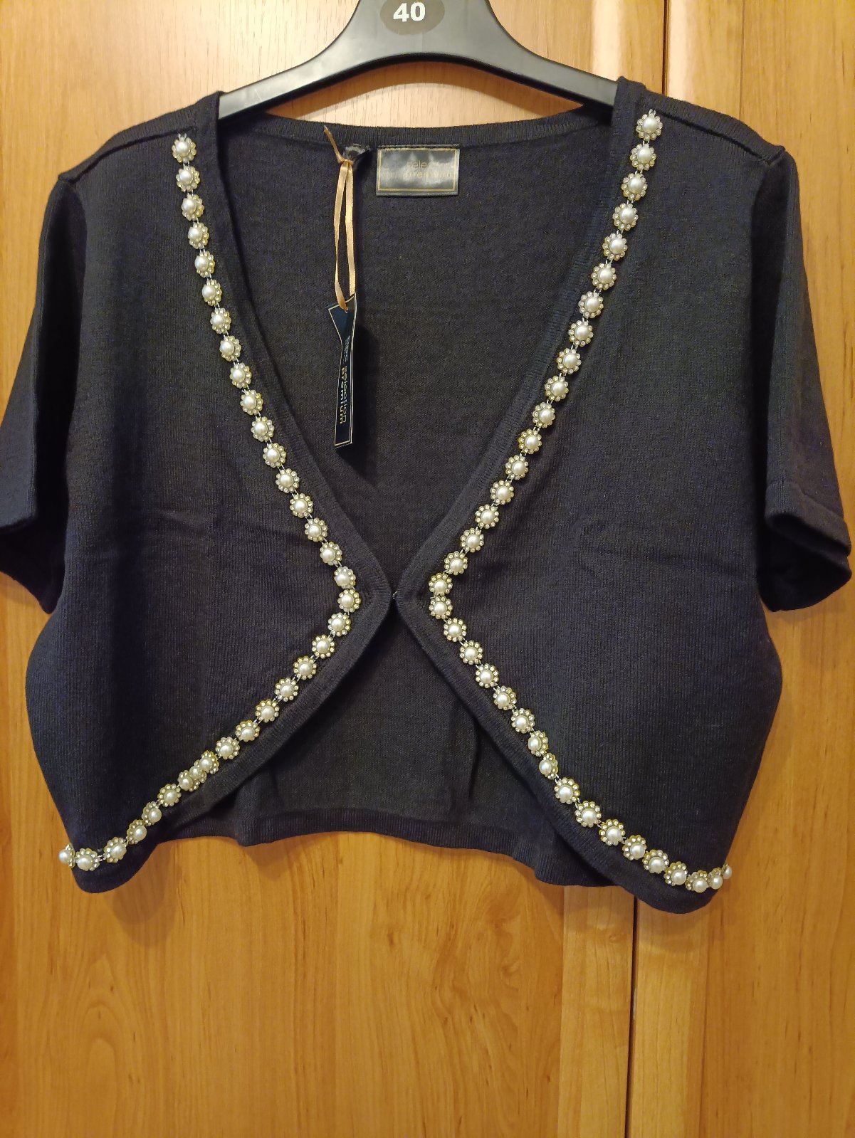 nenosené bolerko s visačkou, veľkosť 40/42, šírka pod pazuchou 53 v kľude, natiahne sa na 62, dĺžka 42, kamienky sú zo spodu žlté, tak hádžu aj strieborný, aj zlatý odlesk
