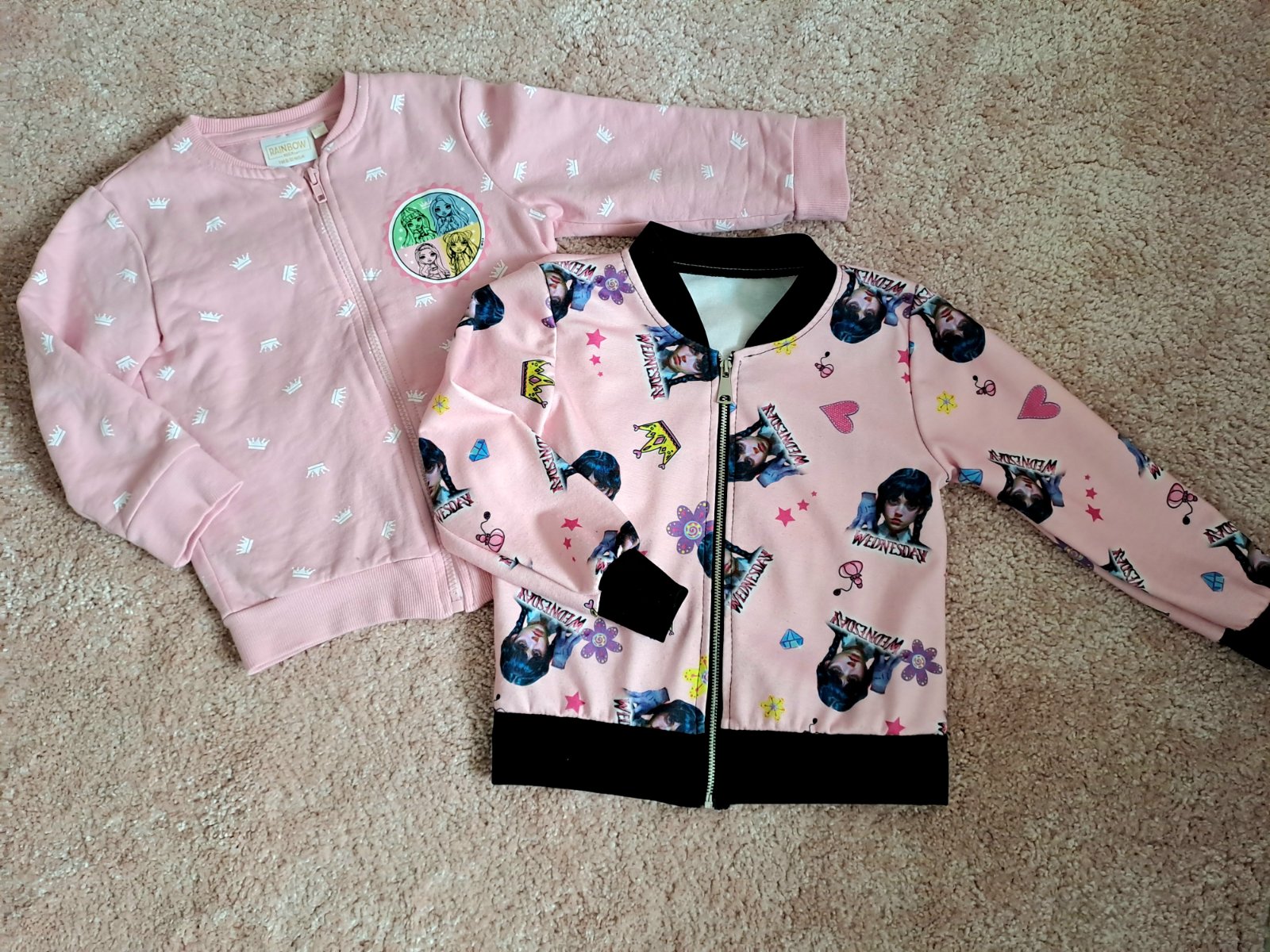 Pekné mikinky pre dievčatko. V peknom nosenom stave. Jedna mikinka s motívom Rainbow, druhá s motívom Wednesday.
