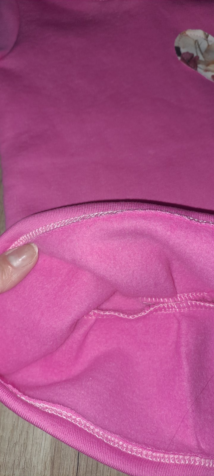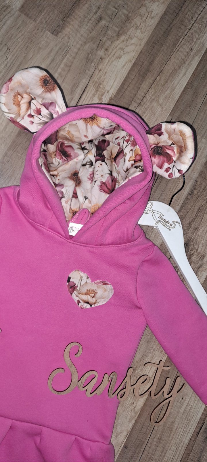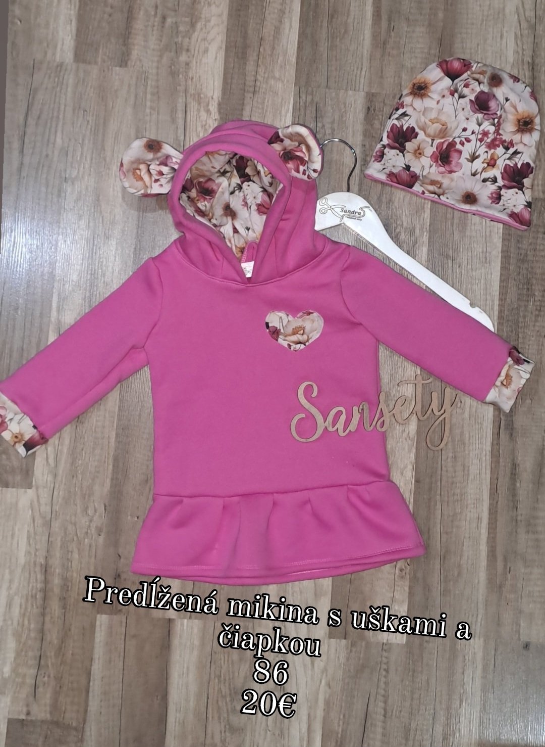 Dlhšia mikina z počesanej teplákoviny, teda hrubšia, s uškami na kapucni a čiapkou. Cena spolu