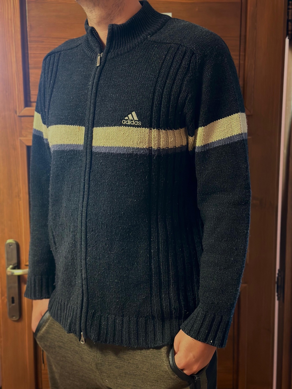 Teplý, pletený pánsky sveter na zips od značky Adidas, ideálny na chladnejšie dni. Má vysoký golier, zapínanie na zips po celej dĺžke a decentný logo nápis Adidas na hrudi.