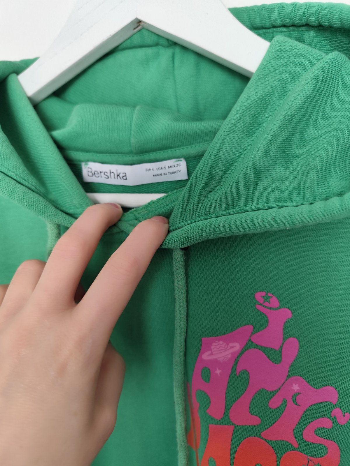 Bershka zelena mikina, stav ako na fotke, vel.S, mali biely fliacik vlavo dolu na obrazku