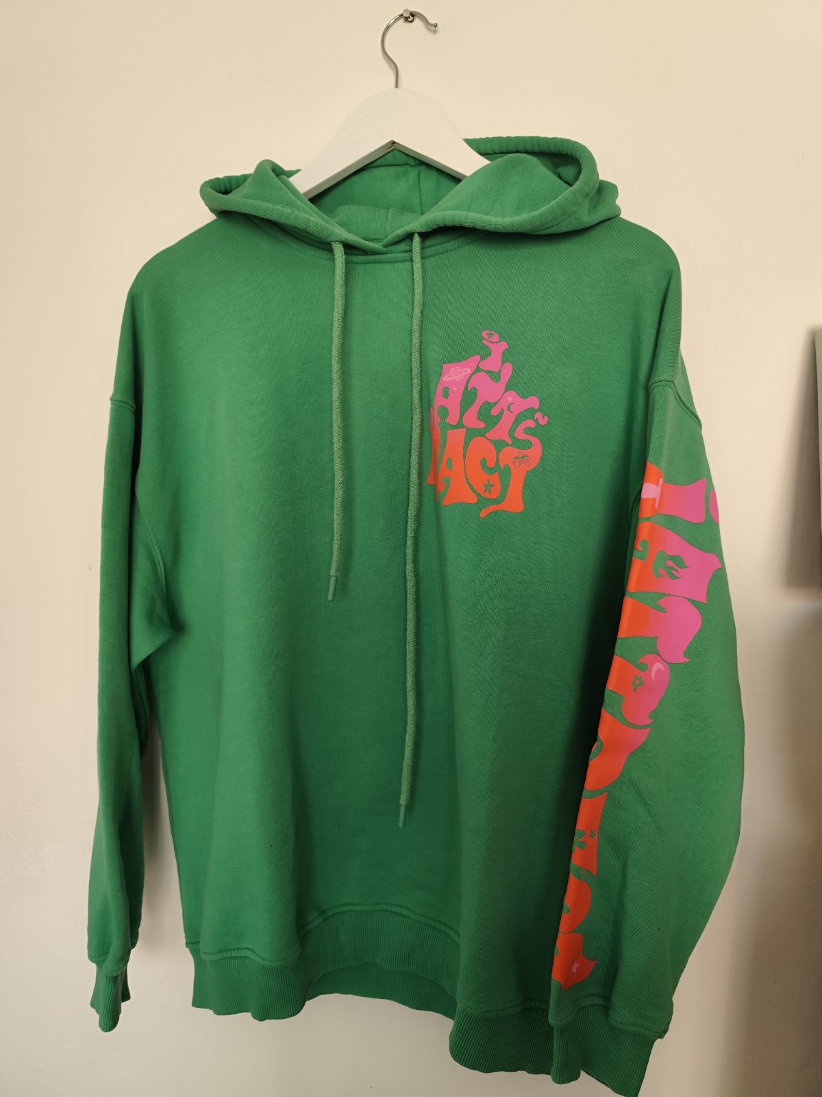 Raz oprana, oversize crop dĺžka, zelená s plastickými písmenami, veľkosť S, sedí až po L, šírka pod pazuchami 54 cm, dĺžka 45 cm