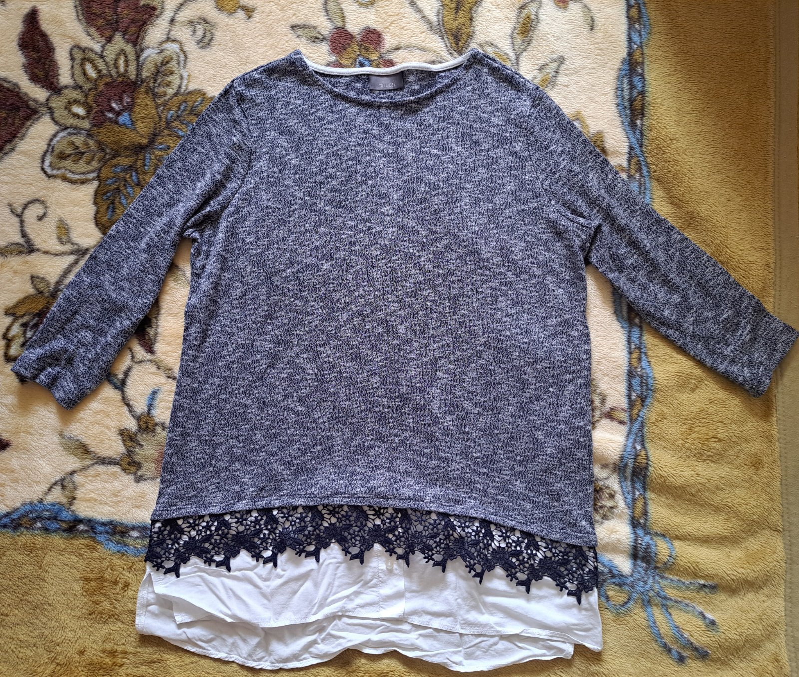 Tenší elastický pulóver s blúzkovou vsadkou velkost píše S ale sedí na L. Šírka 51 cm