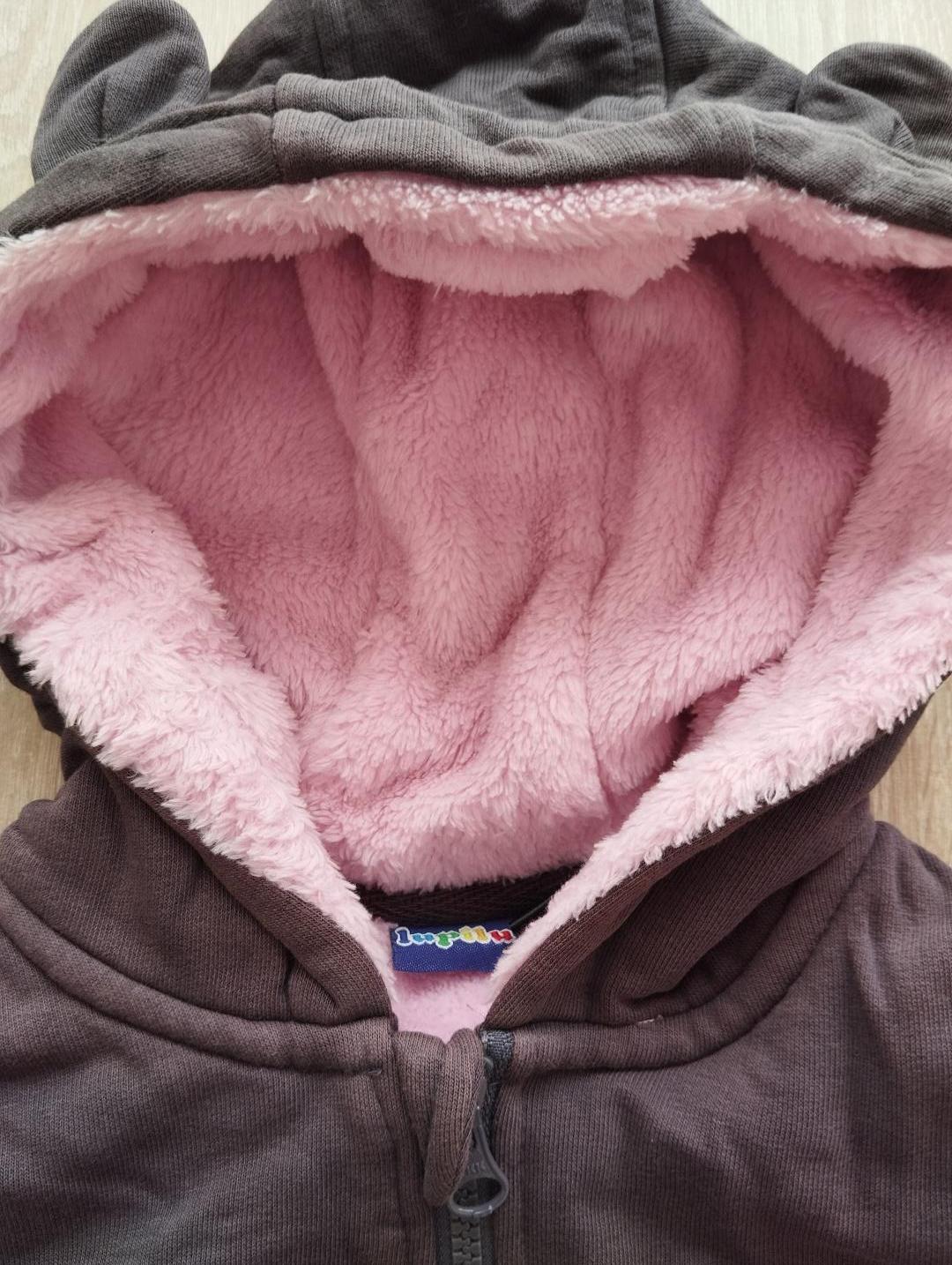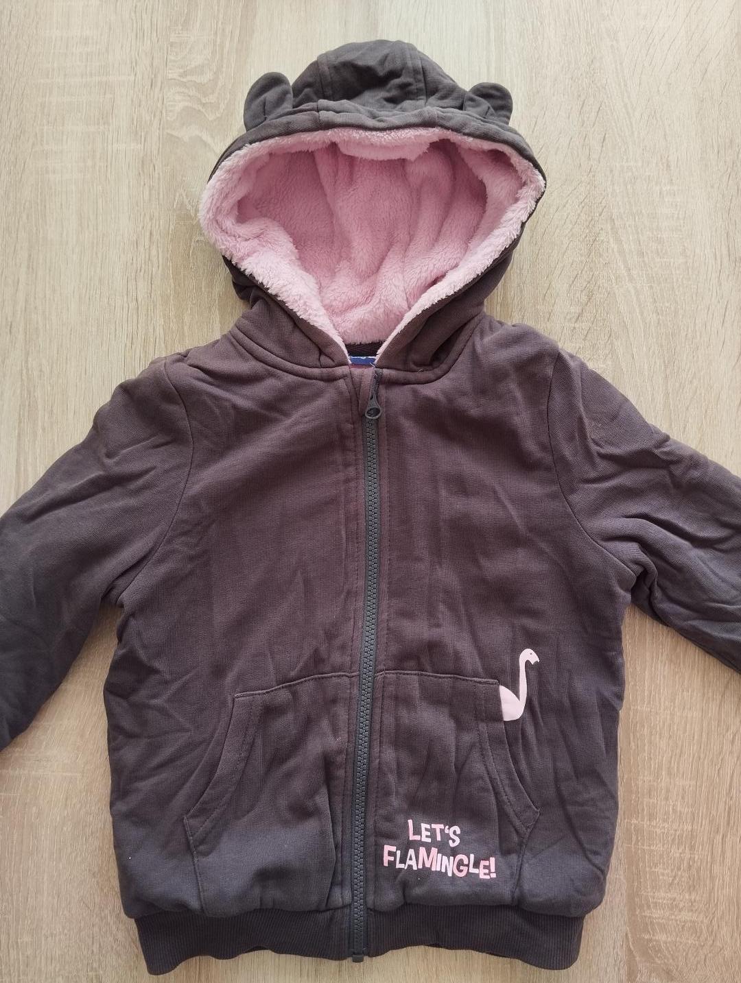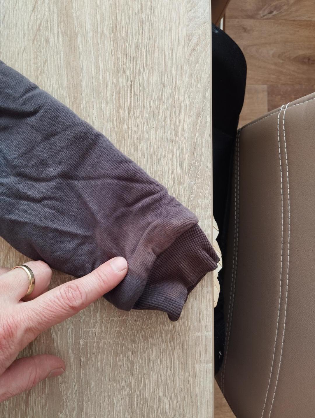 Hrubá zvnútra zateplená flísom mikinka. Na rukáve vyblednutý fľak. Nie je to pri nosení veľmi vidieť, ale tak aj tak asi už len na doma.