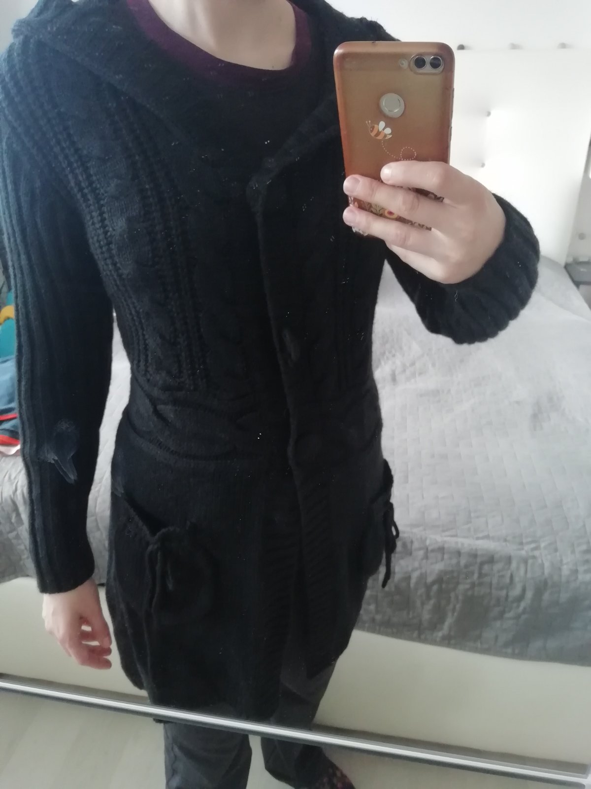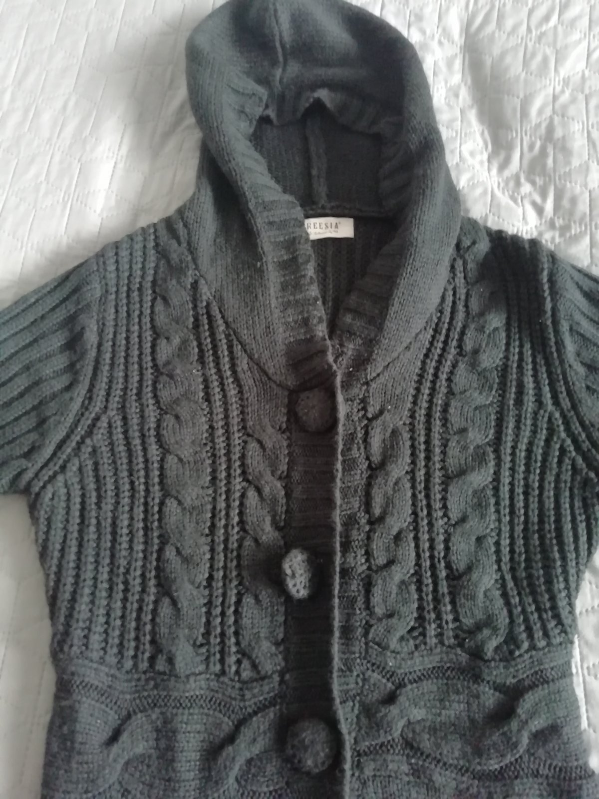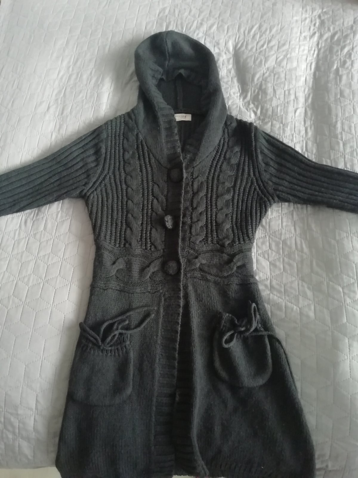 Predám dlhý sveter na gombíky s kapucňou, dĺžka je nad kolená a číslo nie je uvedené, ale odhadujem S/M pokiaľ bude treba zmeriam.Je bez závad.