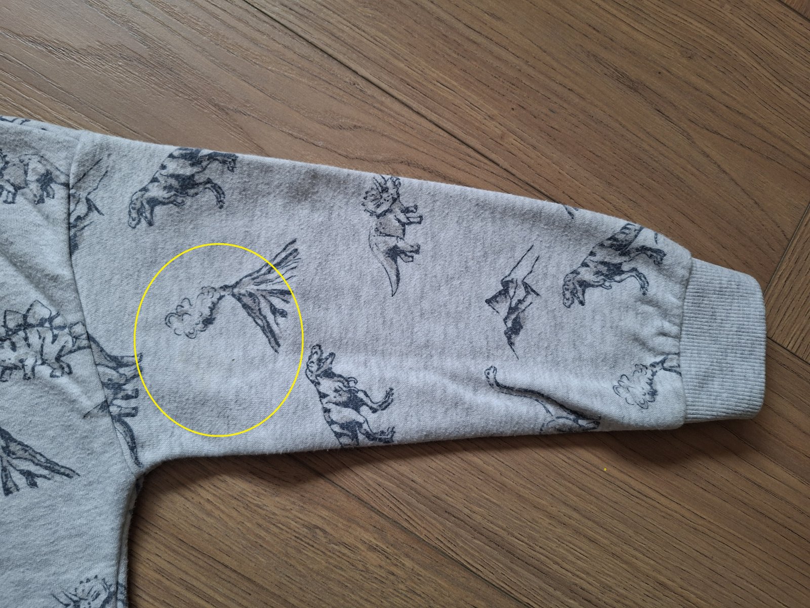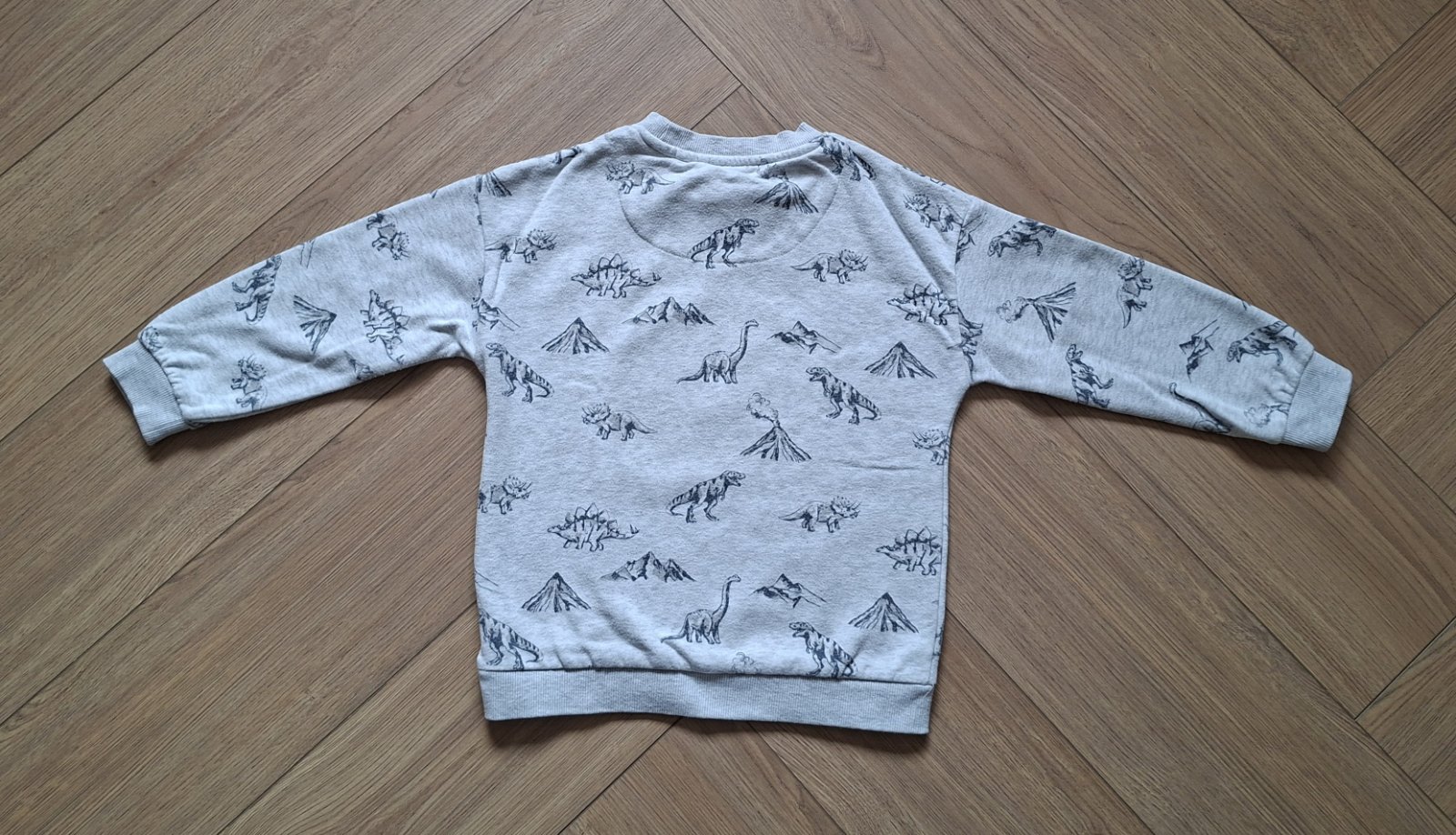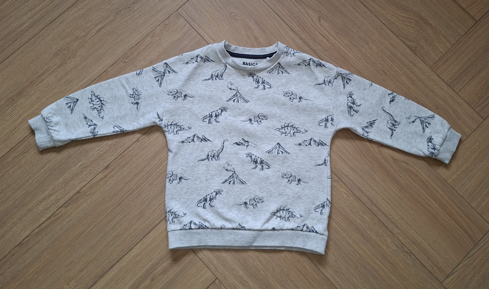 Tepláková mikina s motívom dinosaurov vo veľmi dobrom nosenom stave (jemne spratá; na ľavom rukáve je sotva viditeľný fliačik (detail viď foto č.3)). Obliekanie cez hlavu, bez odopínacích patentov. Značka: Tesco; veľkosť: 116 (5 - 6 rokov).
