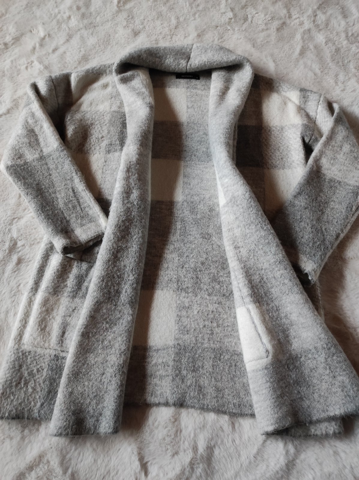 Hrubý upletovy materiál, bez zapínania s dvoma prednými vreckami, nosený, vidno chlpok po praní.
