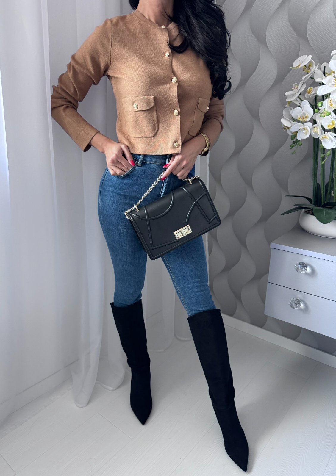 Krátky sveter z hustého úpletu s okrúhlym výstrihom a zapínaním na guľaté gombíky. Náprsné vrecká s chlopňou a gombíkom, dlhé rukávy a rovný spodný lem.