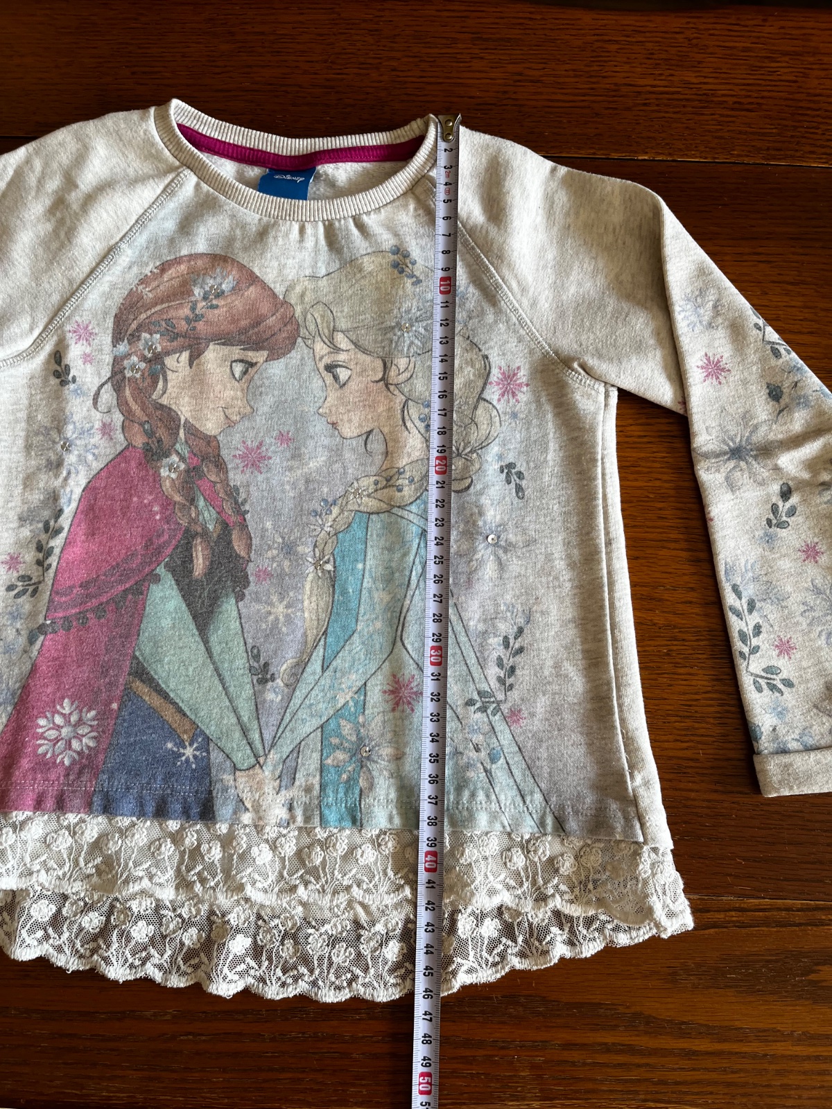 Vpredu veľká aplikácia sestier Anny a Elsy z Disney rozprávky Frozen Ľadové kráľovstvo. Na rukávoch celoplošne vzory s motívom tejto rozprávky. Vo vlasoch majú sestry našité strieborné flitre ako kryštáliky ľadu.