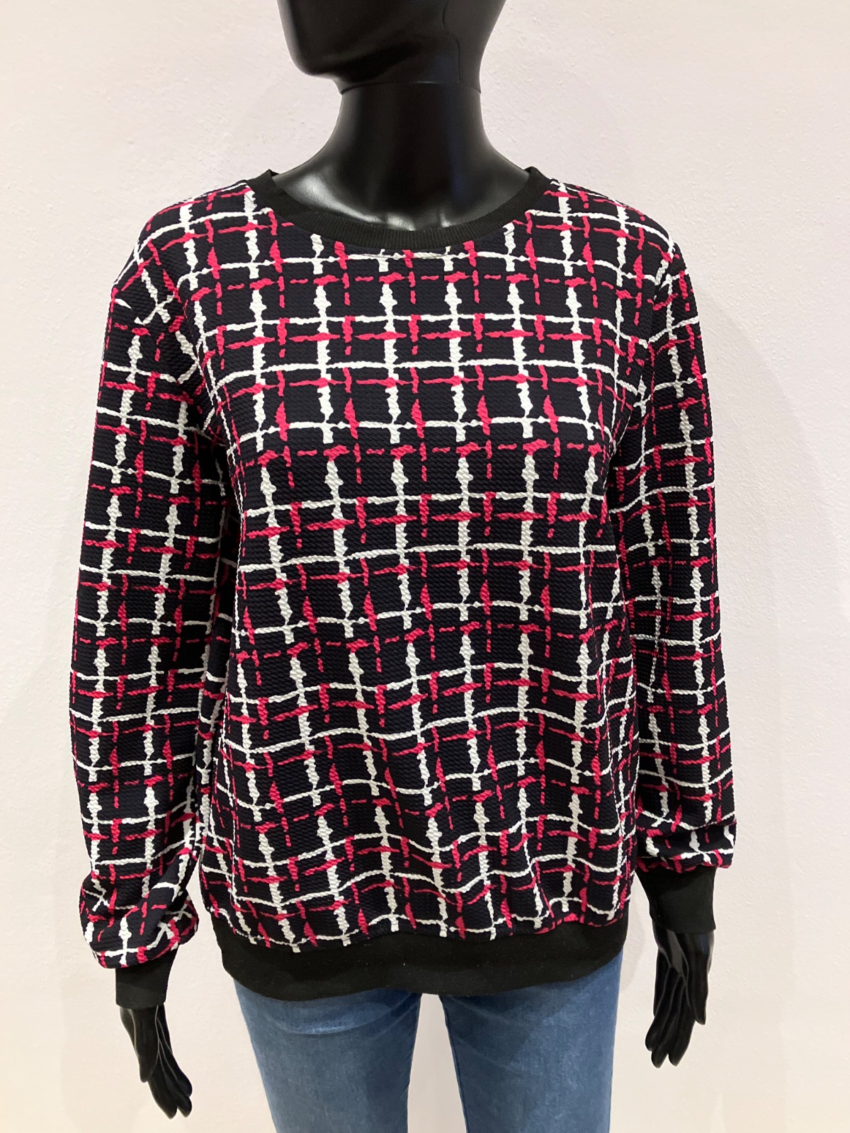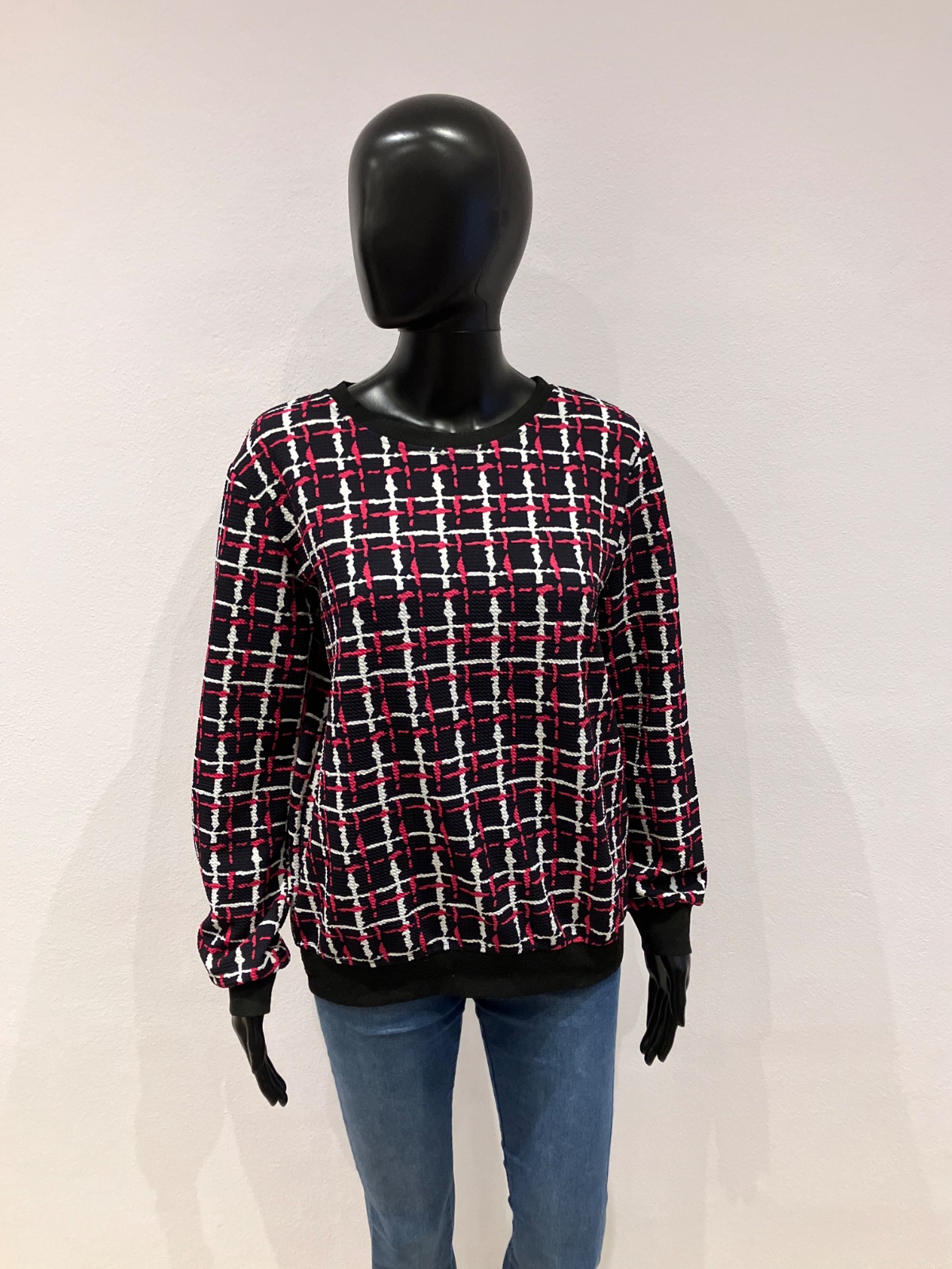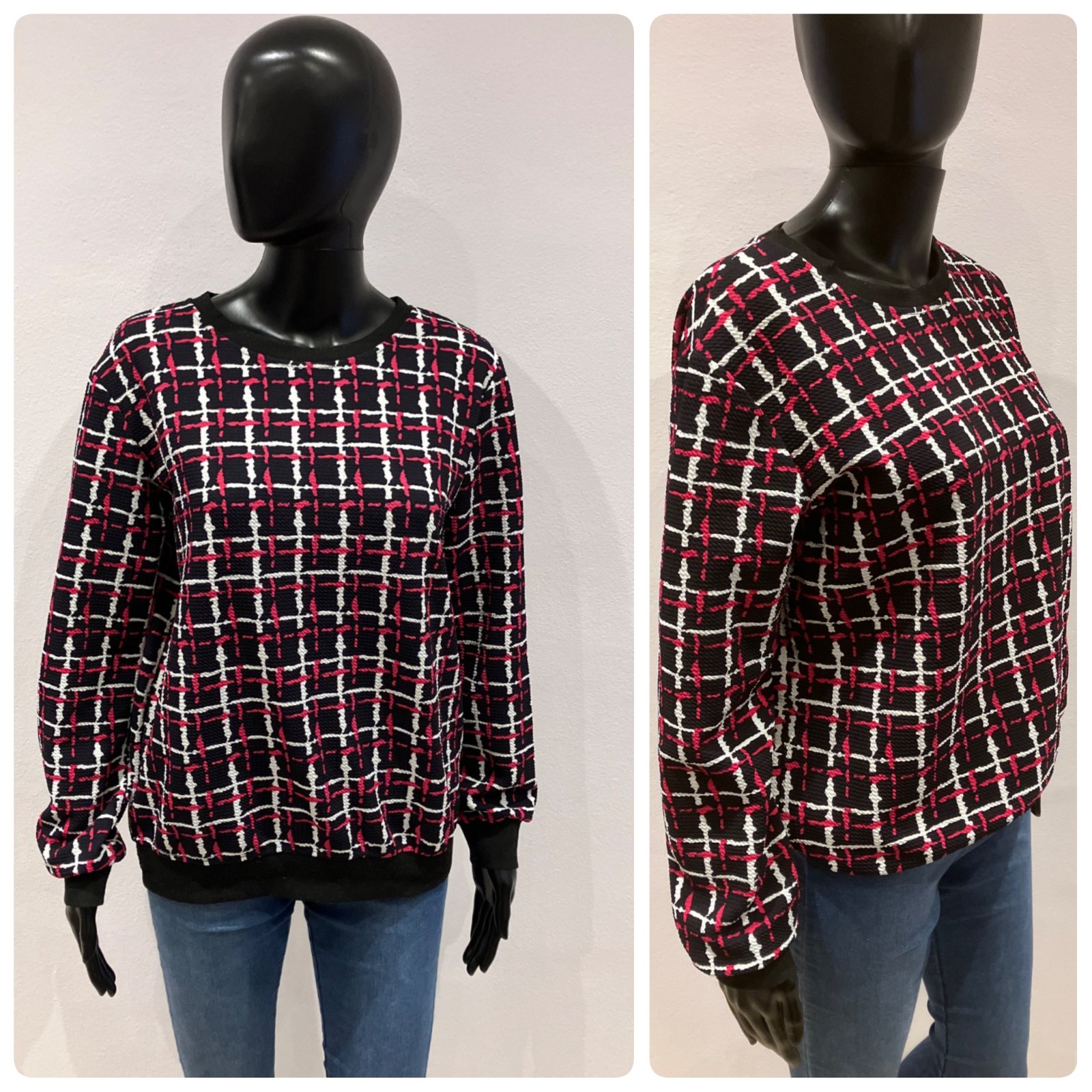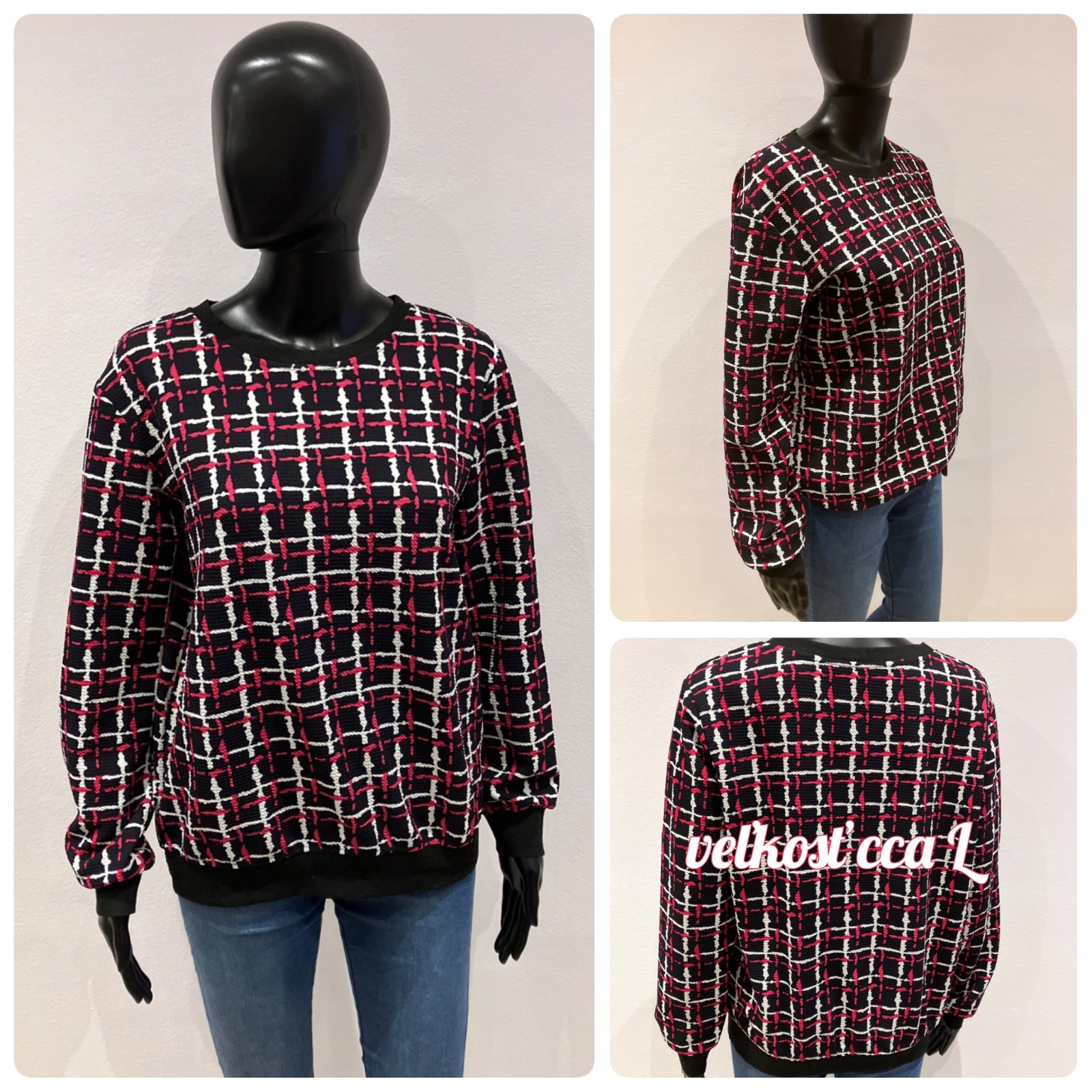 Dámska vzorovaná mikina, elastická, tenšia, farba čierno-tmavoružovo-biela, materiál 65%polyester 35%bavlna. Veľkosť cca L.