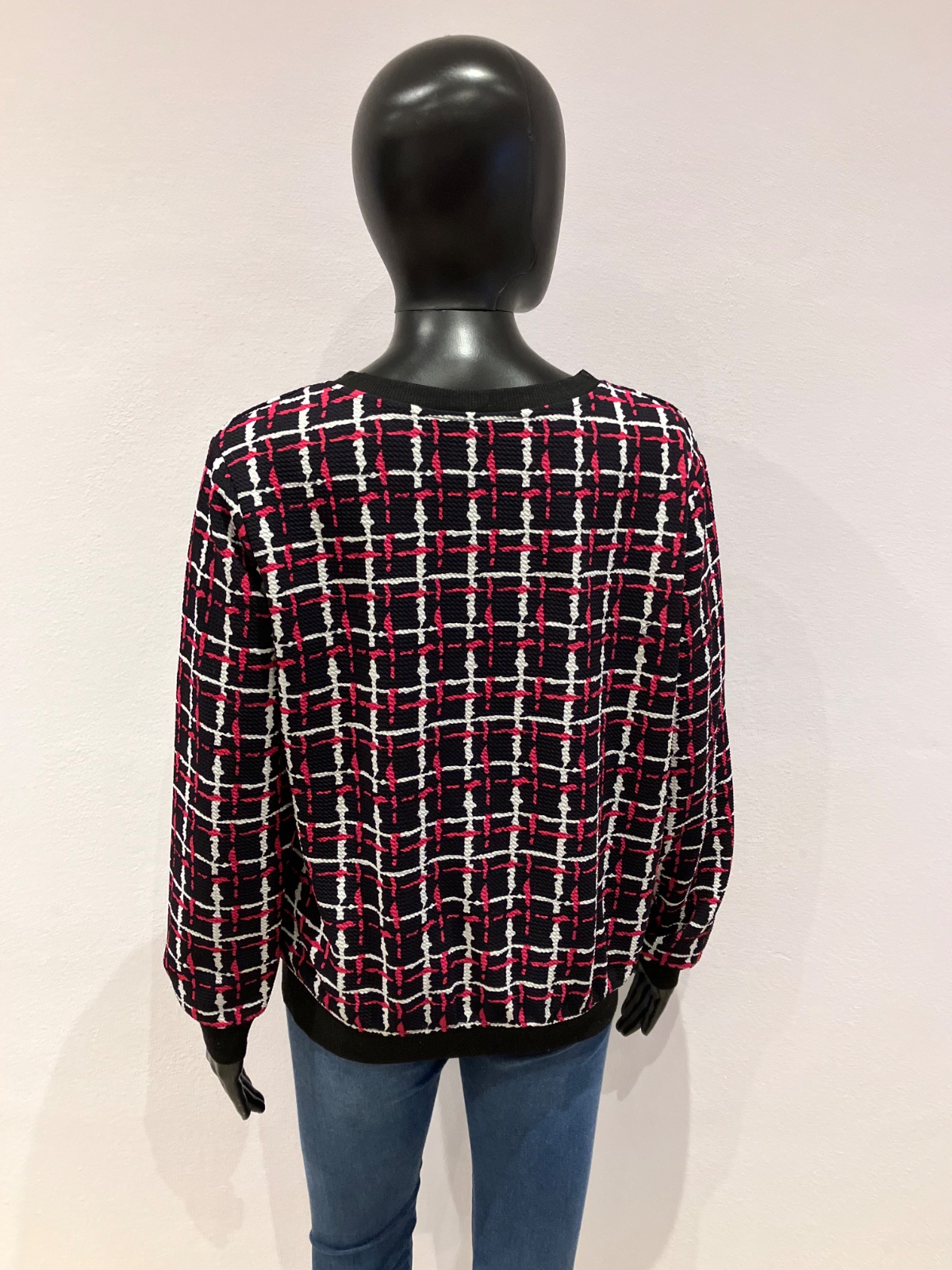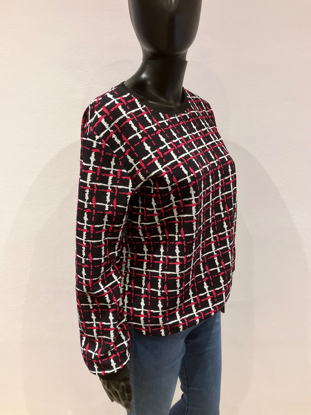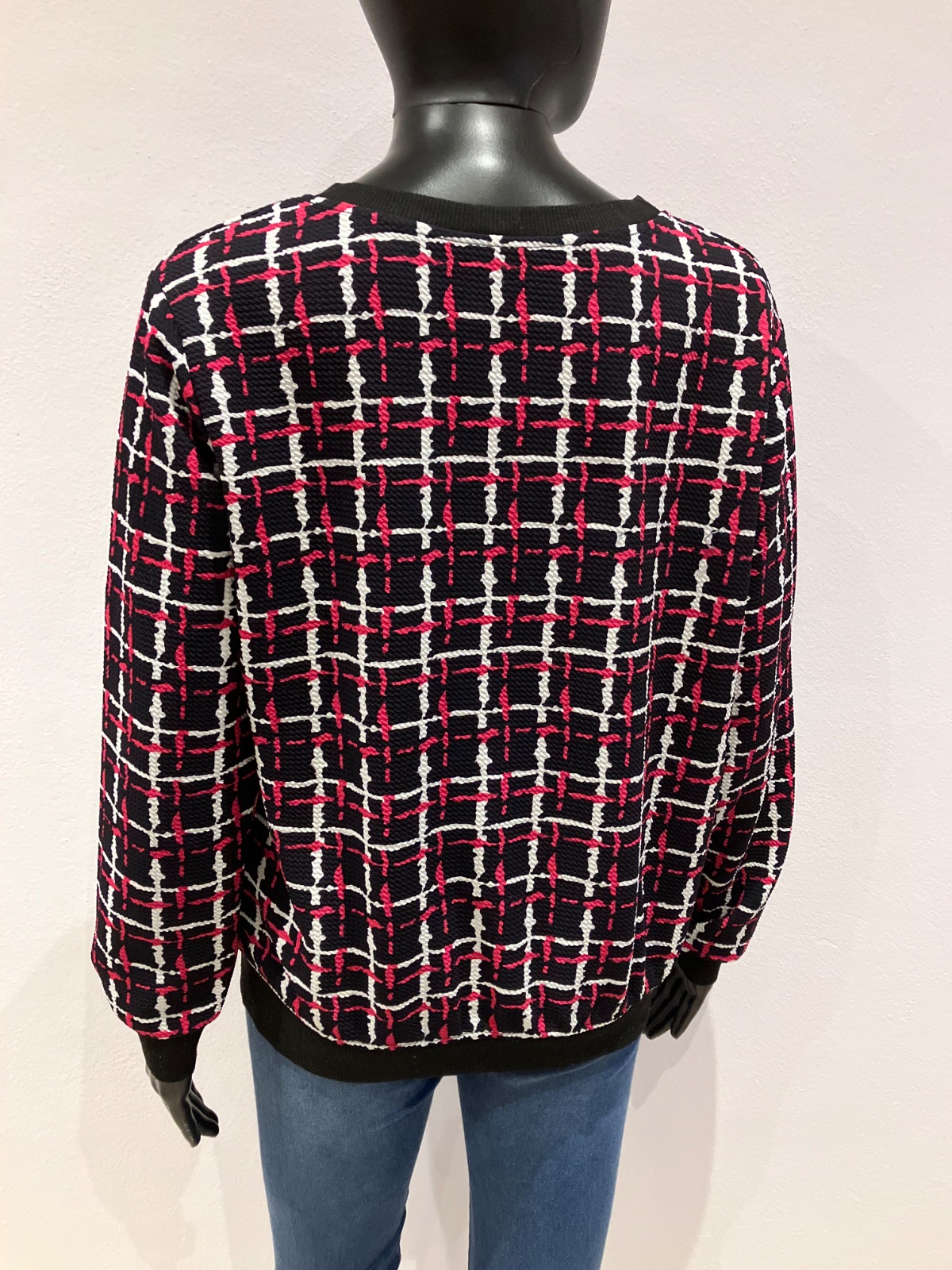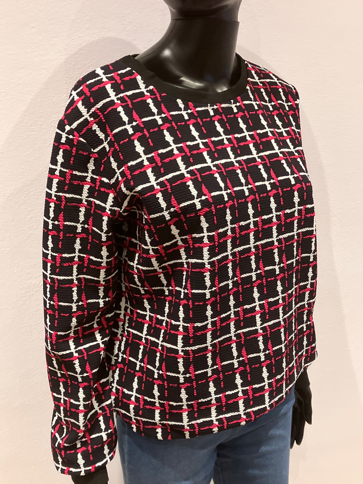 Dámska vzorovaná mikina, elastická, tenšia, farba čierno-tmavoružovo-biela, materiál 65%polyester 35%bavlna. Veľkosť cca L.