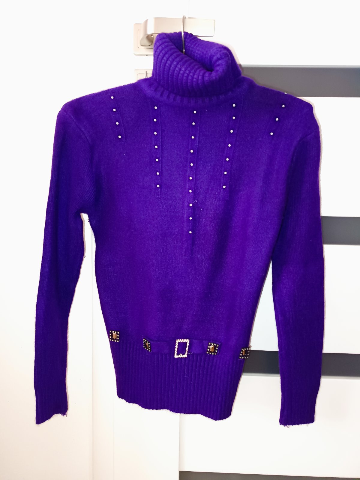 Fialový rolák v bezchybnom stave bez známok nosenia. Veľmi prispôsobivý, super materiál. Dĺžka - 58 cm, šírka - 44 cm až 50 cm, rukáv od pleca - 61 cm. Píšu na ňom veľkosť 170 , sadne na veľkosť S.