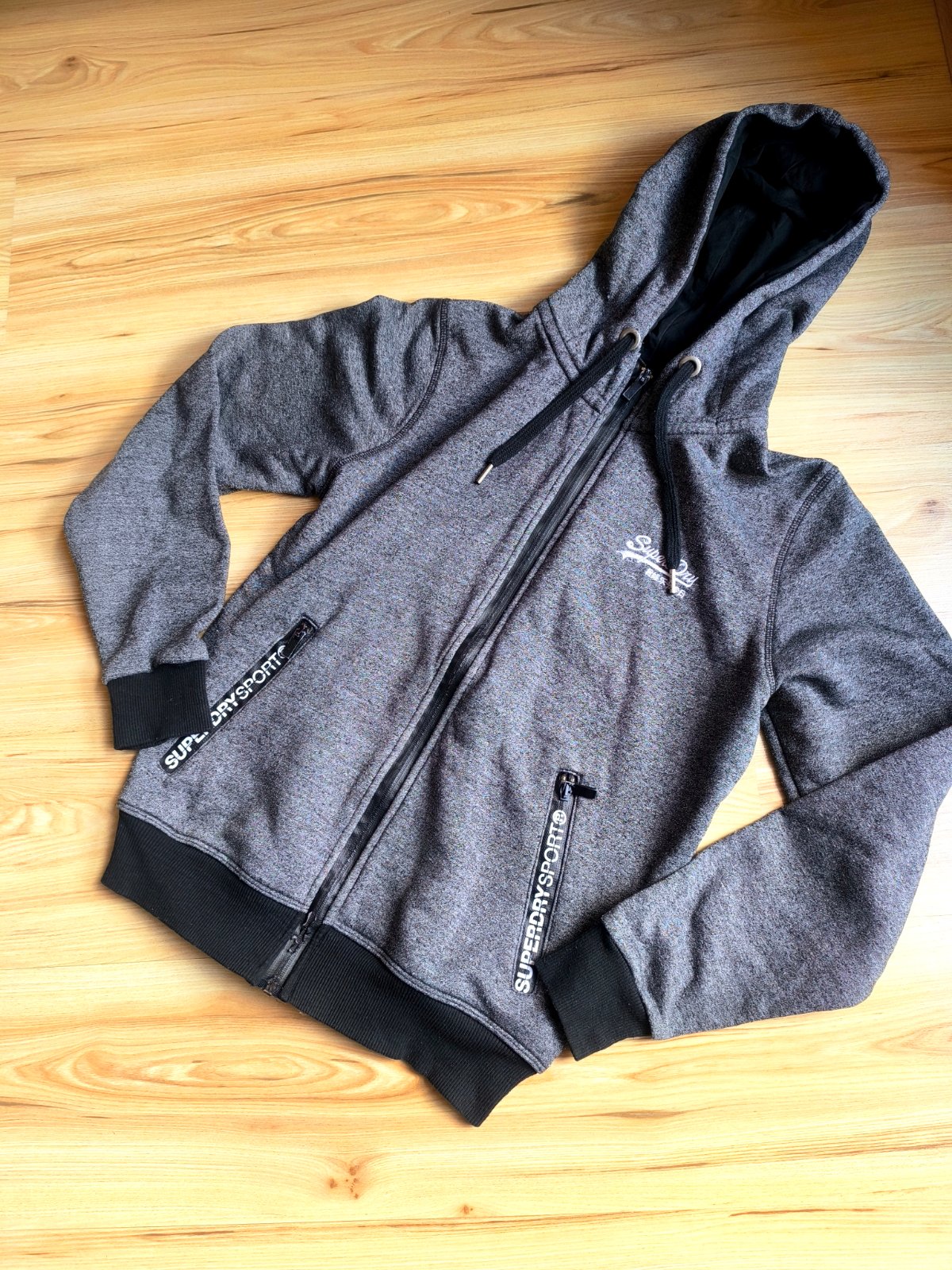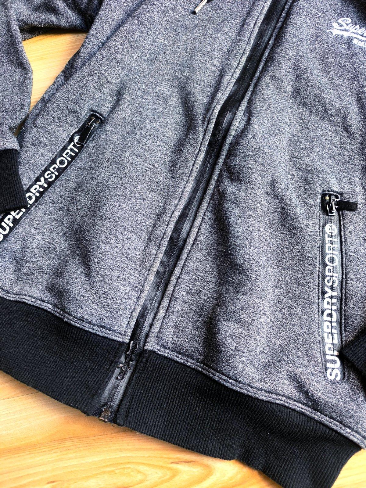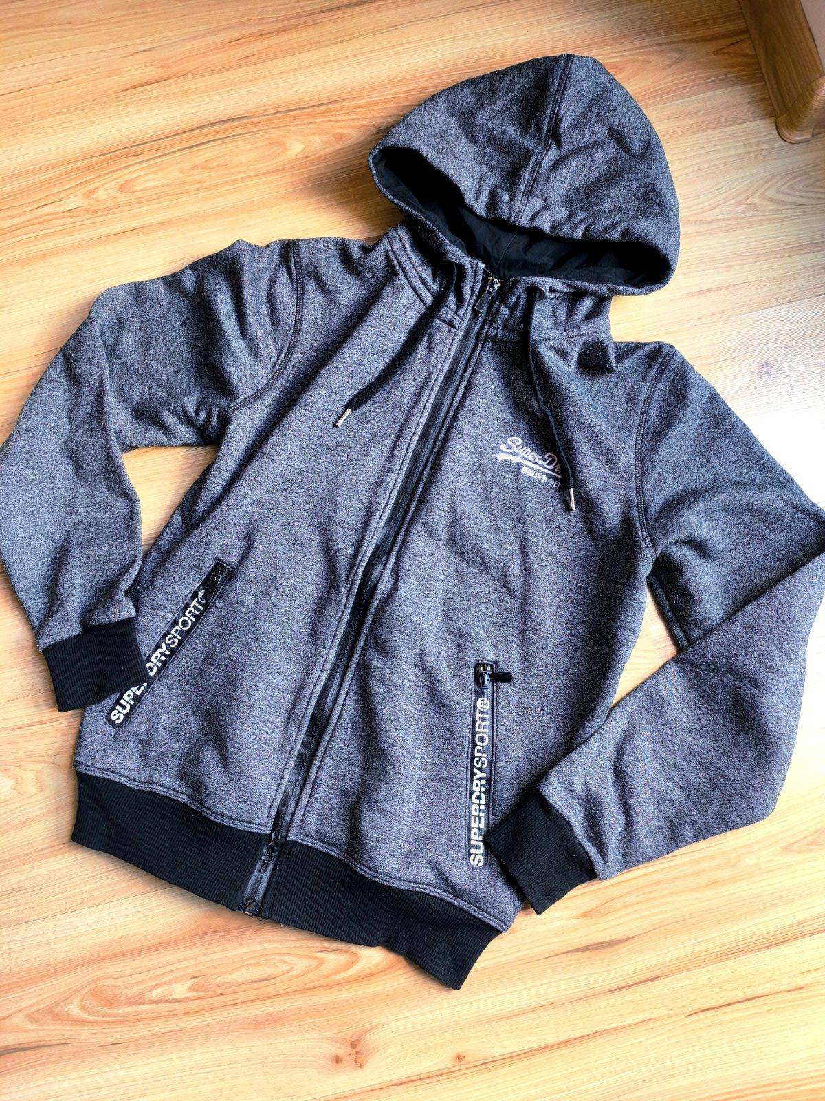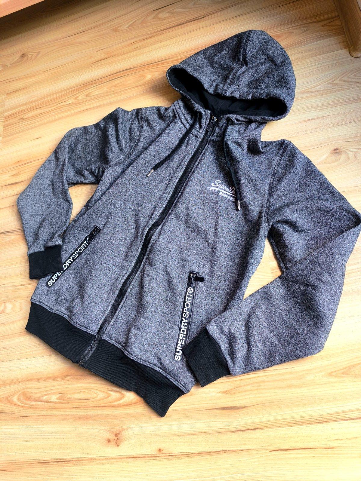 Pánska tmavo šedá mikina zn. Superdry, sedí na S, M. Zvnútra mierne zateplená, 100% bavlna. Nosená, veľmi dobrý stav, len ošúchanie na zipse a na lemoch okolo zipsu (viď detailné foto).