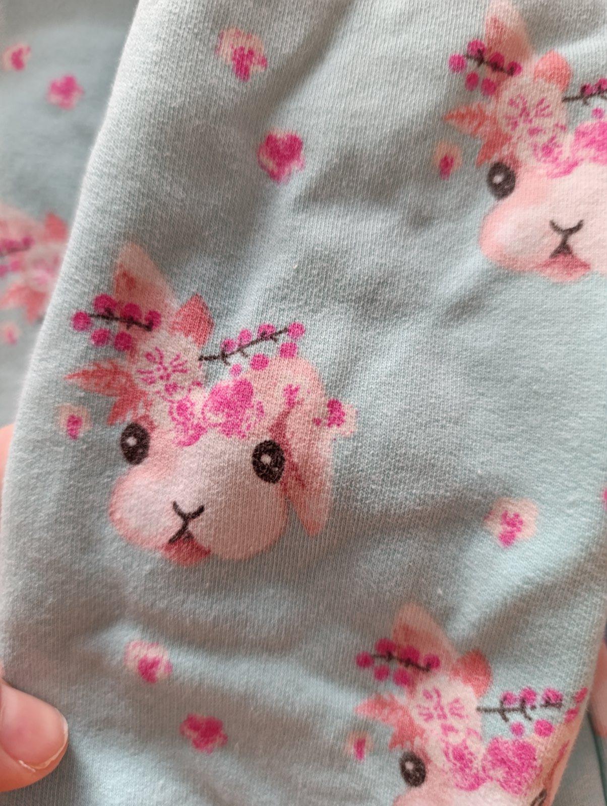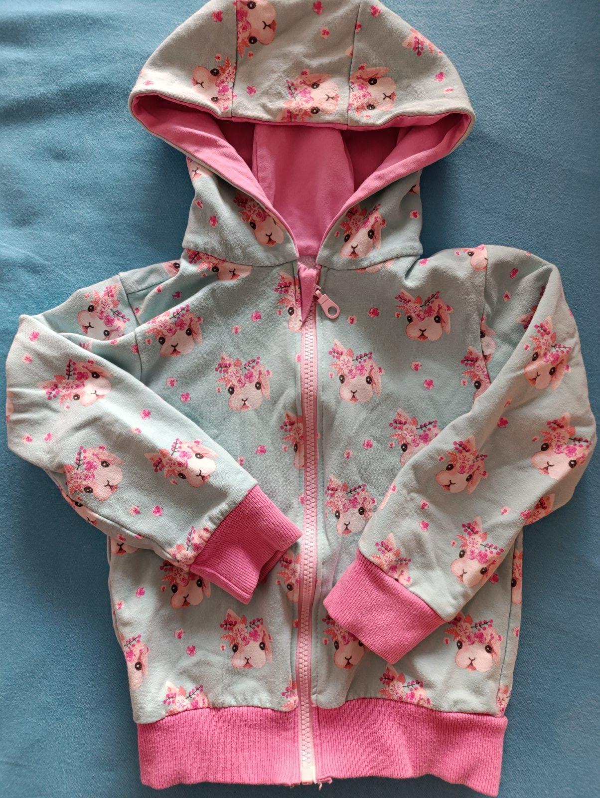 Krásna mikinka so zajačikmi Zn. Colour boom - šitá podľa zadania, druhá taká neexistuje, materiál som si vyberala sama, veľkostne sedí na 110 a je nositeľná aj dlhšie vďaka dobrému strihu. Mikinka nemá žiadne výrazné poškodenia - dierky ani fľaky, ale keďže ju dcérka naozaj milovala, je vidno, že je z prania vyblednutá, trocha žmolky - viď foto detialu. Stále podľa mňa vhodná aj do škôlky.
